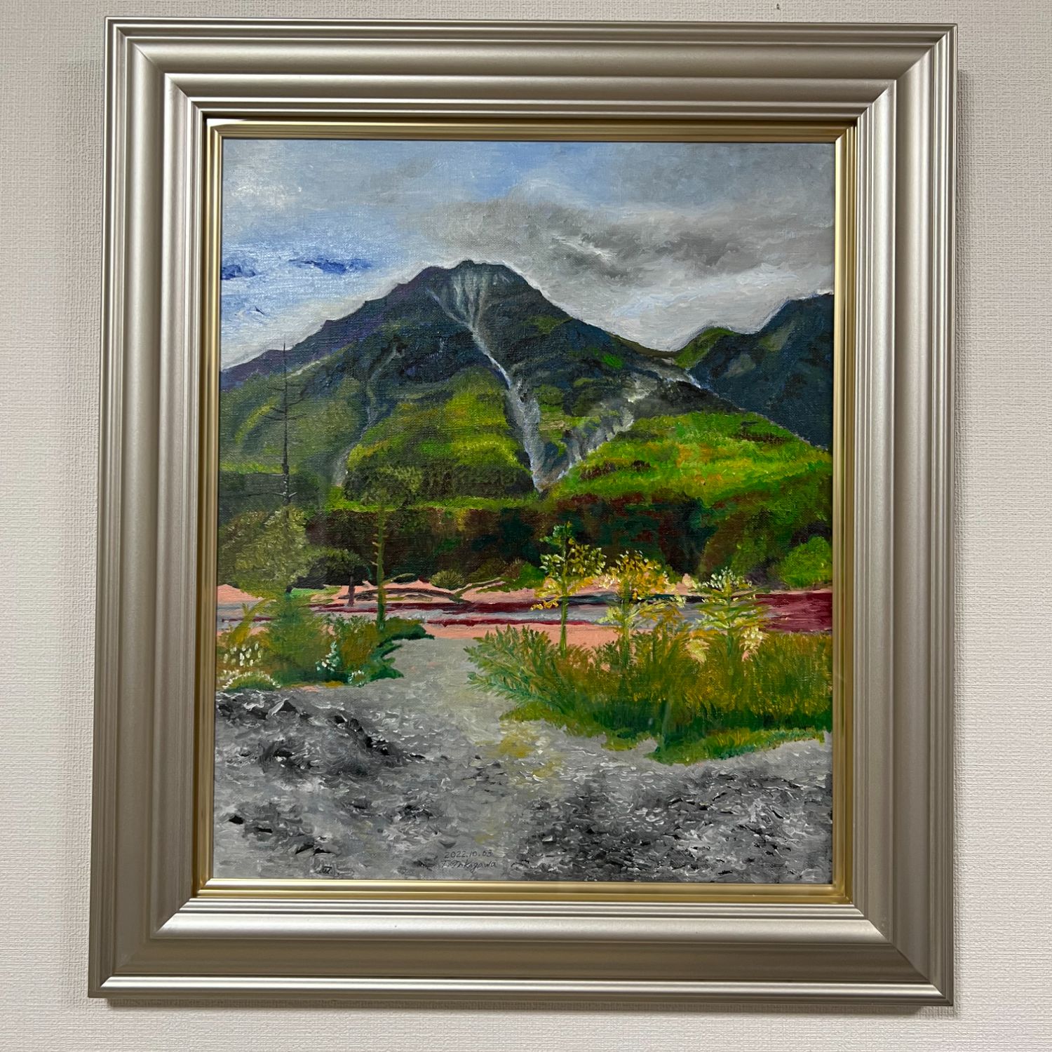 昨年2022年10月上高地へ行った時の焼岳です 午後1:30ごろでしたが 大正池から見た焼岳が 好きでスケッチをして油絵にしました。額縁が明るいのでいい感じになりました。