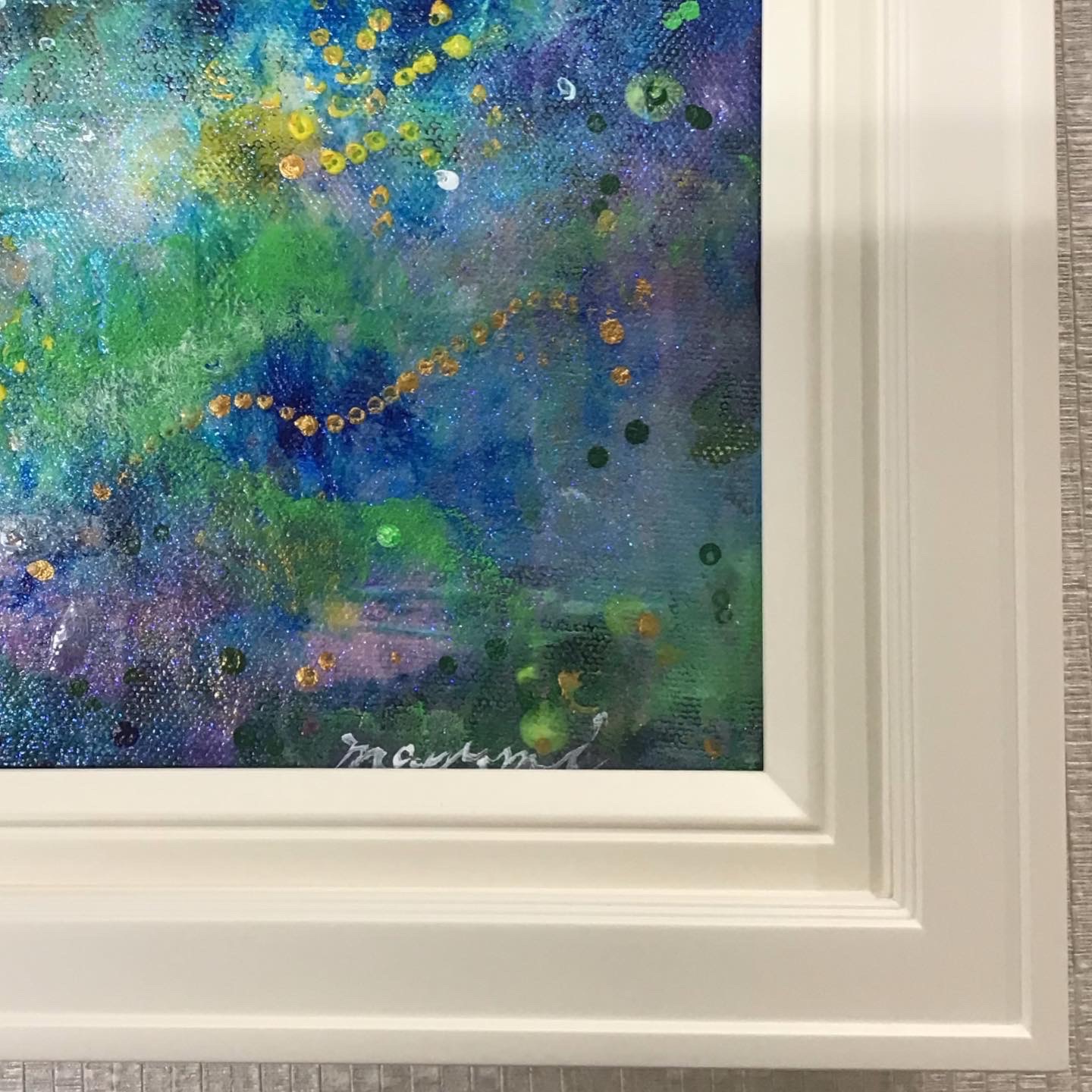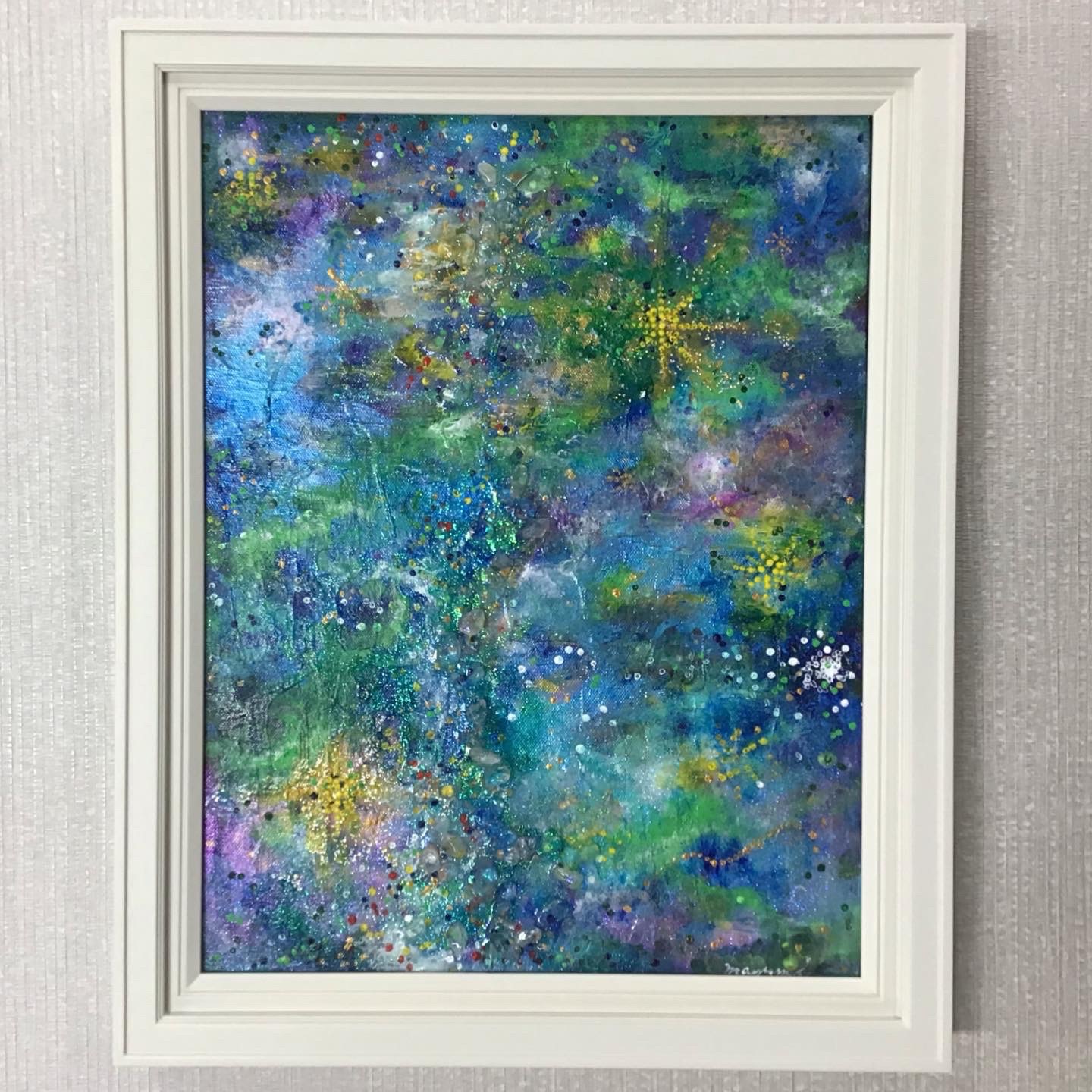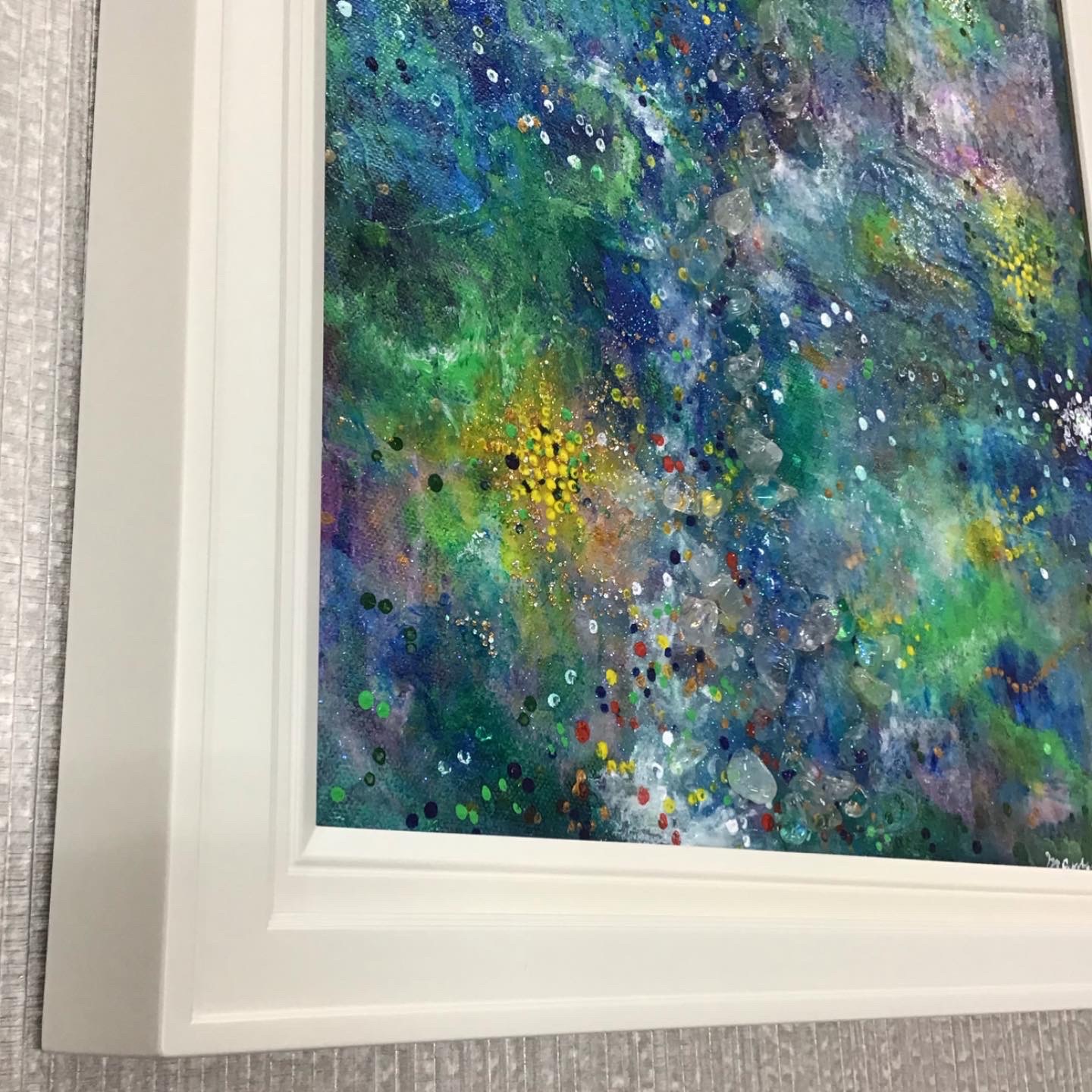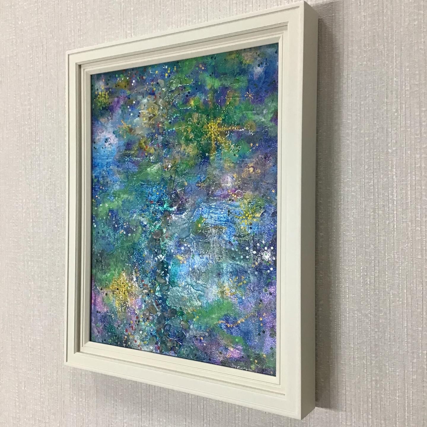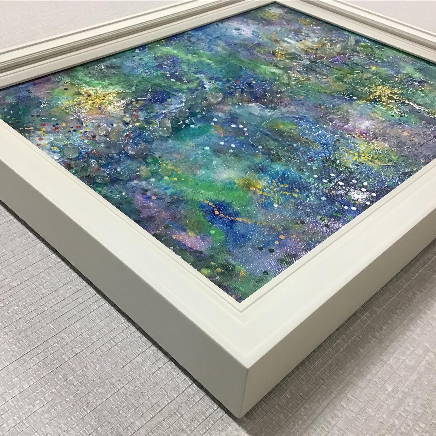 アクリル画を額装しました!青色がベースのアクリル画でキラキラと輝いています!一際輝くところに注目すると...まるで氷のような宝石のような透明な粒が表面から盛り上がっています! 使用したフレームは青が映えるように白のフレーム「7753 ホワイト F6」です!