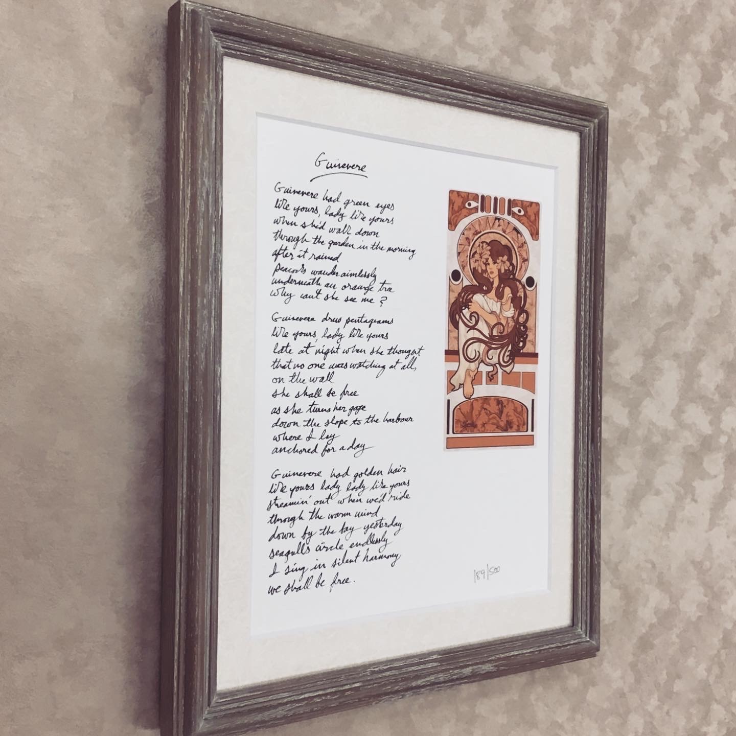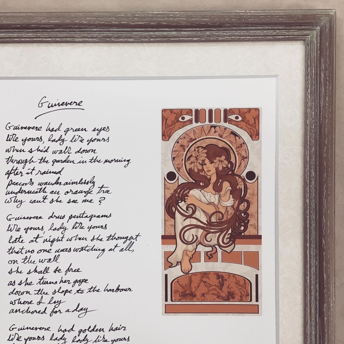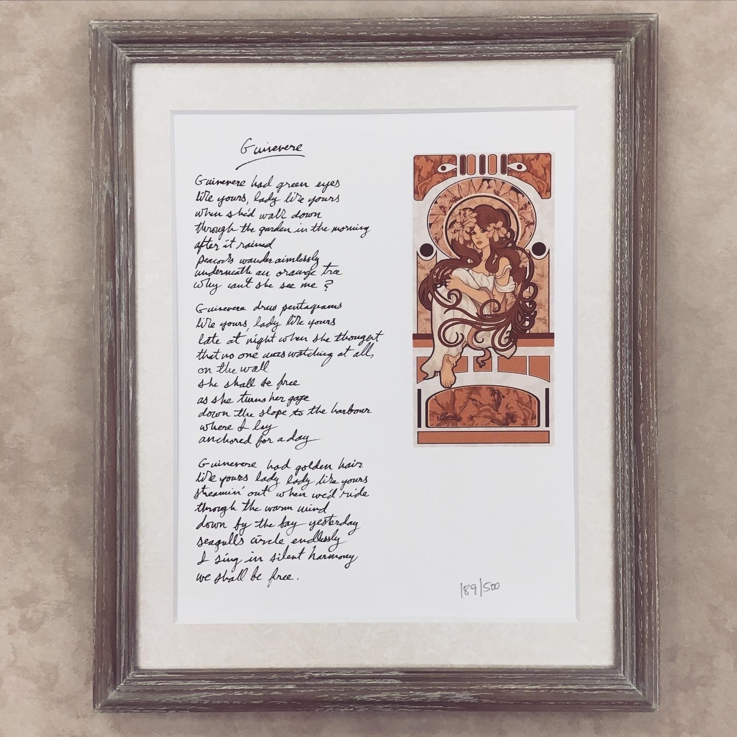 Crosby, Stills & Nash(クロスビー、スティルス&ナッシュ)が1969年に発表した楽曲「Guinevere」の歌詞が書いてある歌詞カードを額装しました! 右下に「189/500」とナンバリングされているということは世界に500枚あるうちの1枚ということでしょうか...!とても貴重な1枚です! 使用したフレームは「G型 グリーン 八ツ」(※廃番フレーム)、マットは少し模様のある白色マット(20101)です。
