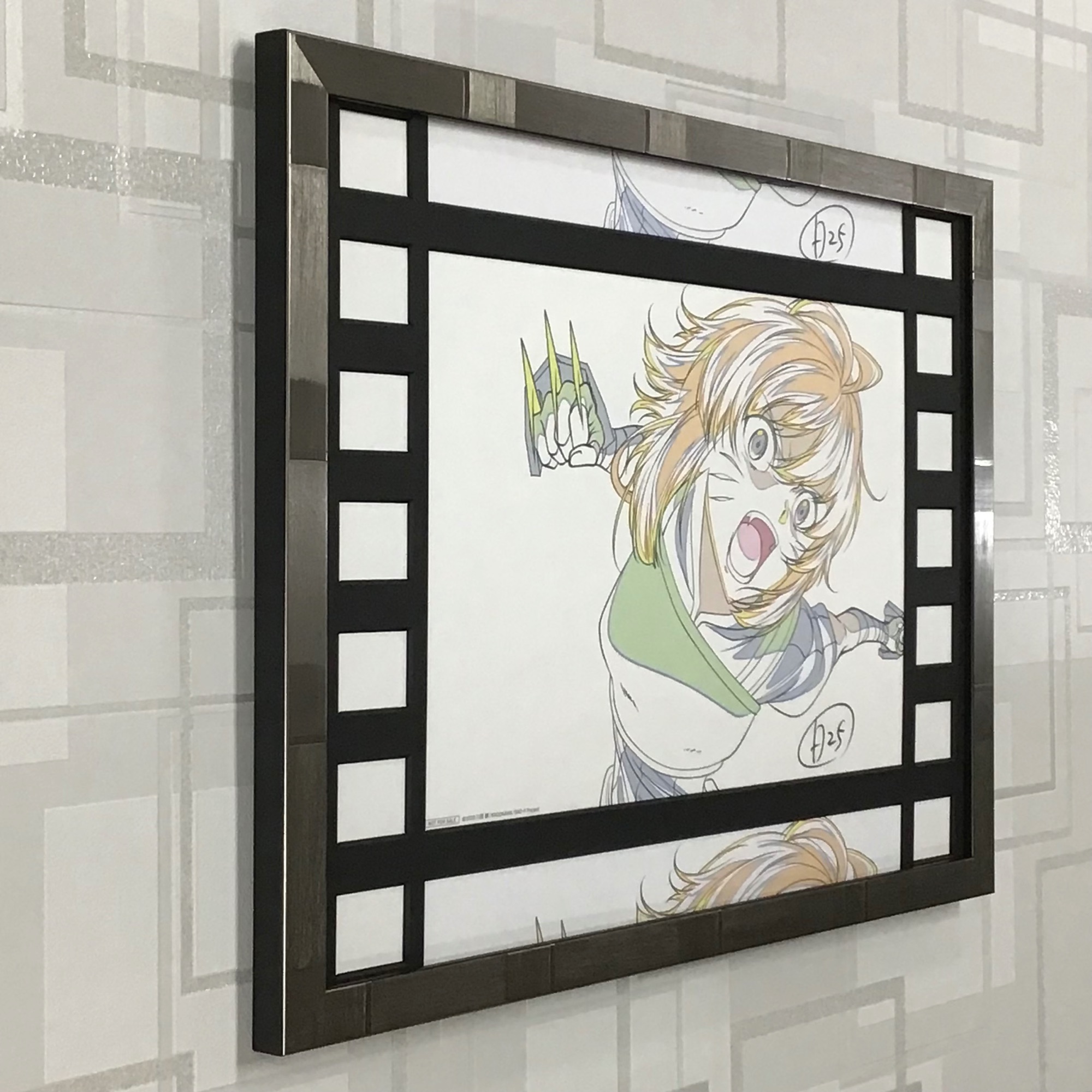 大人気のメディアミックス作品【ソードアート・オンライン】 その本編の前日譚である【ソードアート・オンライン-プログレッシブ-】の劇場作品である【冥き夕闇のスケルツォ】の来場者特典を額装しました。 今回額装したこちらの複製原画は、劇中でも特に印象的な「情報屋のアルゴが叫びながら渾身の一撃を放つシーン」のものです。 映画の特典であるため、上下左右に大小の窓を複数を空けることで「上映フィルム」を再現したデザインにしてみました。 上映フィルムをイメージして、マットは凹凸のない黒色で、断面も黒色の「黒芯」を選びました。 連続したシーンを表現したいとのご希望でしたので、上下の細い窓にお持ちいただいた複製原画のカラーコピーをカットして嵌め込みました。 さらに、硬質的な金属光沢のある細身のフレームをチョイスしたことで、一目で劇中のワンシーンが浮かぶとてもクールな仕上がりです。 ★使用した額は「06-6049R」、サイズは内寸402×297mm、マットは「黒色黒芯(10199)」です。