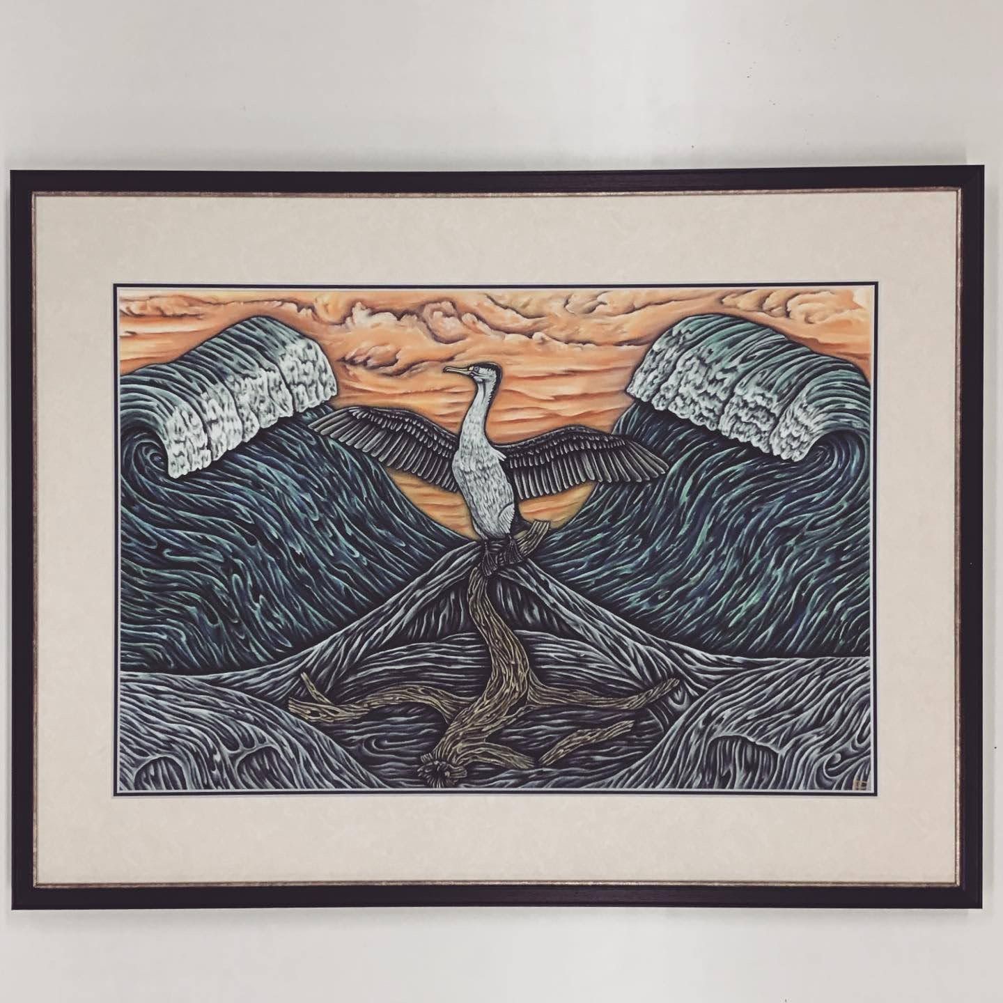 誇らしく翼ををひろけた海鳥の絵です。空の色がオレンジに染まり、地球の自然の力強さも伝わってきます。 日本に滞在中お世話になったお礼にと、後日滞在した方のご家族が来日され、手描きの絵を手渡しでプレゼントしてくれたとのこと。 気持ちのこもった贈り物を、絵の色に合わせたフレームに額装しました。 額はMH-E45Jのブルー色、小全紙サイズ、マットは20101もみ紙白と布紙紺10004。 額の青もマットの紺も、温かみのある色合いです。 絵の中に凝らされたメリハリのある描線にあわせ、ダブルマットの間隔は少し太めにお作りしました。 #イラスト #海鳥 #荒波 #高波 #自然 #環境 #自然環境 #ダブルマット #MH-E45 #マットカット #Wマット #海 #オレンジ #夕焼け #朝焼け #夕焼 #朝焼