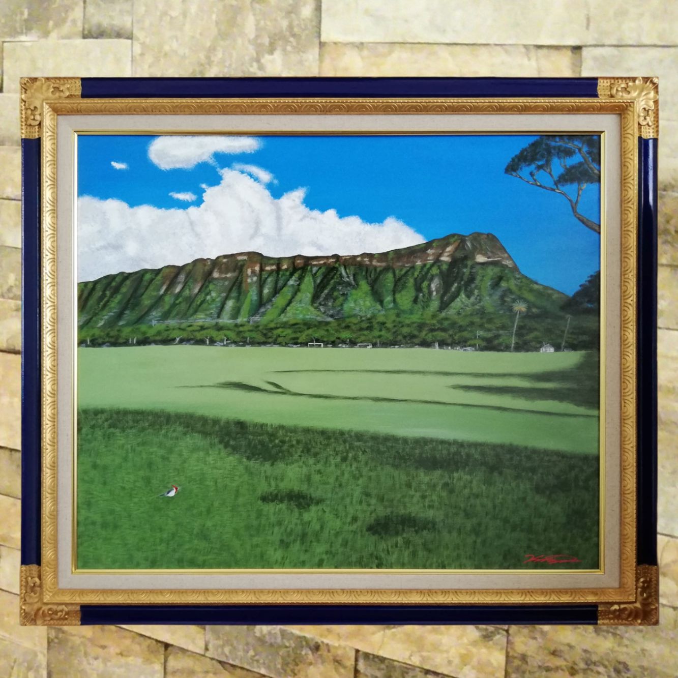 コーナーの大柄な彫模様が目を引く額縁に、ハワイのダイアモンドヘッドの風景がとっても映えていますね! ゴールド×紺は、F0-F10までのご用意で、F20はご用意できず申し訳ありません。しかし、ゴールド×紺の配色を気に入っていただき、また、それをご自分でとても綺麗に色付けされており、より愛される作品となったこと、とても嬉しく思っております!この度はありがとうございました。