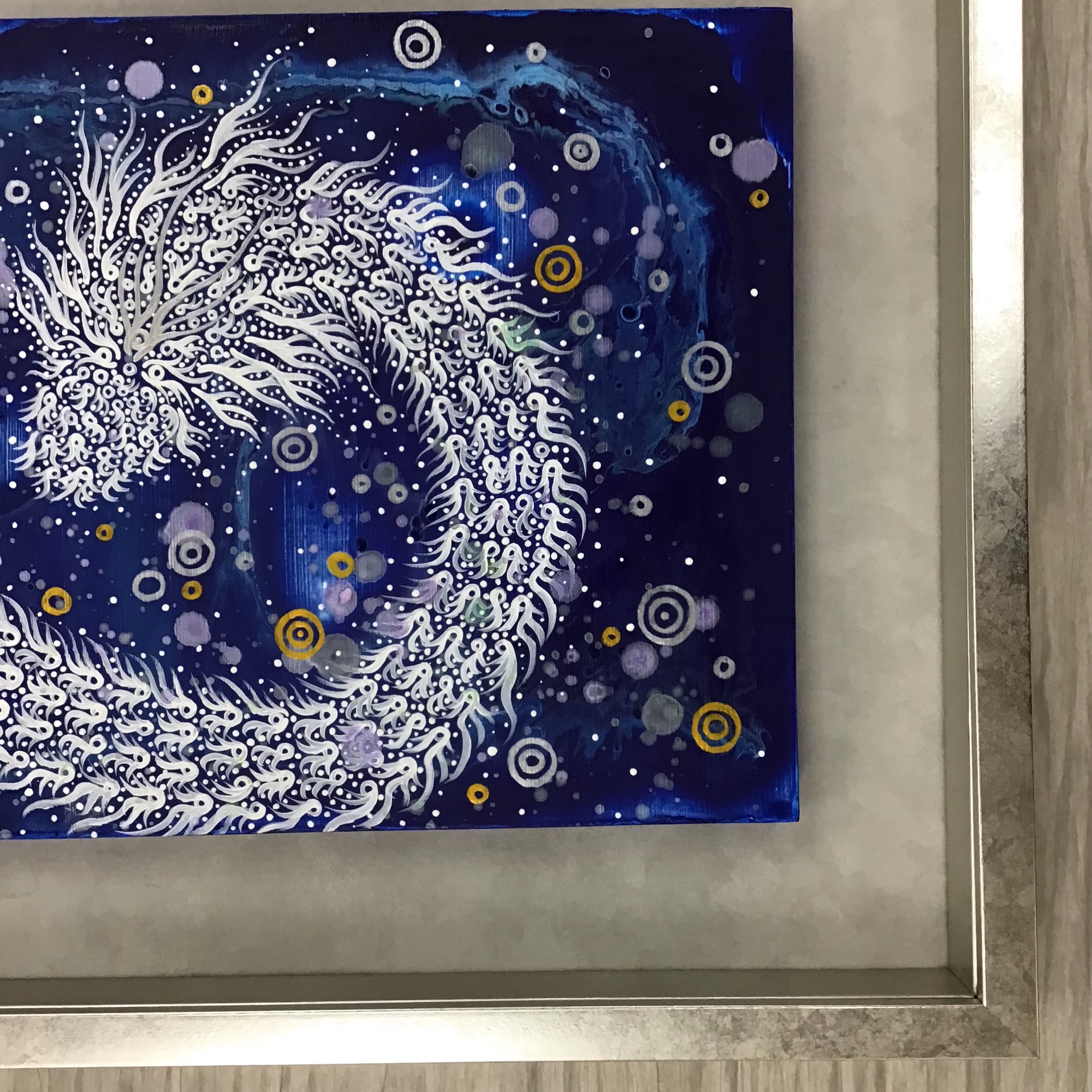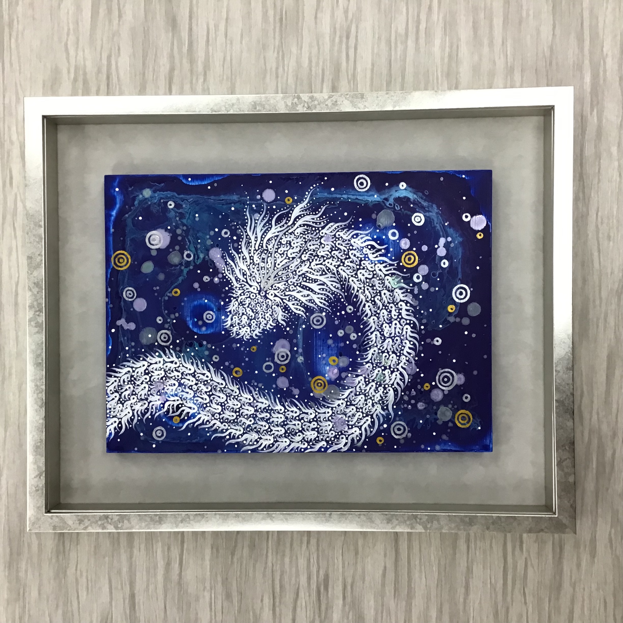 やすだみちこ様のアクリル画「見極める」を額装しました! 青い宇宙のような世界から白く幻想的な龍が、題名の通りにこちらを「見極める」ように見つめています。 こちらの作品は7/6から7/11までギャラリータカハシ松本店にて開催していた「やすだみちこ展 2023」で展示されていた作品です。 作品の青が映えるようにシルバーのフレーム(「BH-E26N シルバー スケッチ4F」)とスエードグレー(※廃番マット)を使用しました。 F4サイズのパネルに描かれている作品なので、スポッといれられるぴったりサイズの額もありますが、絵を端から端まで全て見せたい!という場合は、BOX型の額にいれるのがオススメです♪