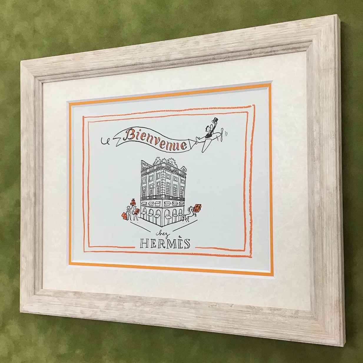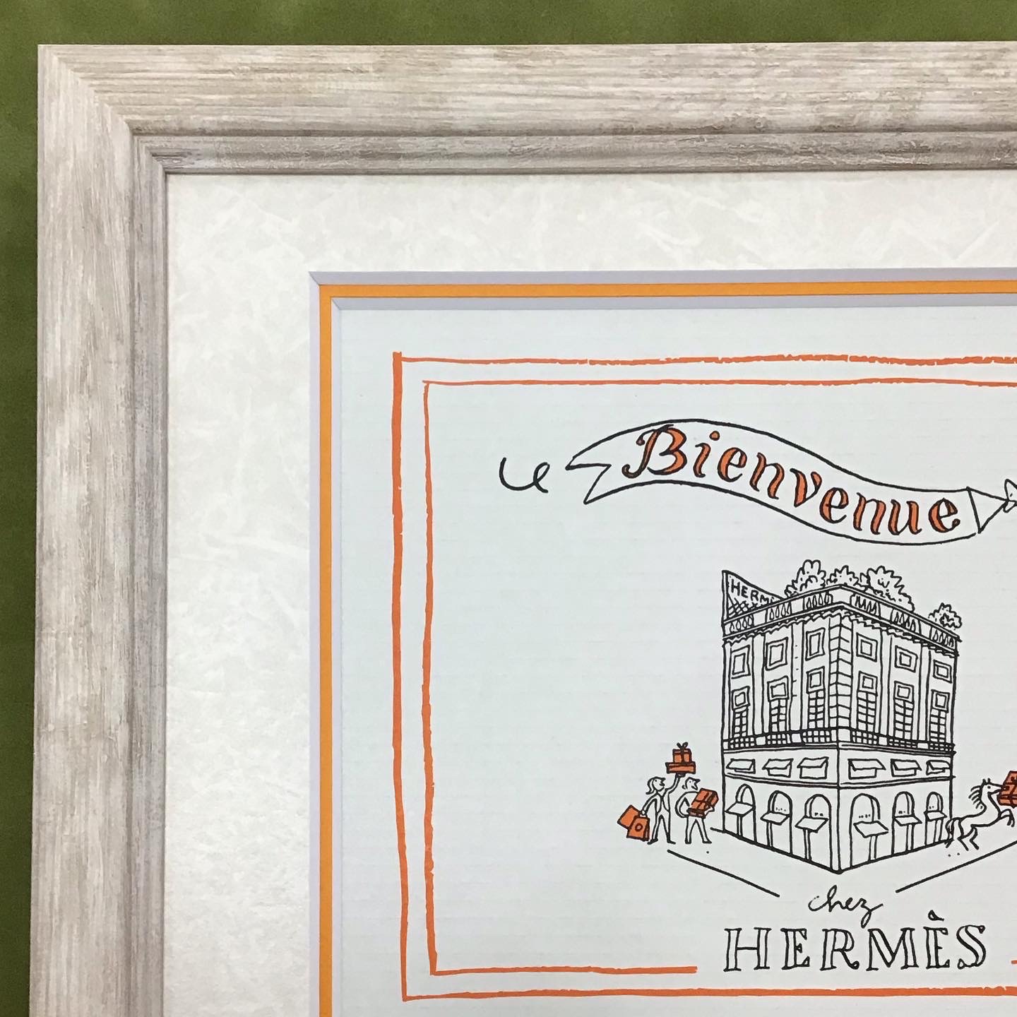 HERMESのネクタイの外箱を額装しました。 蓋裏にある、購入された方だけが見ることができるイラストが素敵なので額装したいということでお持ち込みいただきました。 ★使用した額は「MH-E44J アイボリー/インチサイズ」、マットは「20101 もみ紙白×10046 オレンジ」のWマットです。 イラストに使われているオレンジ色をWマットにより差し色として取り入れつつ、優しげな色合いの木目調のフレームでまとめることで、全体がイラストのタッチと良く調和した仕上がりになりました。 実は以前にも全く同じご注文をいただき、そちらを気に入ったので今回追加で注文したいとのご要望でした。ありがたいと同時に大変嬉しいです。 もし「HPやInstagramで見たあの額装みたいにしたい!」などのご希望がありましたら、ぜひ一度お気軽にご相談ください。