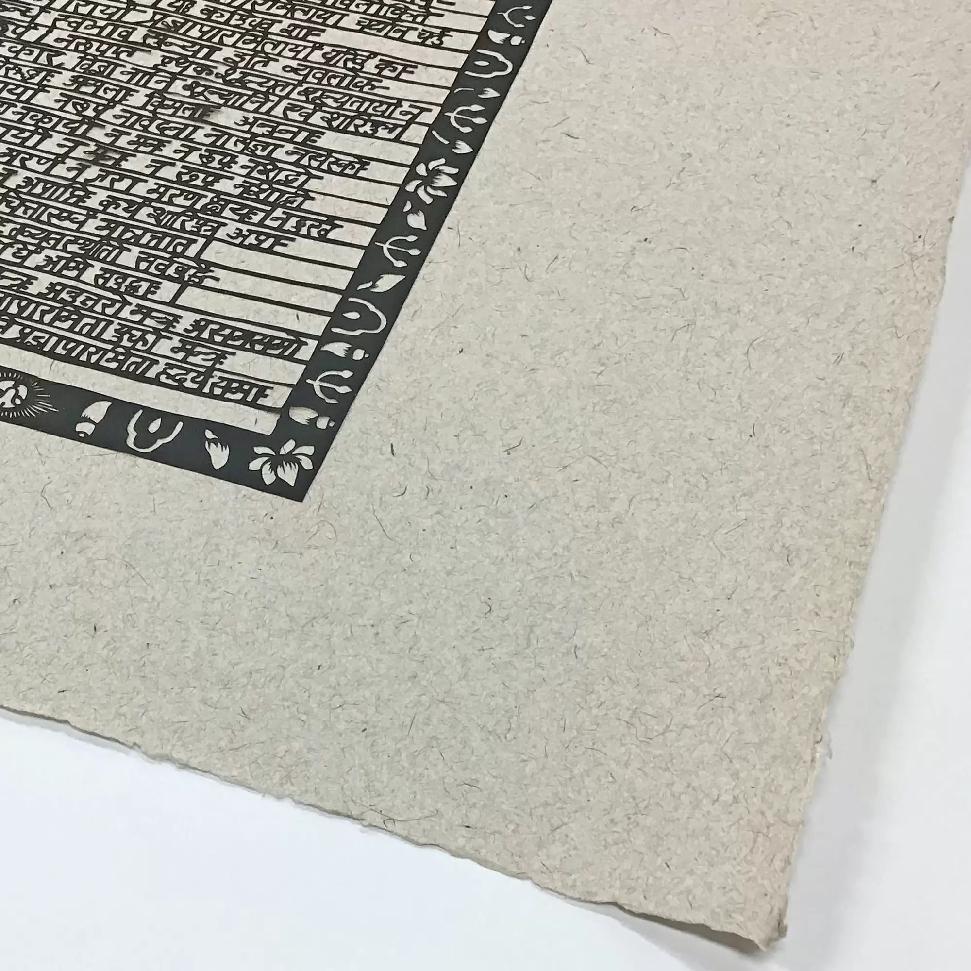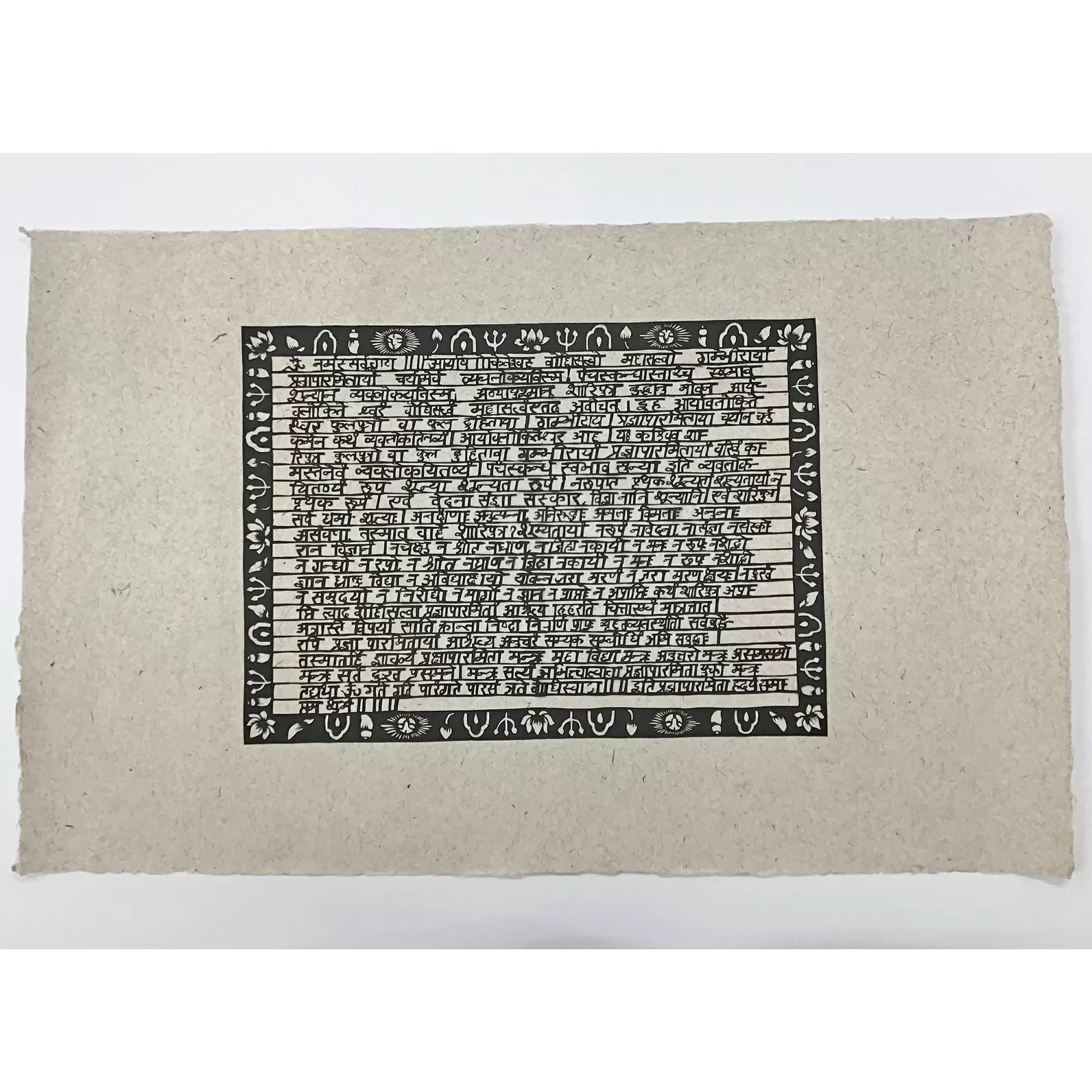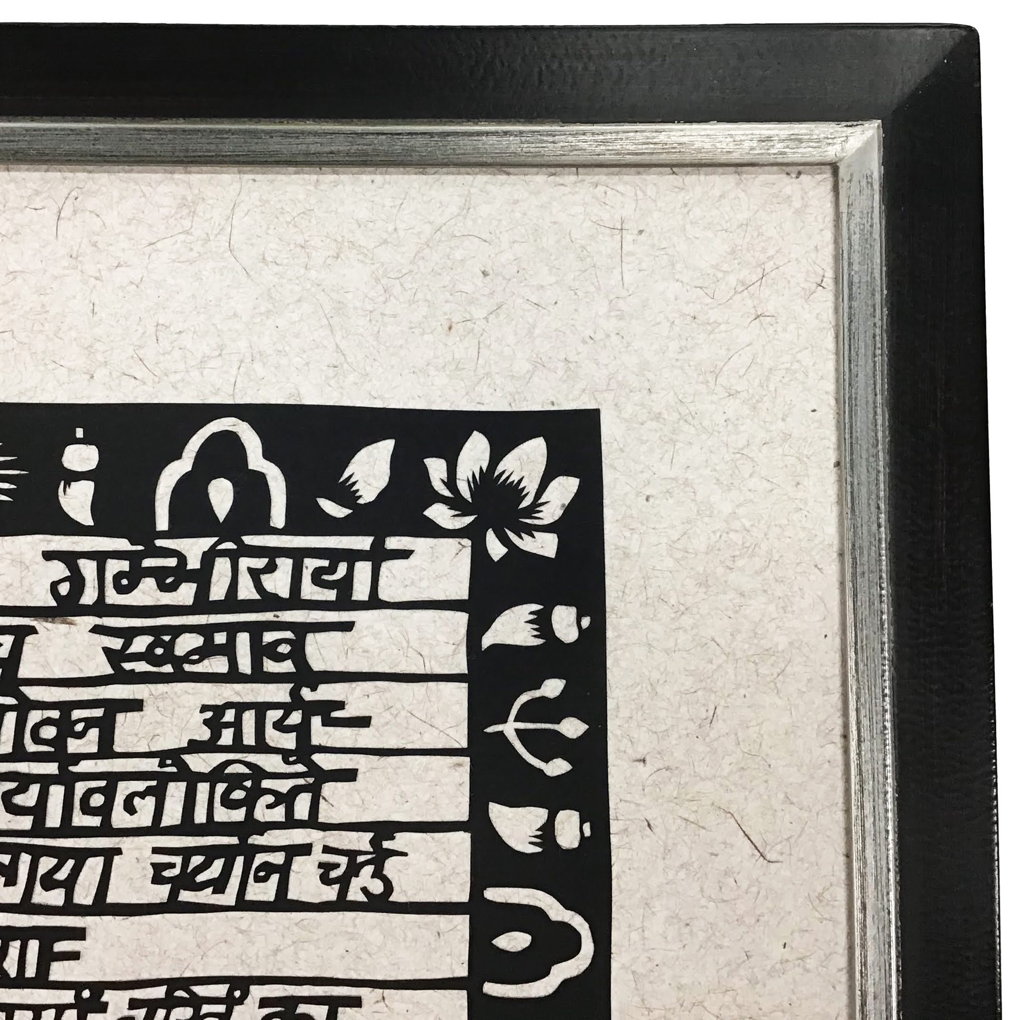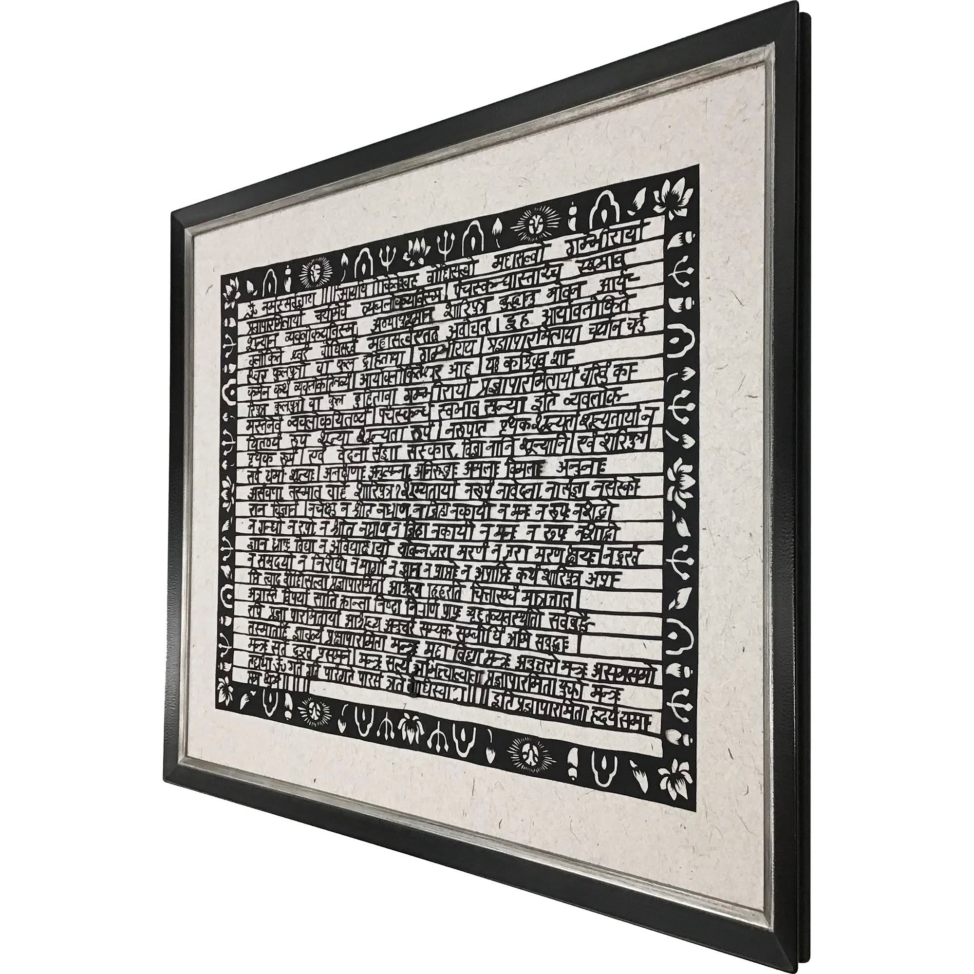 大きなサイズの切り絵を額装しました。こちらはサンスクリット語で書かれた般若心経とのことです。 余白が額よりも大きかったので、お客様の許可をいただいたうえで額内寸に合わせてカットし額装しました。 ★使用した額は「翼 鉄黒/小全紙サイズ」です。 サンスクリット語の文字と周囲の模様、下地に使われている紙の質感から醸し出される作品独自の雰囲気を、内側に銀色をもつ深い黒色のフレームが上手く活かしています。