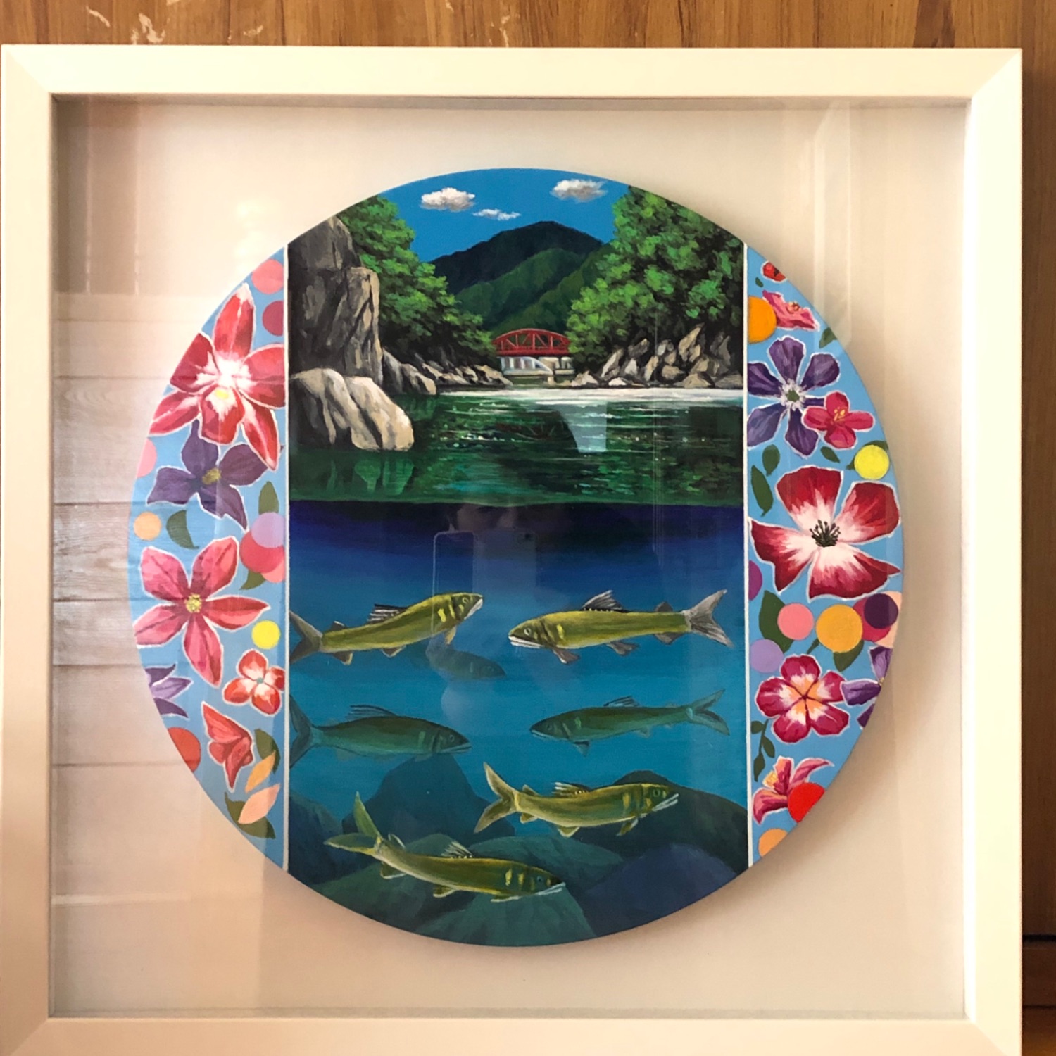 川の色のグラデーションが見事ですね…!水面の輝きから川の中の澄んだ色合いへの移り変わりが美しいです✨作品も丸形でインパクトがありますが、立体額で浮かし額装にすると魅力が更に引き立ちますね!🌊