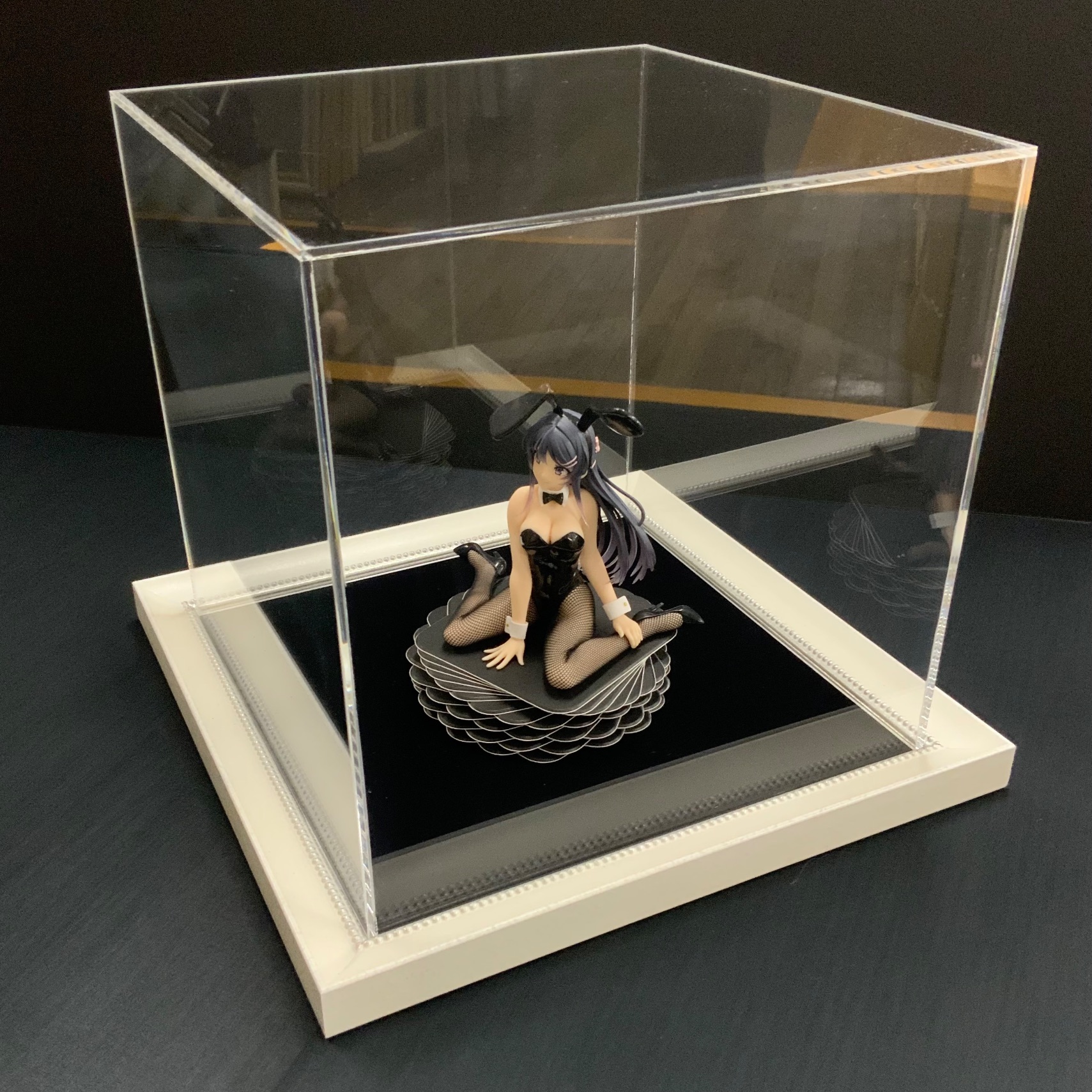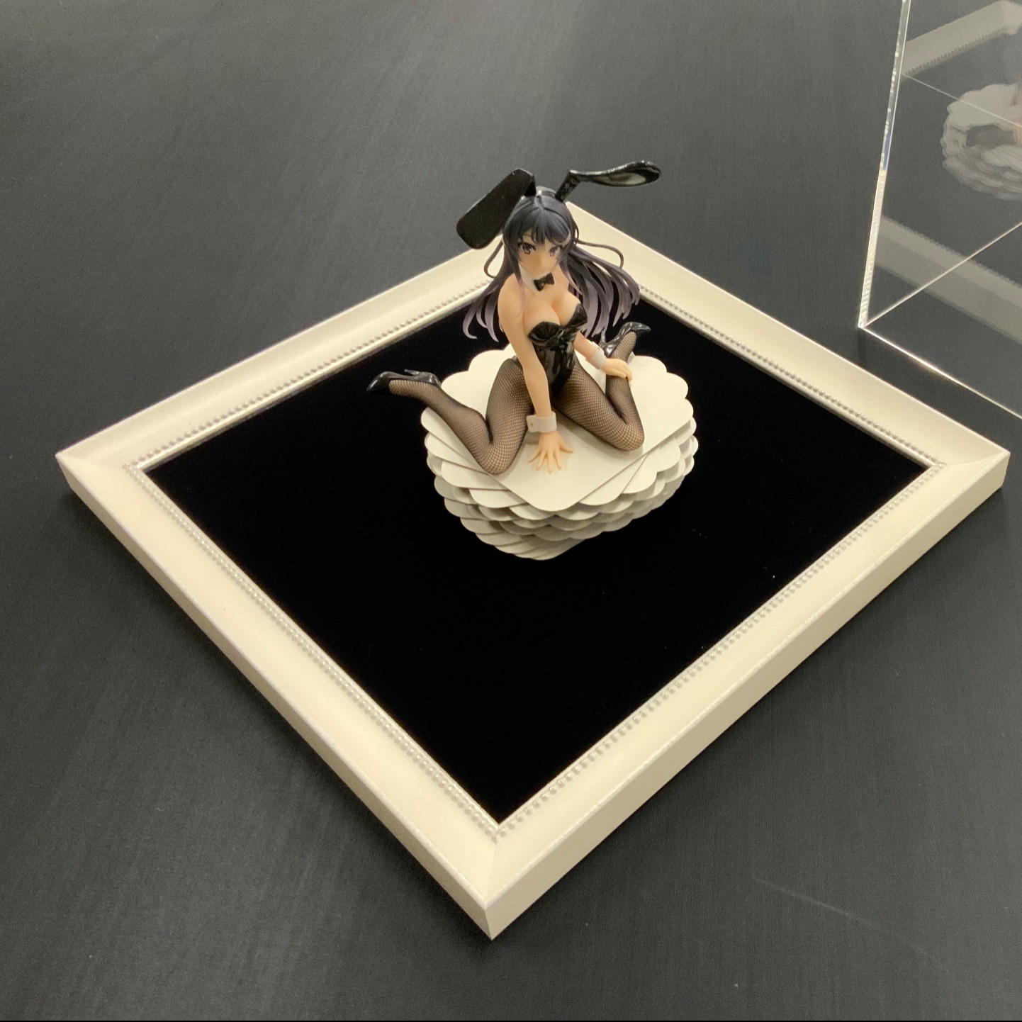 『アクリルケース➕フレーム』 「青春ブタ野郎はおでかけシスターの夢を見ない」桜島麻衣~バニーver.のフィギュアを飾るアクリルケースです🐰 *使用フレーム 22-6491 *サイズ 250✖️250✖️250 *使用布地 NB-34 スエード黒 フィギュアを乗せる台座は、桜島麻衣をイメージして作成しました☺️ 浜辺の階段のような お花のような 様々な◯◯のような〜を集めて 形づくり✨ 初の試みでしたが、とても楽しく桜島麻衣を想いながら作成させていただきました🙌 素敵な機会をありがとうございます😌