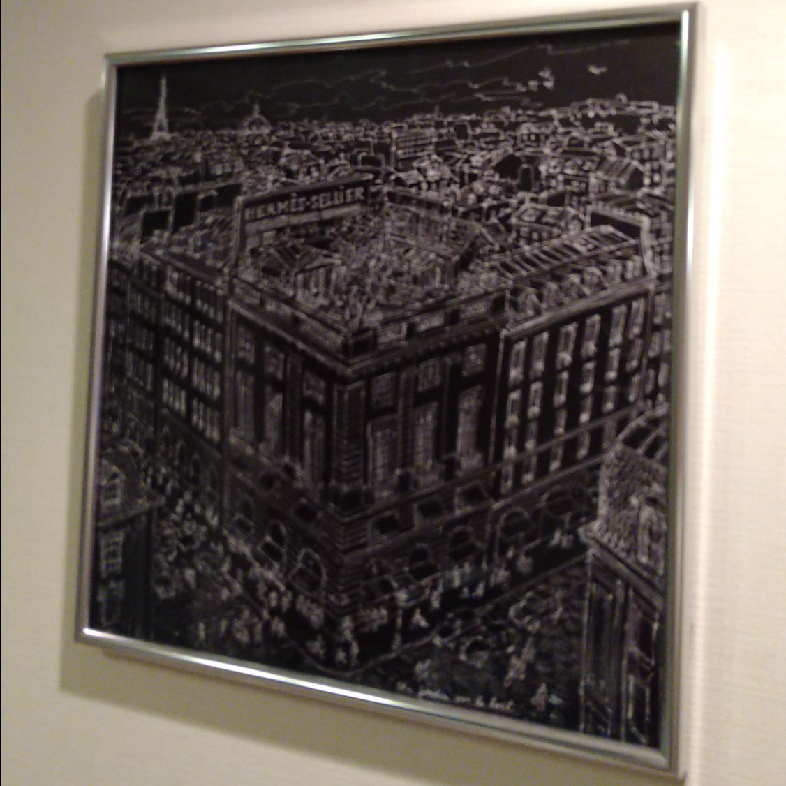 HERMES『屋根の上の庭』 黑×シルバーなのでシルバーの額縁でかっこいい楽想となりました。色違いのスカーフがあるので並べて飾りたいのでまた依頼予定です。
