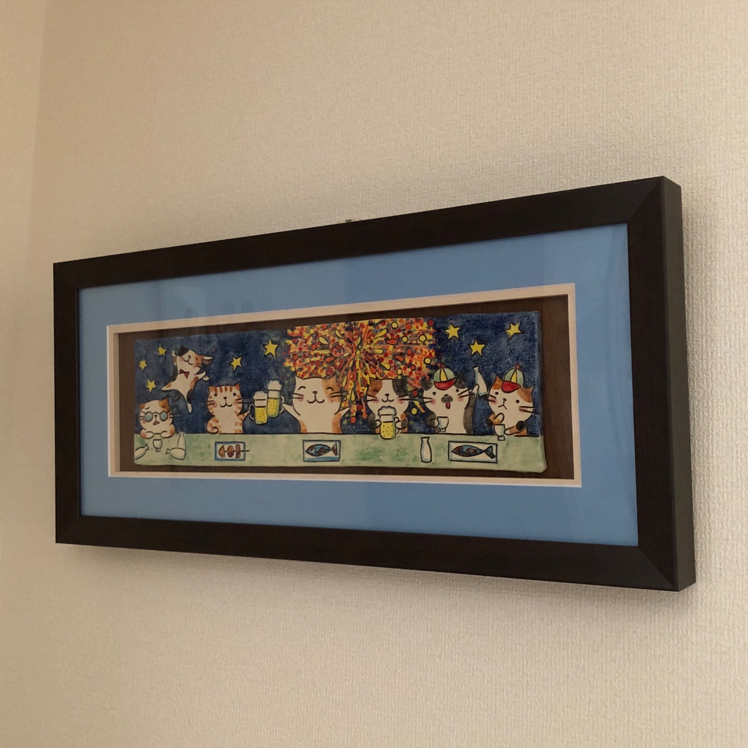 陶画を額縁にセットして、早速飾りました。額縁気に入りました。