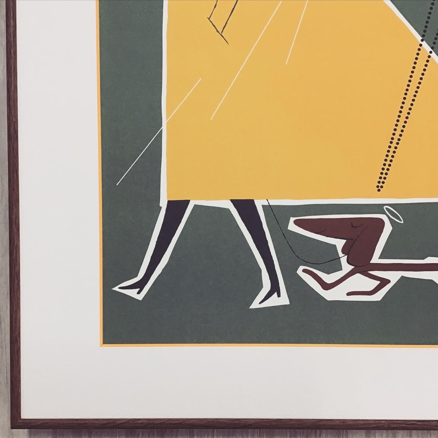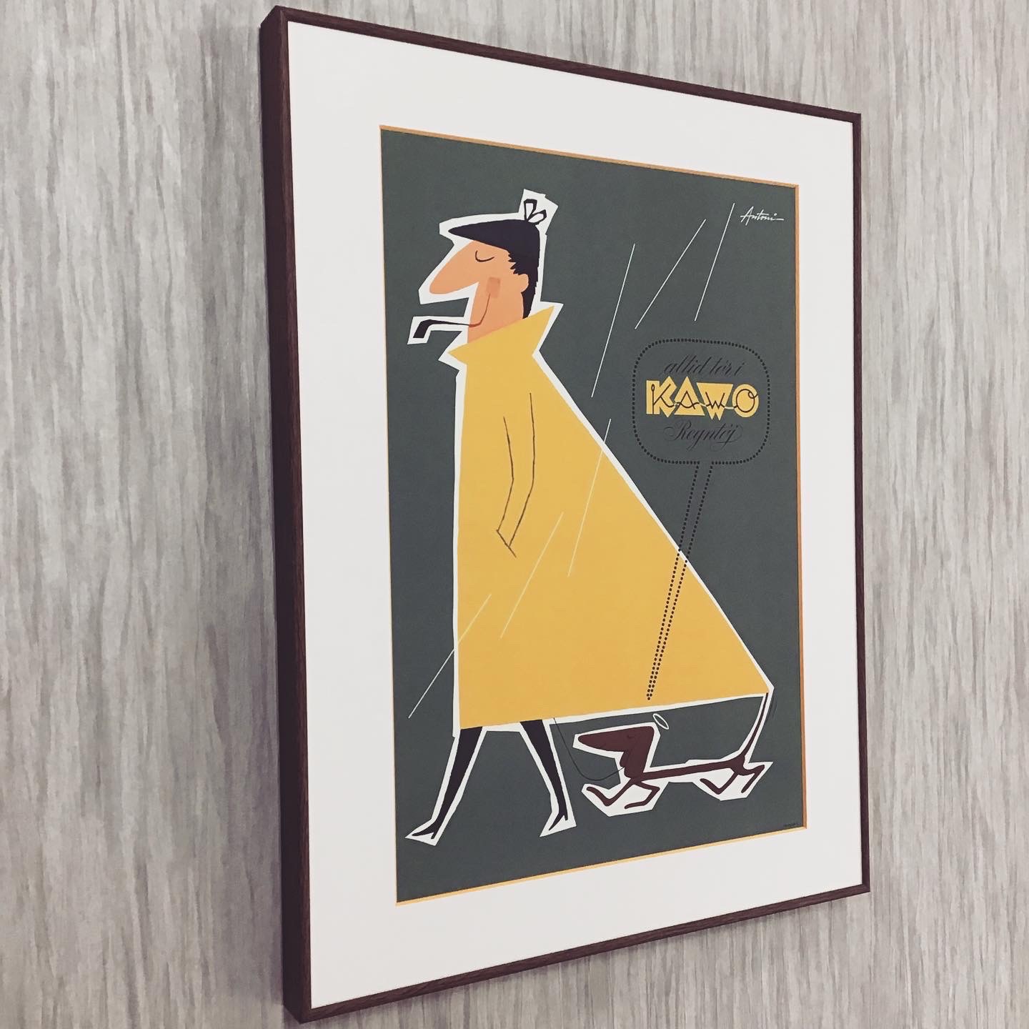 ポスターを額装しました! 雨がパラパラ降る中、黄色いコートにハンチング帽子、煙管を咥えて歩いているお洒落な男性がダックスフンドと一緒に散歩しています。 使用したフレームは「BH-03J ブラウンウッド 大衣」、黄色の切り口の白色マット(10192)です。