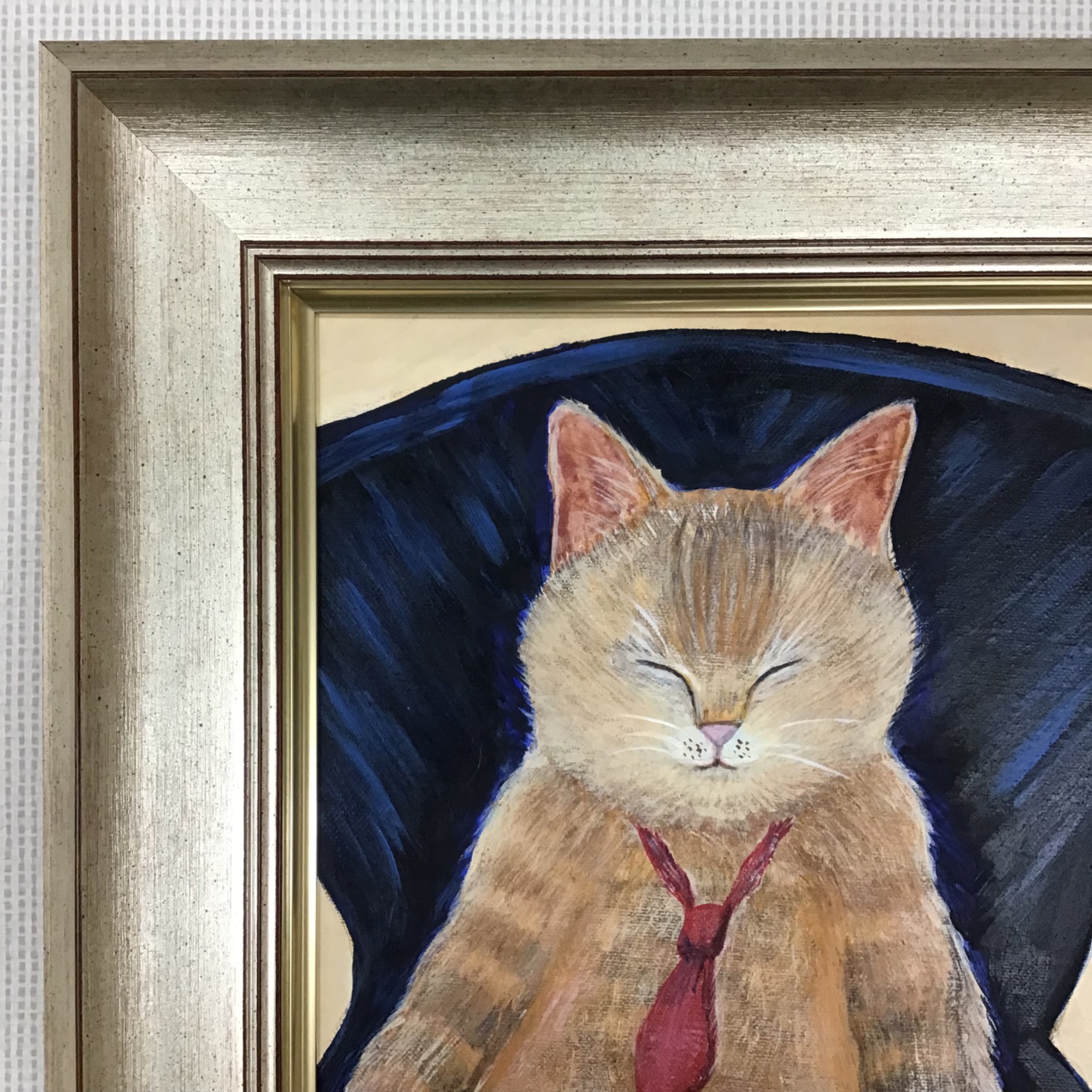 望月まり様( @nekoekakimari )のアクリル画「お疲れ様」を額装しました! 草臥れてお疲れモード...のように見える猫ちゃん、赤いネクタイをしていて、まるで仕事から帰ってきたサラリーマンが椅子に寄りかかって眠っているように見えて、思わずクスッと笑ってしまう作品です。 こちらの作品は9/21(木)〜9/11(火)までギャラリータカハシ松本店にて開催する「望月まり 猫まみれ展」で展示予定の作品です。 入場無料なので、実際の作品を見たい方は是非お越しください! 使用したフレームは「8167 シルバー F4」です。
