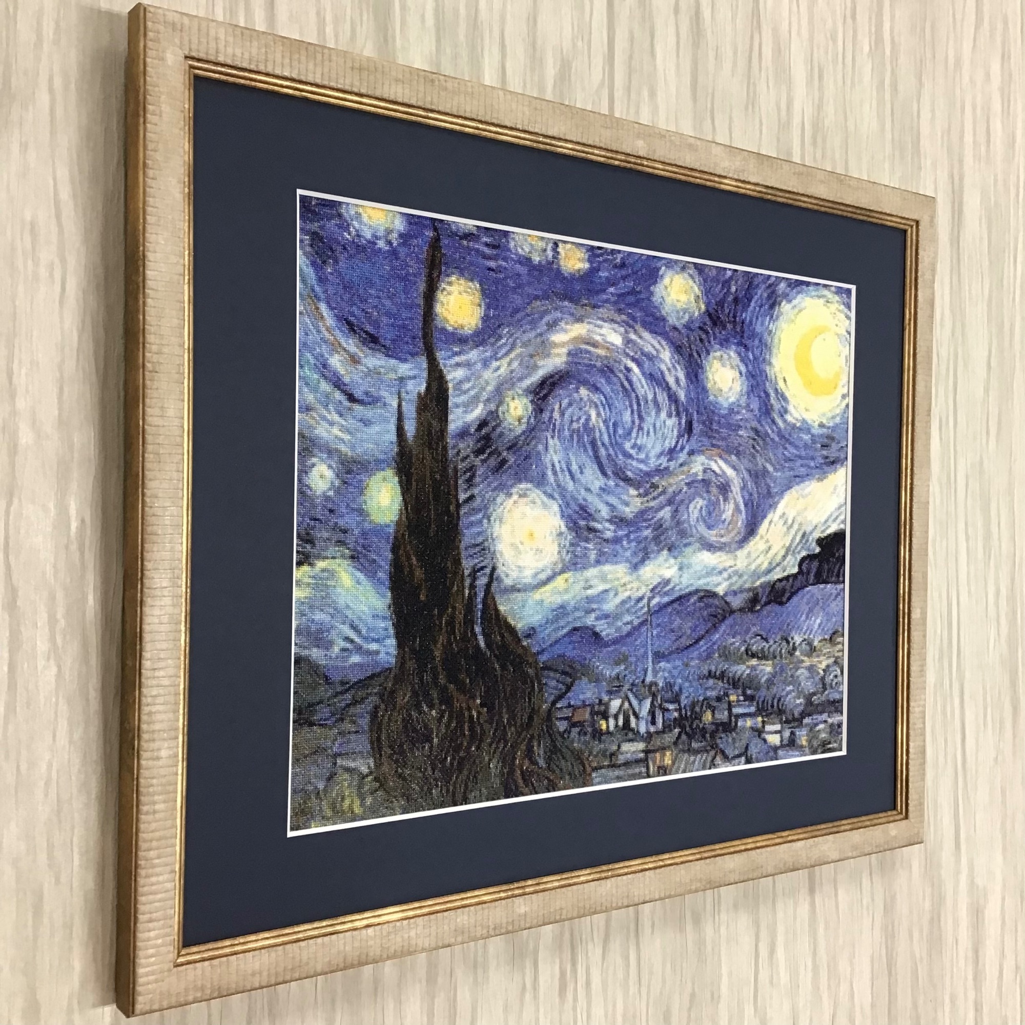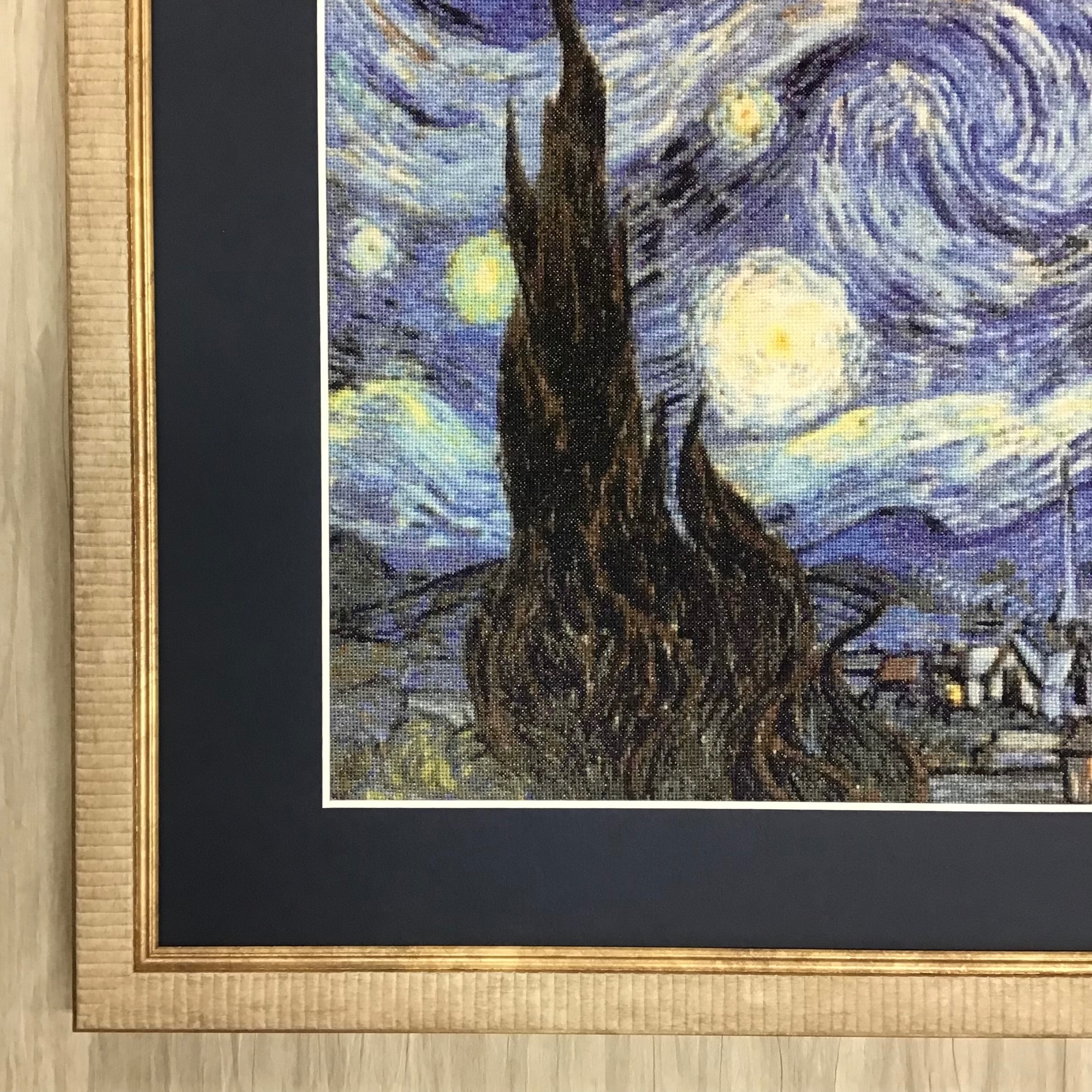 ゴッホ「星月夜」のクロスステッチ刺繍を額装しました! 「ゴッホ 刺繍キット」と検索するとたくさん商品が出てくる中、こちらの作品はなんと...そういった刺繍キットを使用せず、お客様が絵を見て、糸の色•刺す箇所等を考えて作製したとのこと...! 作品の雰囲気にあわせて、アンティーク調な風合いのあるアイボリー色のフレーム「MH-44 アイボリー 水彩F4サイズ」に、夜の空を思わせるような暗い紺色マット(10468)を合わせました。
