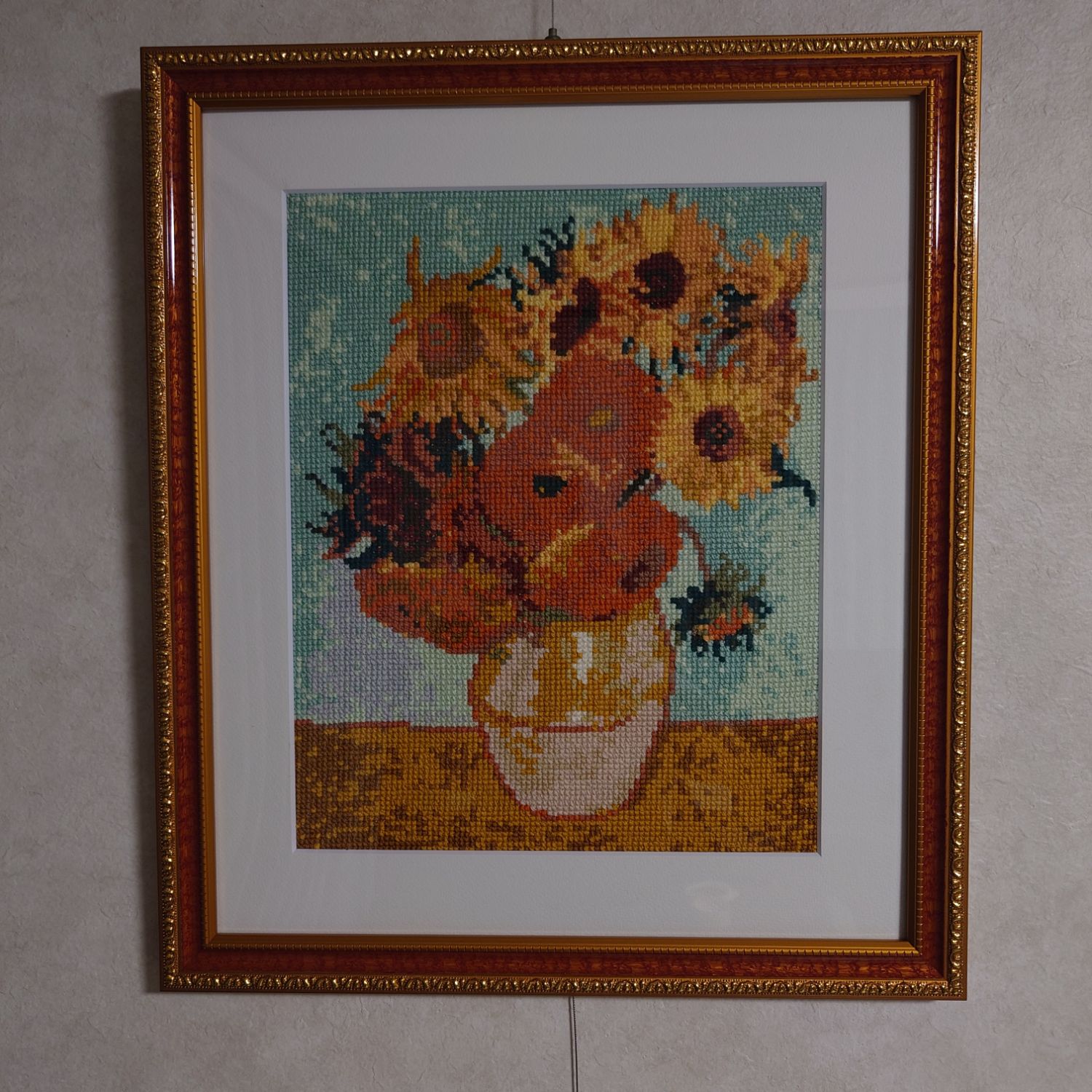 ゴッホのひまわりを刺繍しました。初めて自分で額装しましたが、大満足です。