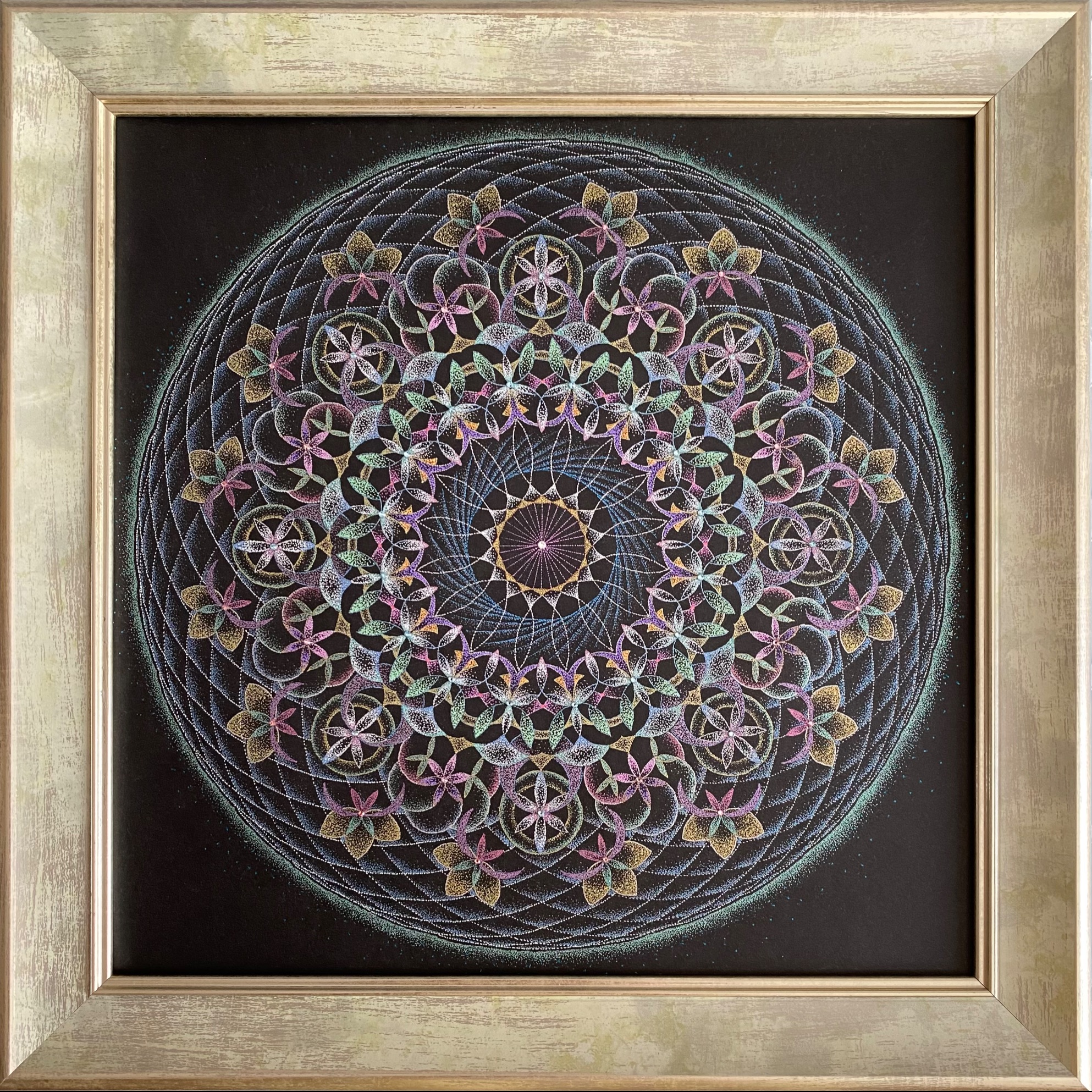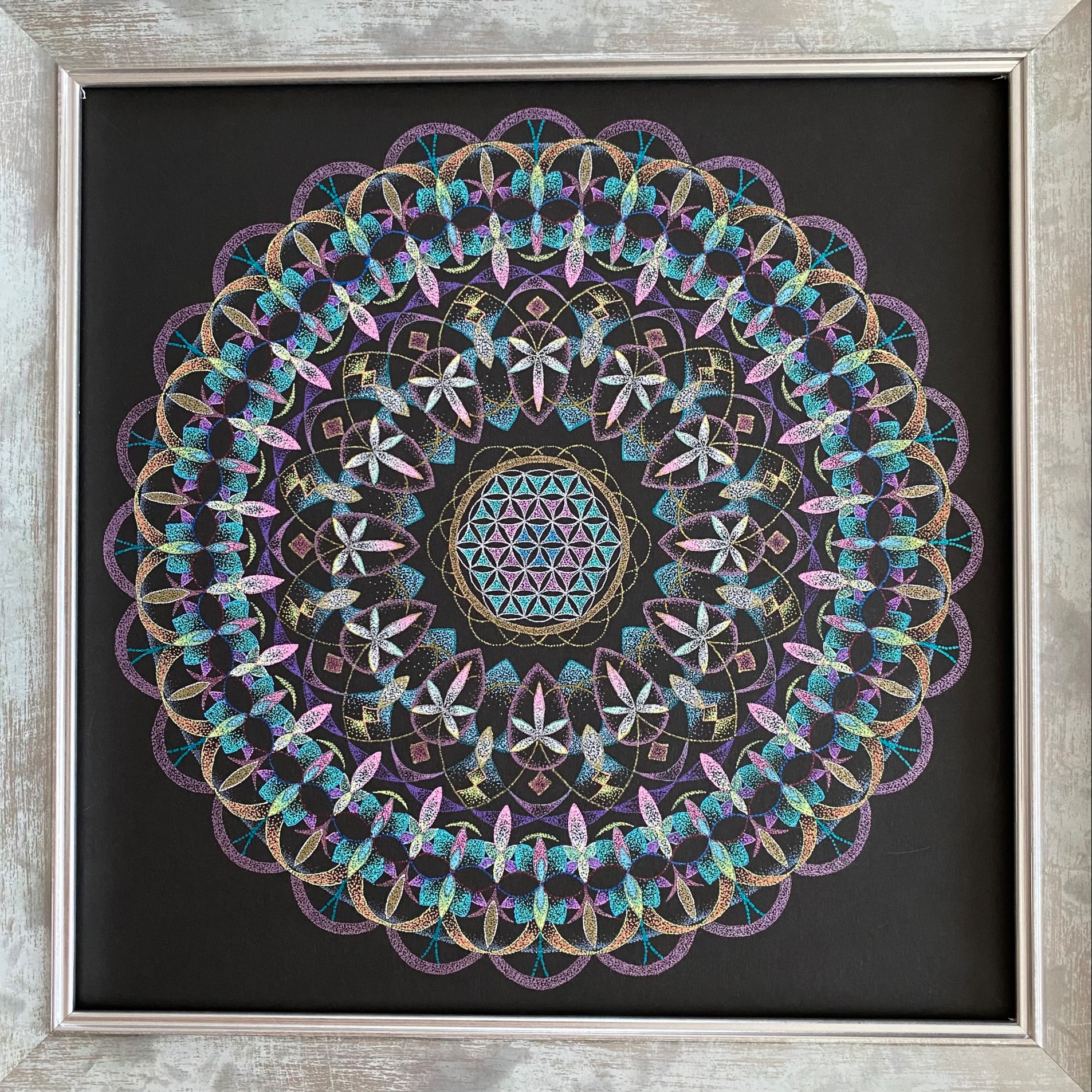 自分で描いた点描曼荼羅画を額装しました。この曼荼羅画は横浜のみなとみらいにて開催された『曼荼羅アート展』に出展しました。とても氣に入ってる額です。