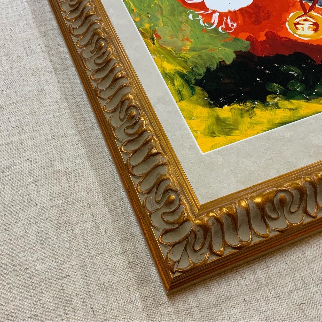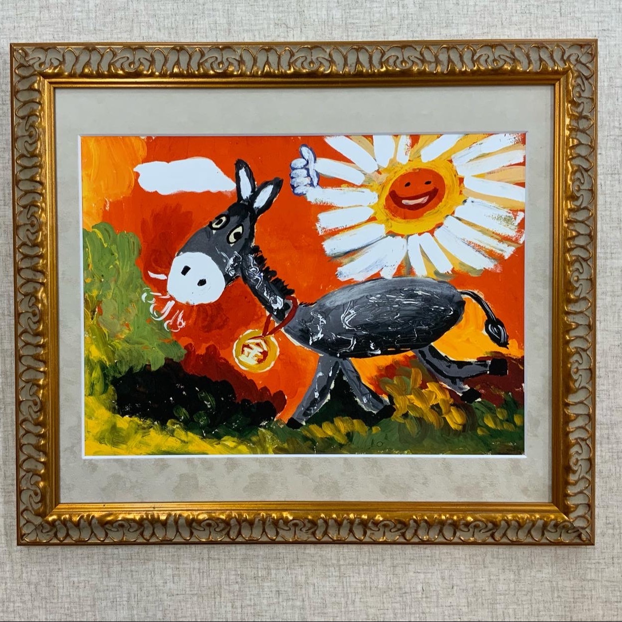 見ているだけで元気をもらえそうなイラスト。金メダルを首から下げて走る馬と、親指を立てて激励するオレンジ色の太陽が、とてもユニークで可愛らしですね😊 木目のフレームやシンプルなフレームだと、どうしても印象が薄くなって、この絵の良いところが引き立たなくなってしまう…と、最後に選んでいただいた縁が、こちらのゴールドのフレーム!デコラティブな模様も、イラストの雰囲気とよく合っています。 #額縁のタカハシ川中島 #額縁のタカハシ #イラスト #額装 #額縁 #額映え #額縁屋 #額縁店 #額 #額装 #frame #framing