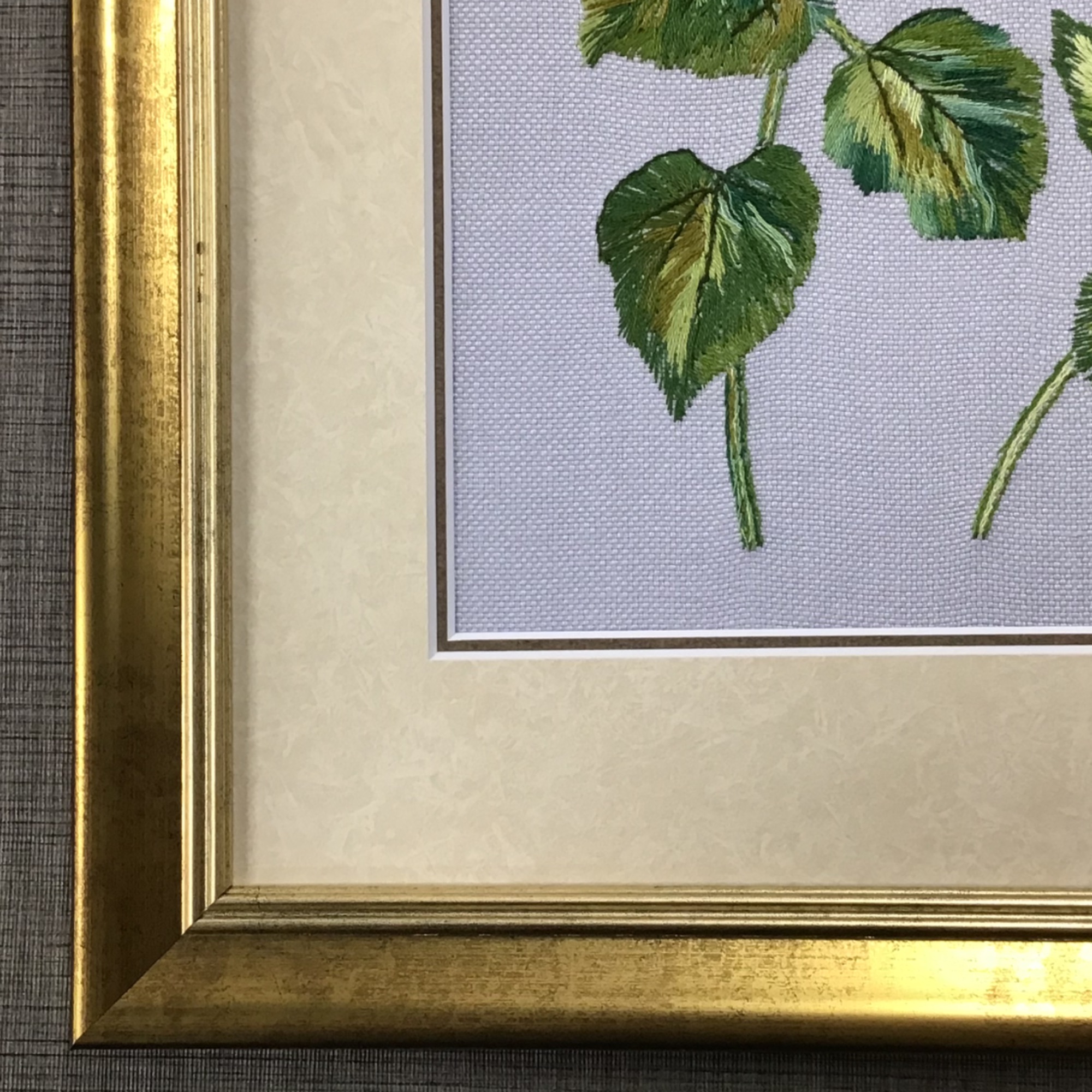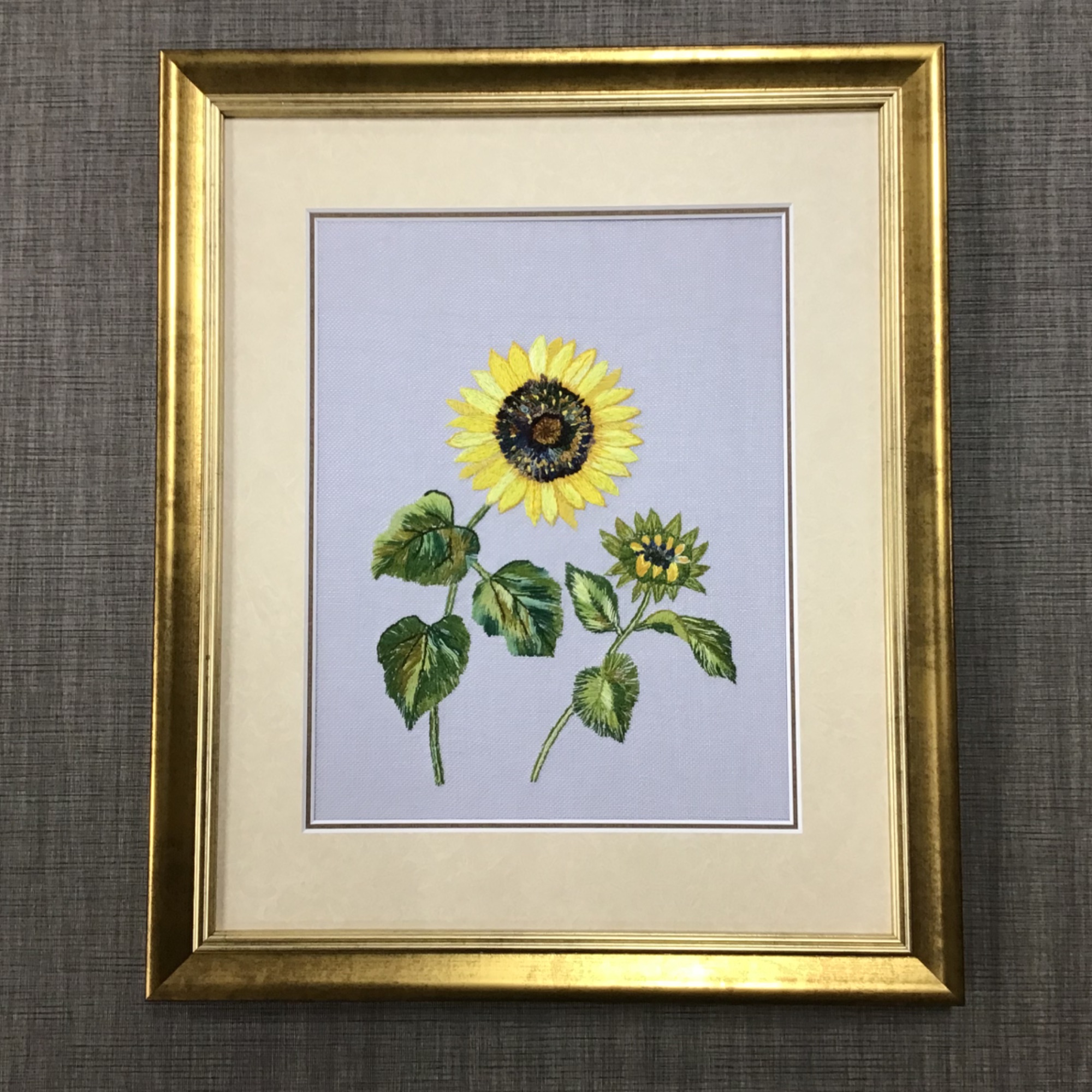 ひまわりの刺しゅうを額装しました。 細かく変えられている色や、使われている糸の質感がテーマと非常にマッチしており、まるで本物かのような生命力を感じる素敵な作品でした。 刺しゅうされた生地の波打ちやシワをのばす『裏打ち』という作業をしてから額に納めています。 ★使用した額は「MH-E19J ゴールド/四ツサイズ」、マットは「20102 もみ紙肌色×20106 上ブラウン」のWマットです。 輝く金色のフレームは降り注ぐ夏の日差しのようです。 差し色として使った、ひまわりの種の色に近い茶色のマットが、作品全体をまとめる良いアクセントになりました。