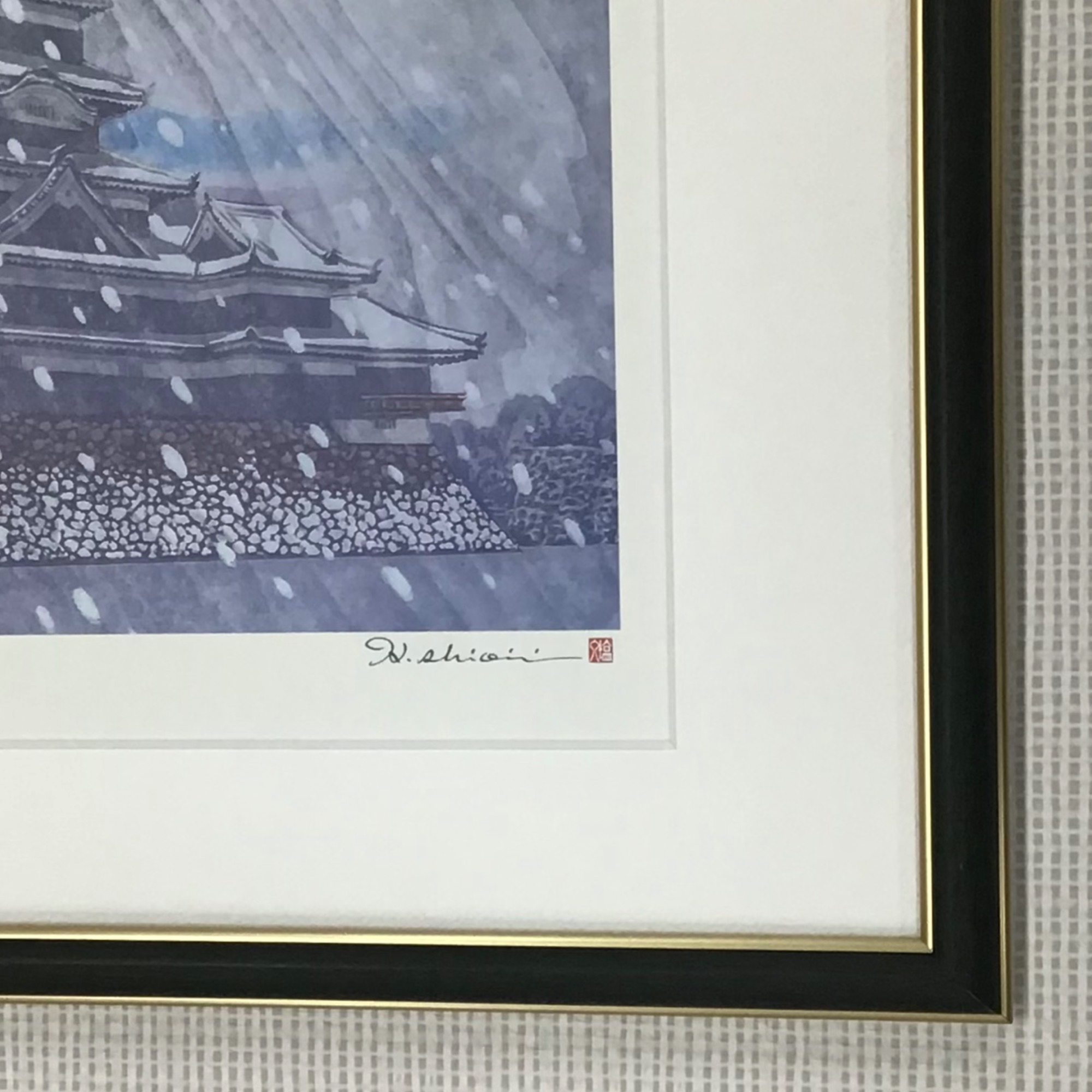 木版画家・塩入久さんの版画を使用したカレンダーを額装しました。 塩入さんは毎年新作を出されており、こちらは2023年版の冬のものです。 鮮やかな色合いが映えるように、マットは白色を使用しています。 使用した額は「BH-18F グリーン」、サイズは300×600mm、マットは白色マット(10043)です。