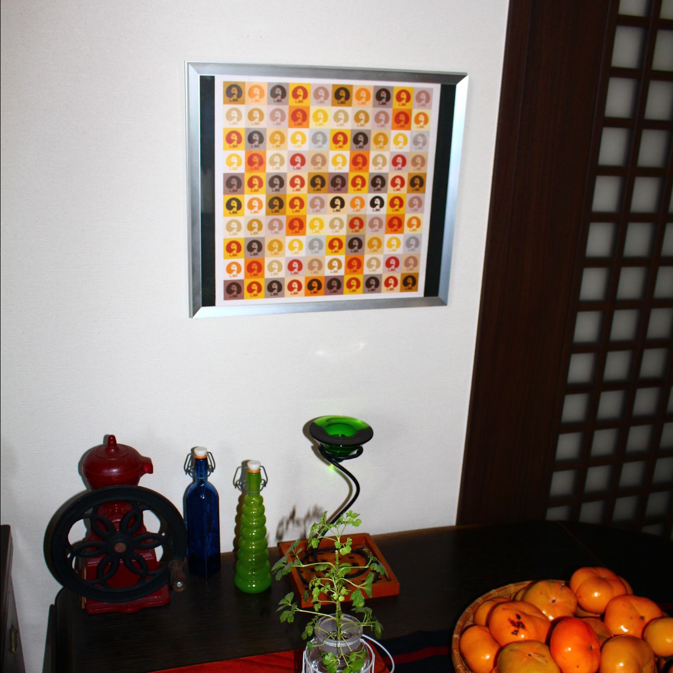 おそらく写真用の額縁ですがアクリルに替え、レコードジャケットを入れています。季節や気分でレコードジャケットを入れ替えて楽しんでいます。