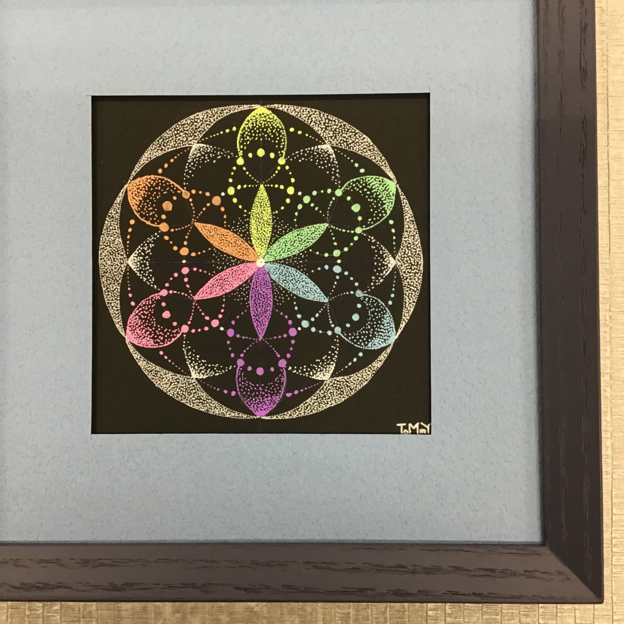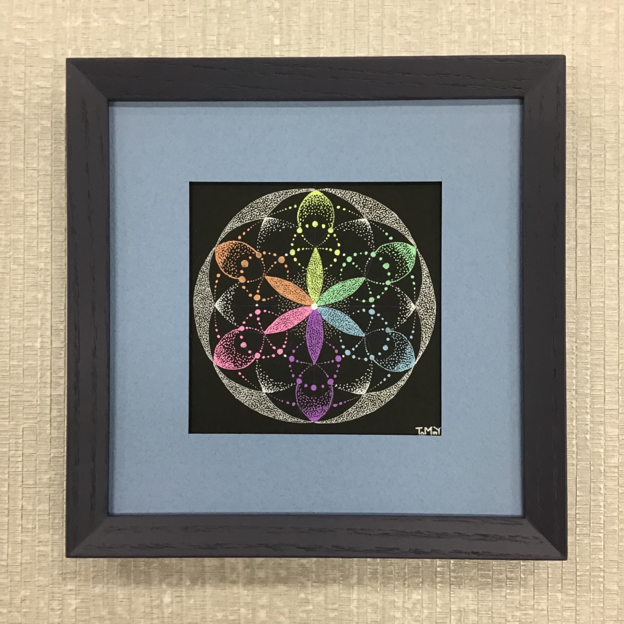 点描曼荼羅を額装しました! 少し前に投稿した点描曼荼羅の小さめバージョンの作品です。 使用したフレームは「M型 紺鼠 15角(※販売なし)」、マットは水色(11270)です。こちらも切り口の白の部分があえて見えないようにカットしてあります!