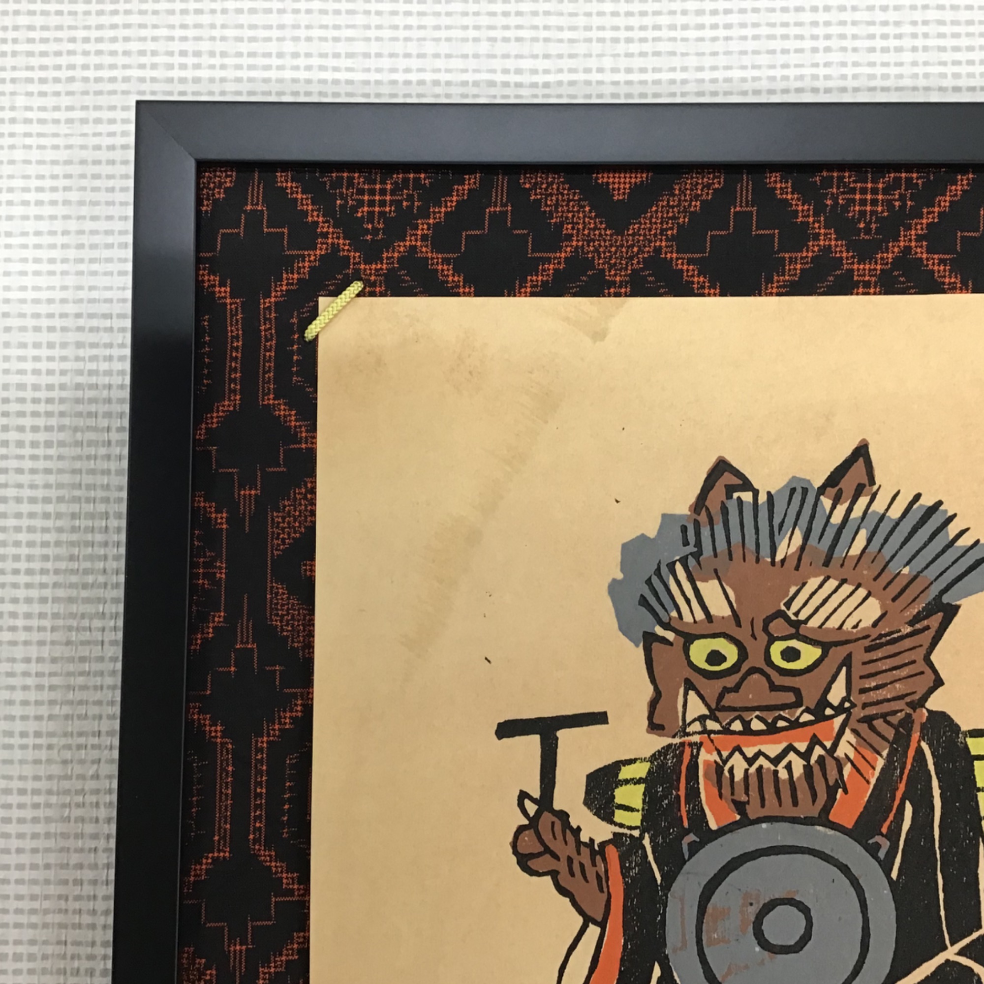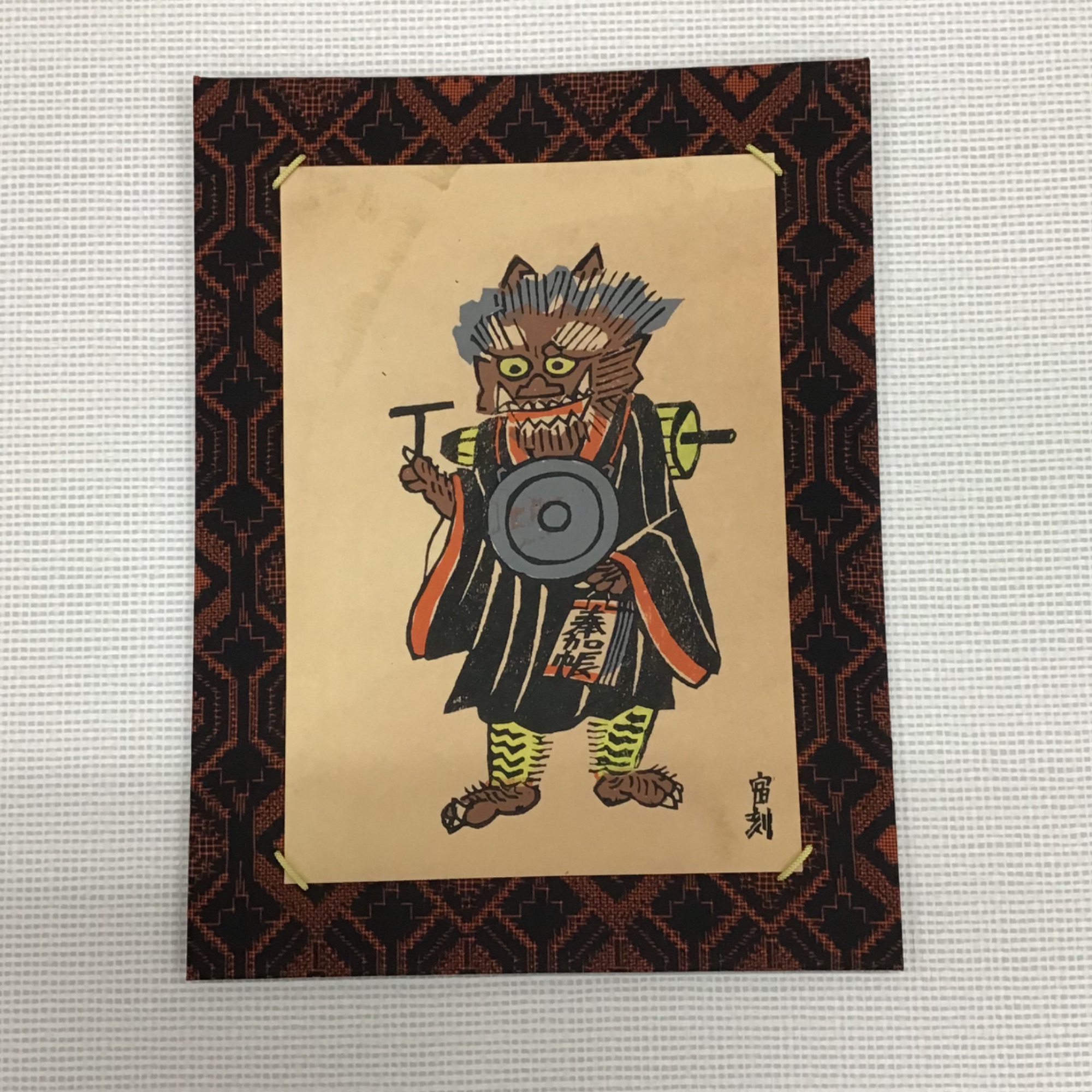 マット付きの大津絵を額装しました。 こちらは大津絵の中でも人気の画題である「鬼の寒念仏」図です。恐ろしくもどこか愛嬌のある鬼が僧衣をまとい、手に奉加帳を持った姿が描かれています。 使用した額は「02-UH1515B 黒/特寸サイズ」です。 もともととても雰囲気にあった素敵なマットが付属していましたので、それをそのまま活かすことにいたしました。 作品の僧衣に近い色合いの艶消し加工の施された黒色フレームで全体をまとめてみました。