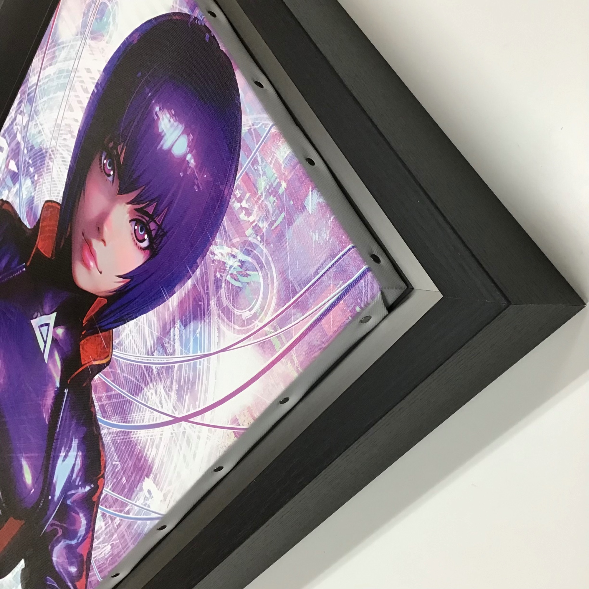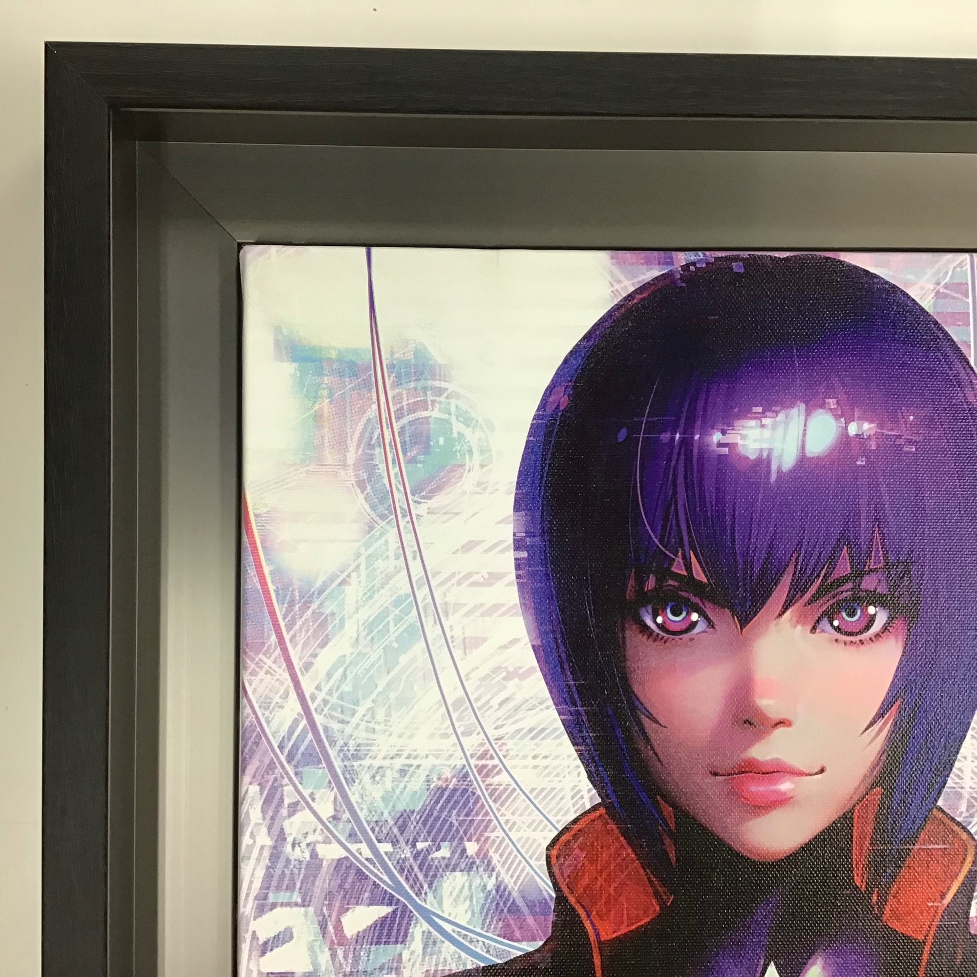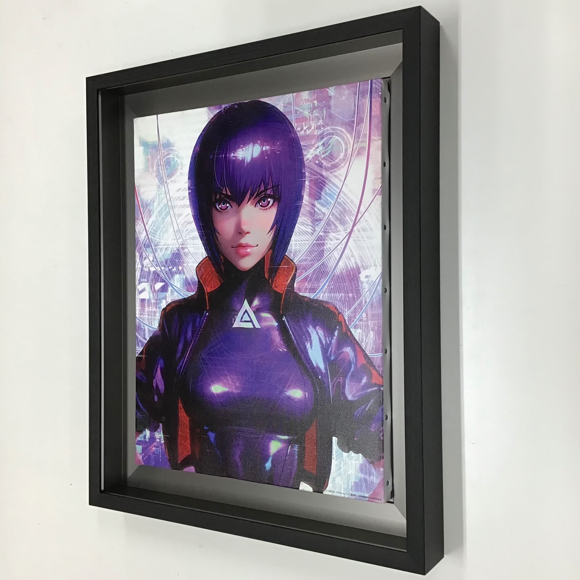 人間の他に電脳化した人間、サイボーグやアンドロイドなどが混在する世界で活動する「公安9課(通称【攻殻機動隊】)」の物語を描いた作品「攻殻機動隊」...漫画から、アニメ化・小説化・映画化されている人気シリーズです。 現在「THE ART OF SAC_2045 攻殻機動隊 版画販売会」が開催中で、そこで販売されているオリジナルグッズ「攻殻機動隊 草薙素子 キャンバスアート F6」を額装しました! 近未来的な作品の雰囲気に合うようにフレームは「CX-62 ブラックウッド F6」、通常はアクリルが入っていない商品ですが、汚れと紫外線を防止するためにアクリルをセットしました!