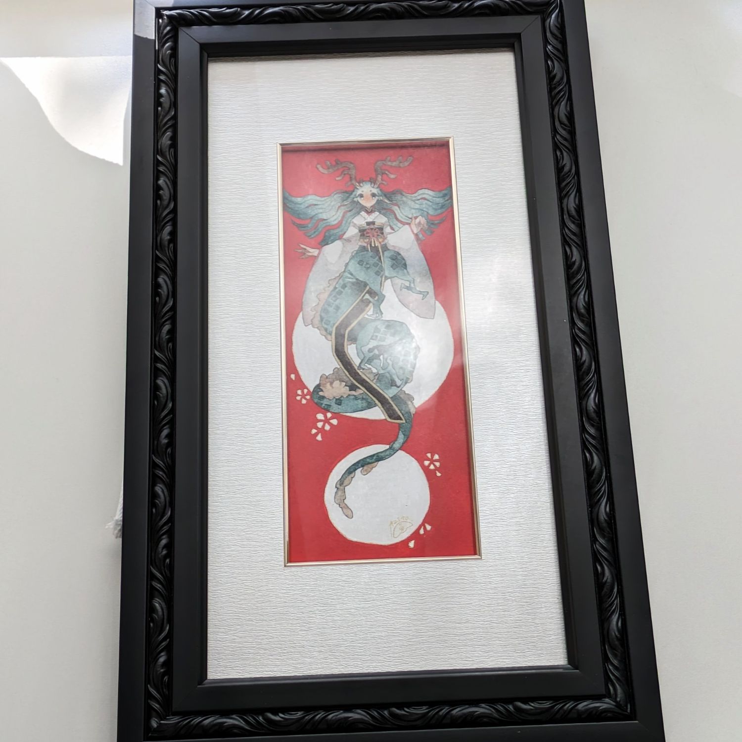 展示会に出す絵です。 オーダーフレームにて300✕150mmの大きさの額とマット(真珠に面金)を頼み、額装しました。 シンプルながらも遊び心のある額に全体の色(赤、白、黒)のメリハリを持たせてみました。