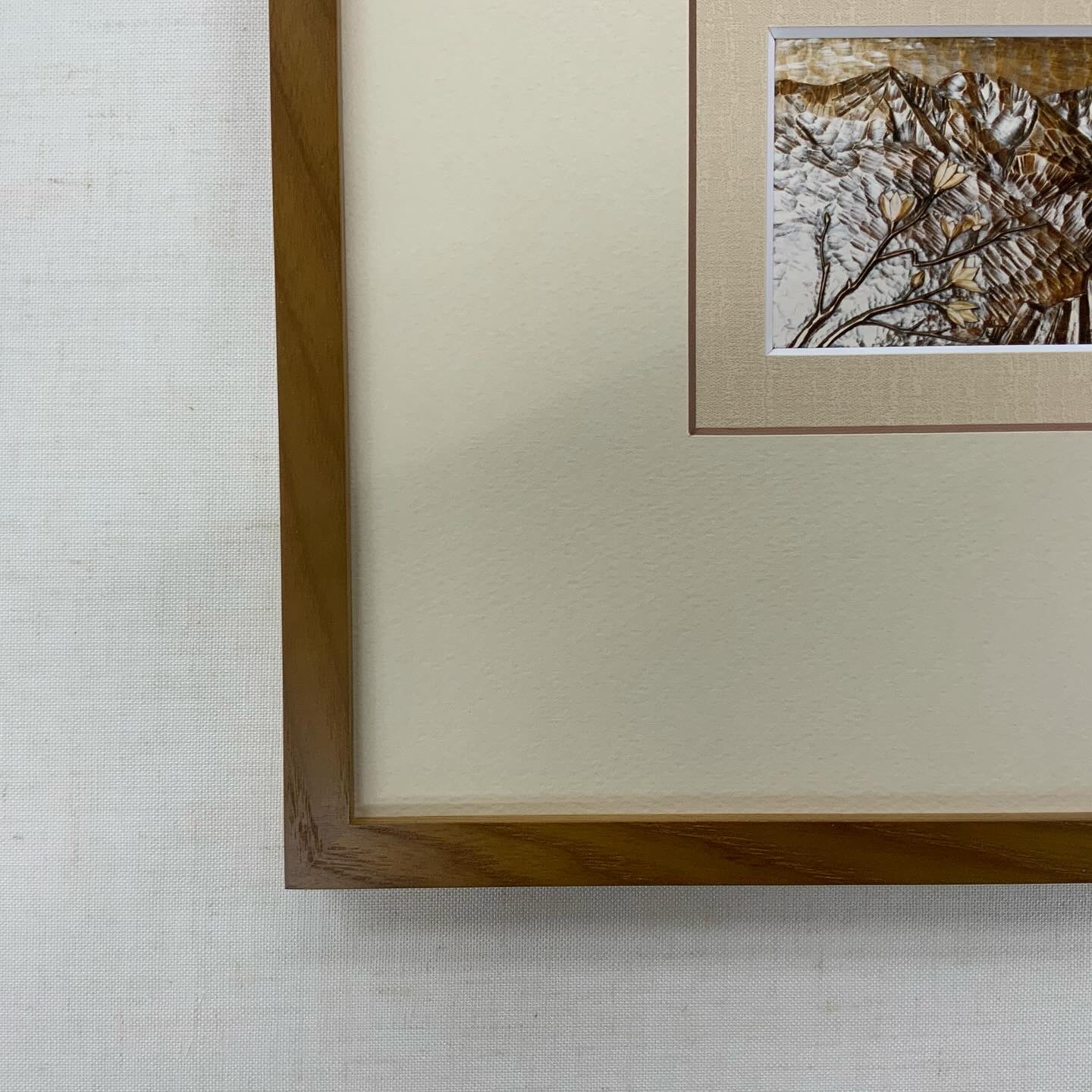 小さなサービス判サイズのお写真を額装しました。 もともとは、数十年前に完成した木彫の作品。白馬の山々と、こぶしの花をモチーフに彫ったそうです。 本物を飾りたいけど大き過ぎるし重量があり過ぎる…小さく写真としてプリントしたものを額装して楽しみたいと、ご注文をいただきました。 使用したフレームは【GT501ライトブラウン】。サイズは25角です。 サービス判のお写真には大きく感じてしまうかもしれませんが、マットでアクセントをつけると、その余白も活かせます。今回は、カラーコア茶(10197)とベージュ(10502)の組み合わせ。マットの差を広めに取る事で、動きのある額装になります。 #額縁のタカハシ川中島 #額縁のタカハシ #木彫り #額装 #額縁 #額映え #額縁屋 #額縁店 #額 #額装 #frame #framing