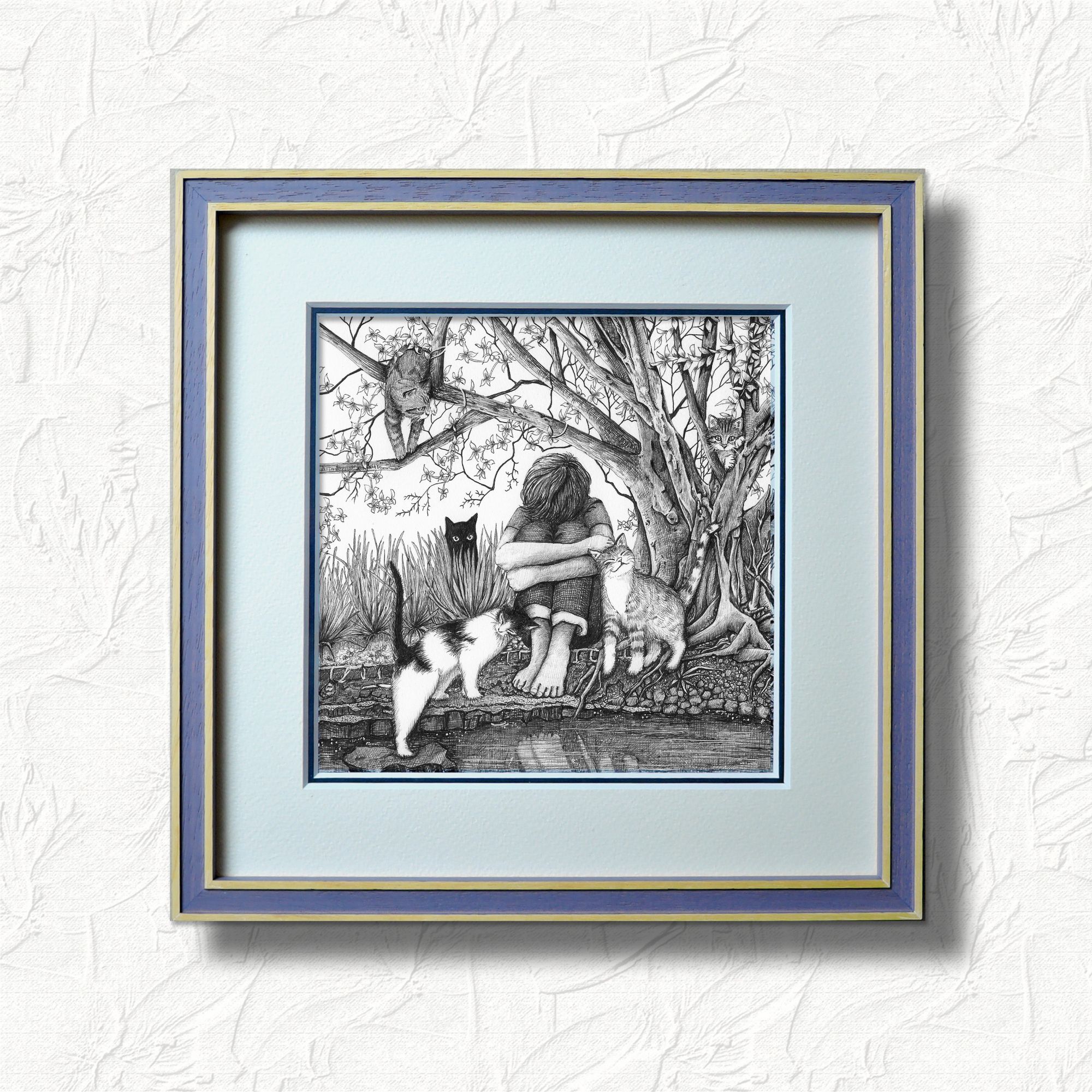 一般額7910ネイヴィー25角サイズにワーグマンと濃紺のダブルマットを合わせました。 この作品は、もともとは、ニューヨークで開催されるコースターデザイン展に出品するために制作したボールペン画です。 この額装でオンラインショップに作品掲載したところ、プリント購入の際にお客様から同じ額装をというリクエストをいただきました。 オンラインショップに作品を載せるときには、最善と思われる額装を選んでいますが、お客様にも気に入っていただけて良かったです。 タカハシ様には、プリント額装の依頼にもご対応していただき、大変感謝しております。ありがとうございました。