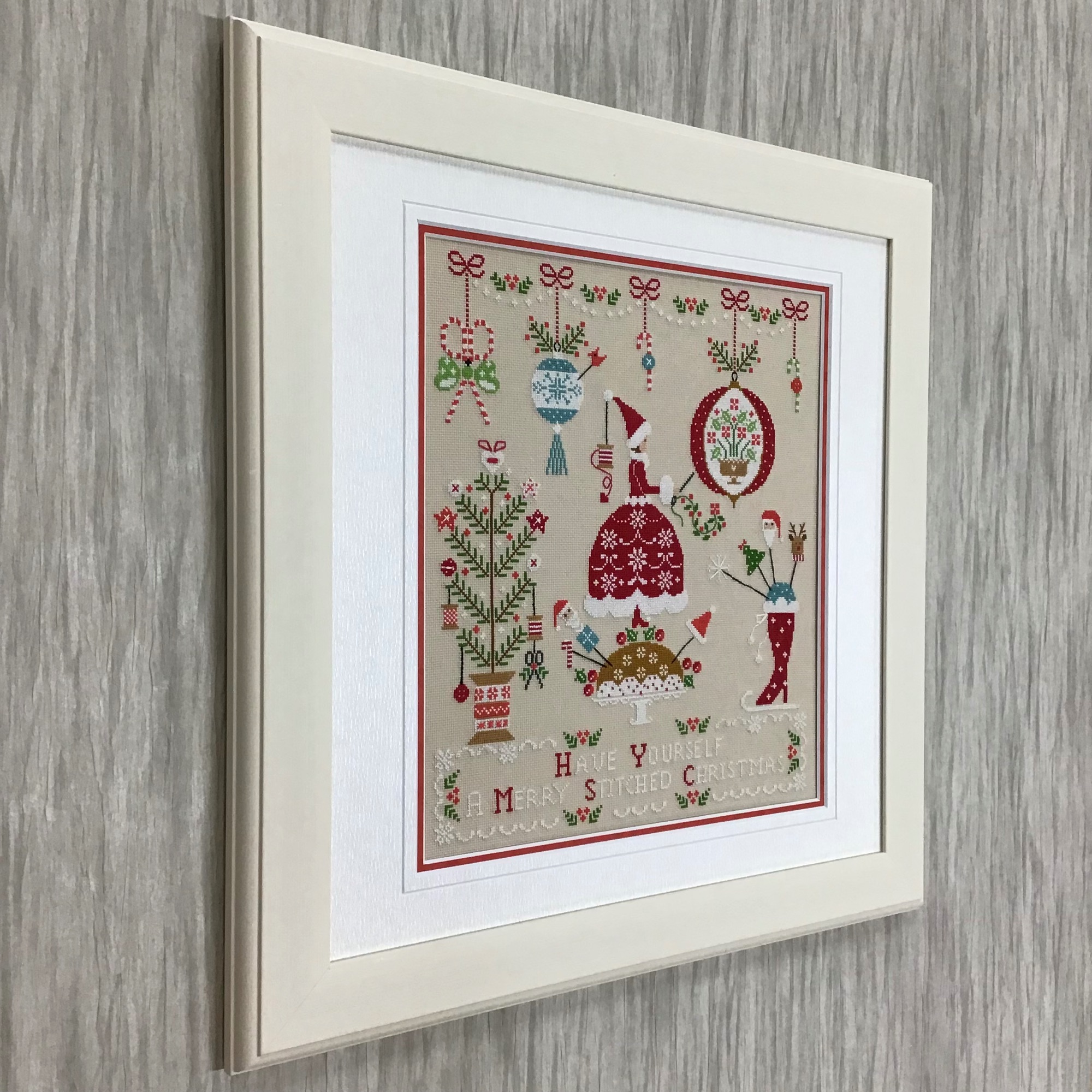 もうすぐクリスマスですね!この時期にピッタリなクロスステッチ作品の額装をご依頼いただきました! サンタさんの格好した女の子がクリスマスの準備をしているのでしょうか?クリスマスツリーやクリスマスな飾りに囲まれています。 使用したフレームは「APS-01 ホワイト(※廃色) 40角」、マットは雪のように白くて光沢のある白色マット(20207)とクリスマスにぴったりな赤色のチェック柄マット(20304※廃色※)を組み合わせたWマットです!表のマットにはぐるりと一周V溝加工を入れました!