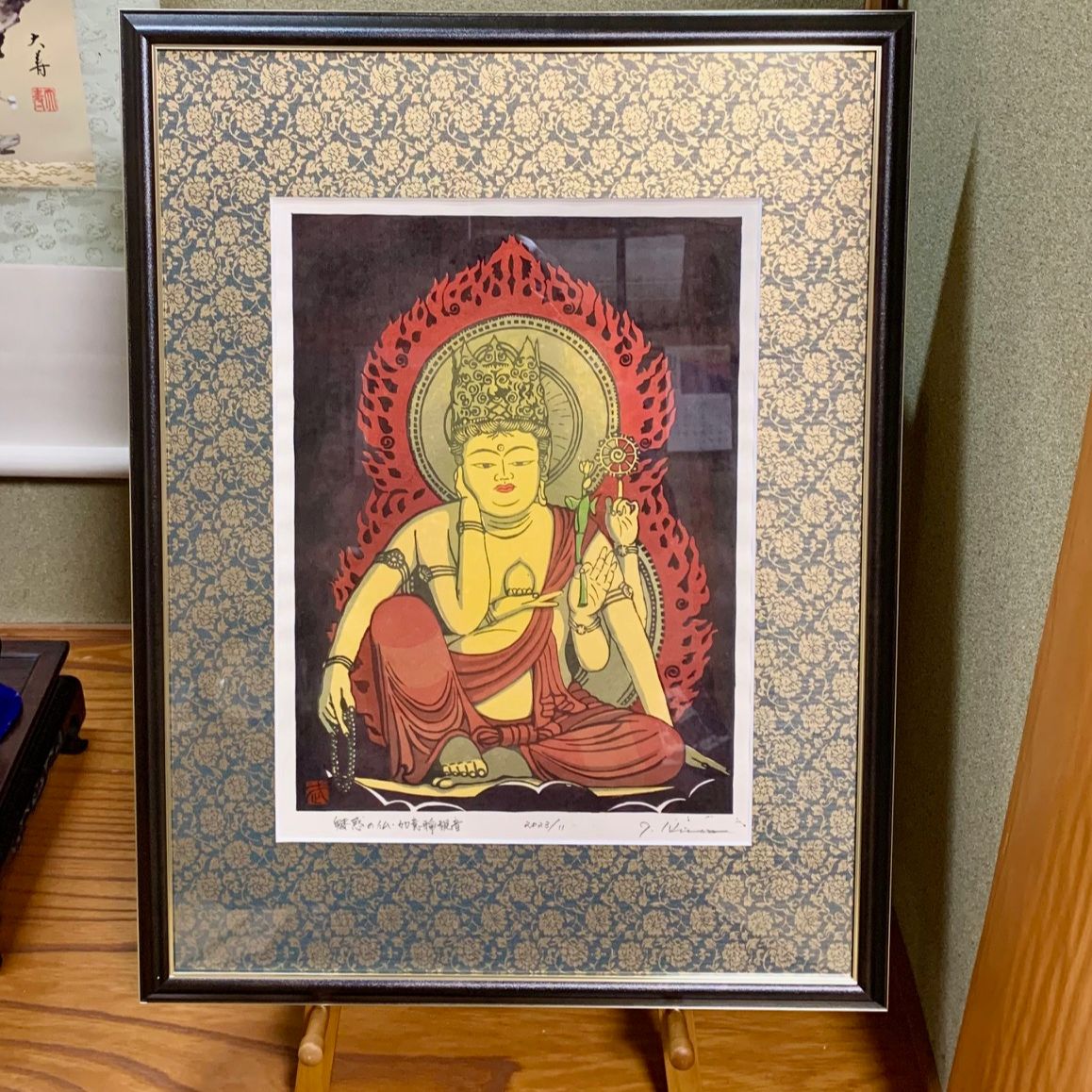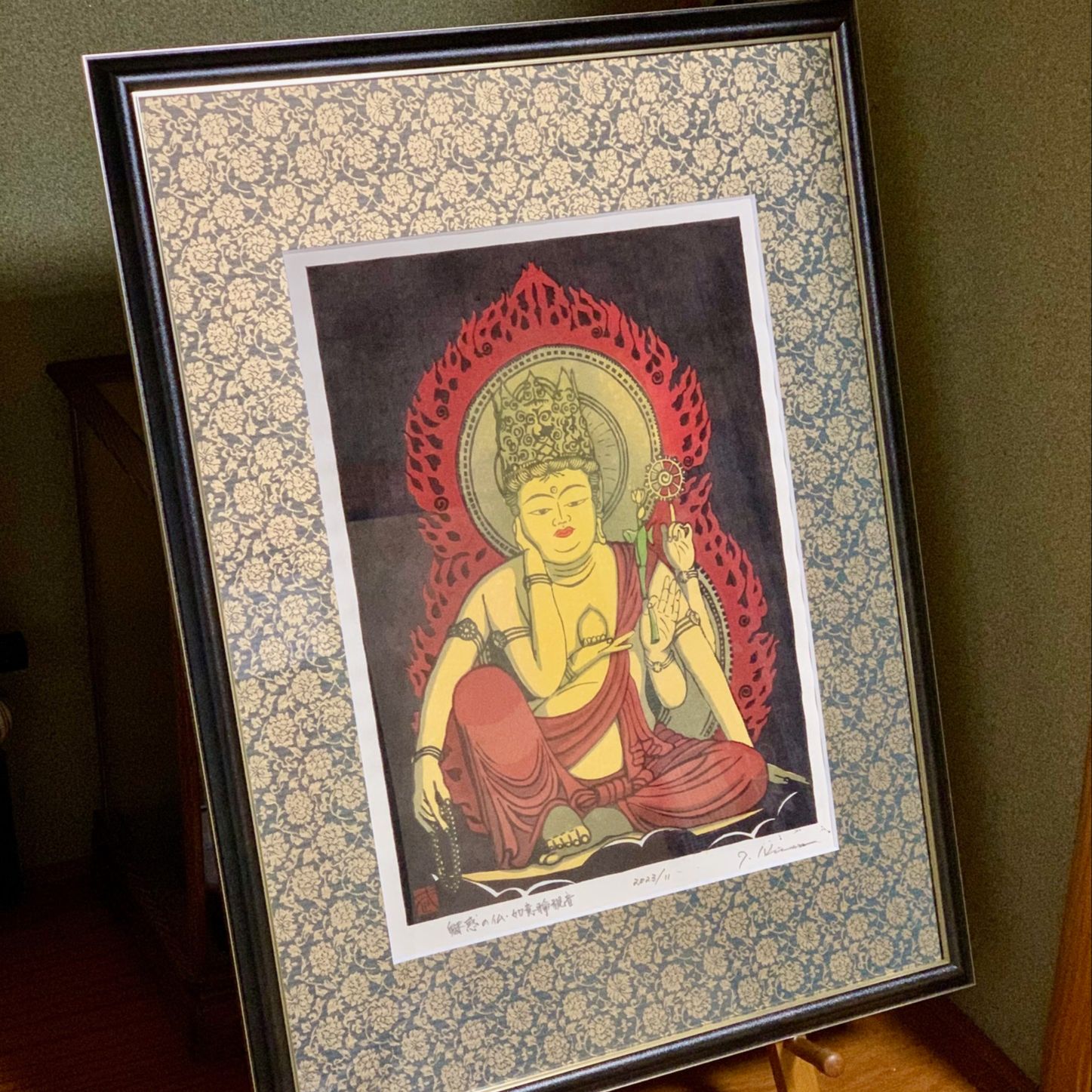 木版画作品「魅惑の仏・如意輪観音坐像」を額装しました。掛軸をイメージして額縁およびマットを選択しました。