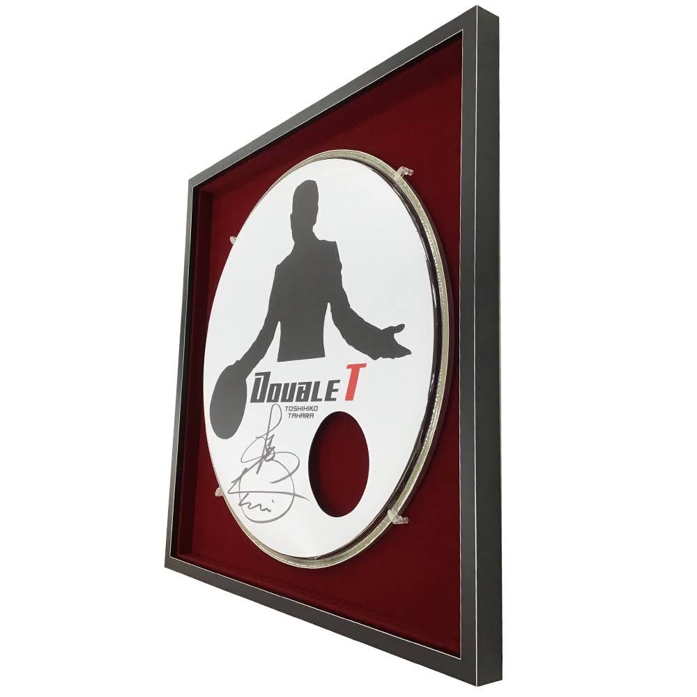 「TOSHIHIKO TAHARA」とドラムヘッドに書かれているということは...田原俊彦さんのサインでしょうか....サイン入りのドラムヘッドを額装させていただきました! BOX型のフレームに爪型の金具と、落下防止のためにドラムヘッドのフチの部分を軽く両面テープで留めてあります! 黒のフレーム(B-10152)でキリッと引き締め、背景をスエードの効いた赤の布にする事で高級感を出しました!