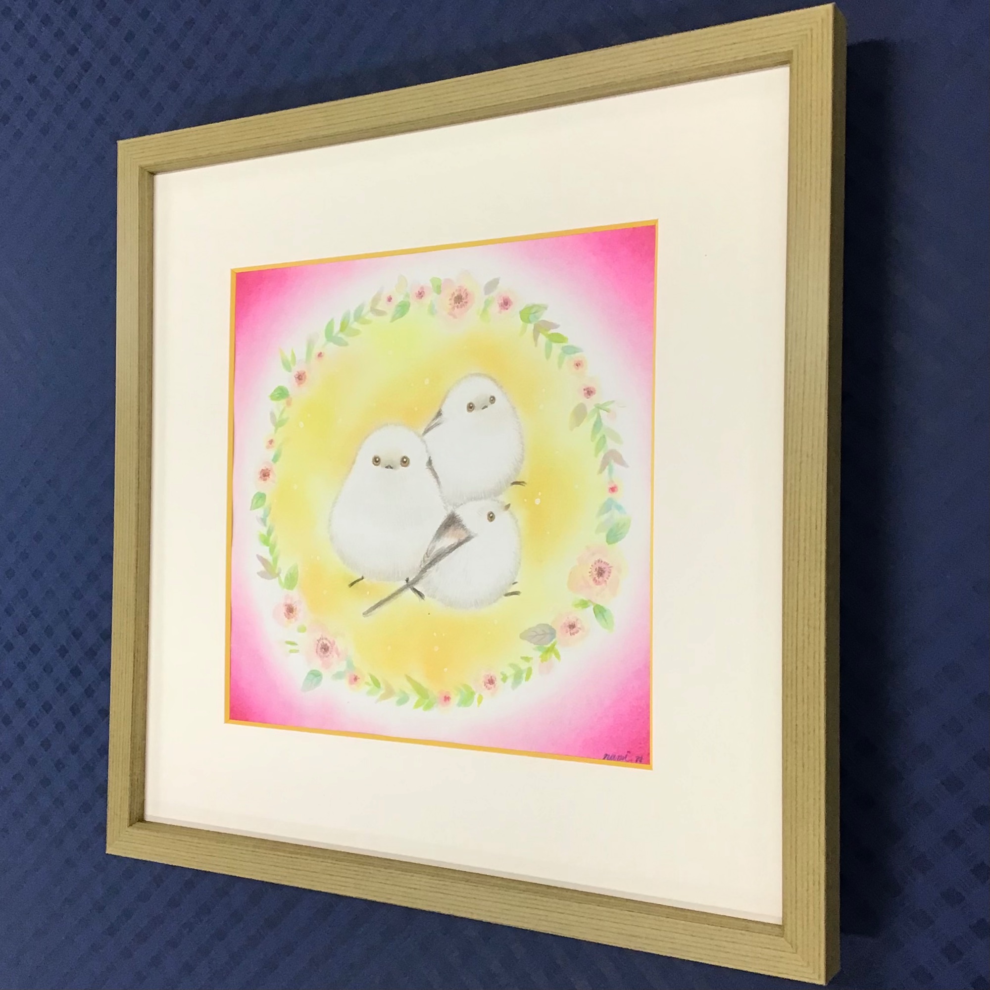 @shimaenaga_nami 様のパステル画を額装しました! 可愛らしいタッチで描かれている「雪の妖精」シマエナガ...こちらの作品は昨年の8月4日〜8月6日まで、北海道の家具工房『旅する木』にて開催された「旅するシマエナガさん」にて展示されたものです。 展示期間中に何枚か他の作品を投稿させて頂きましたが、まだ投稿されていない写真が残っていたので、期間は過ぎてしまいましたが、季節的にもシマエナガさんにピッタリな時期ですし、せっかくなので投稿させていただきました! 使用したフレームは「BH-W01F グリーン 30角」、マット切り口が黄色になっているマット(10072)です!