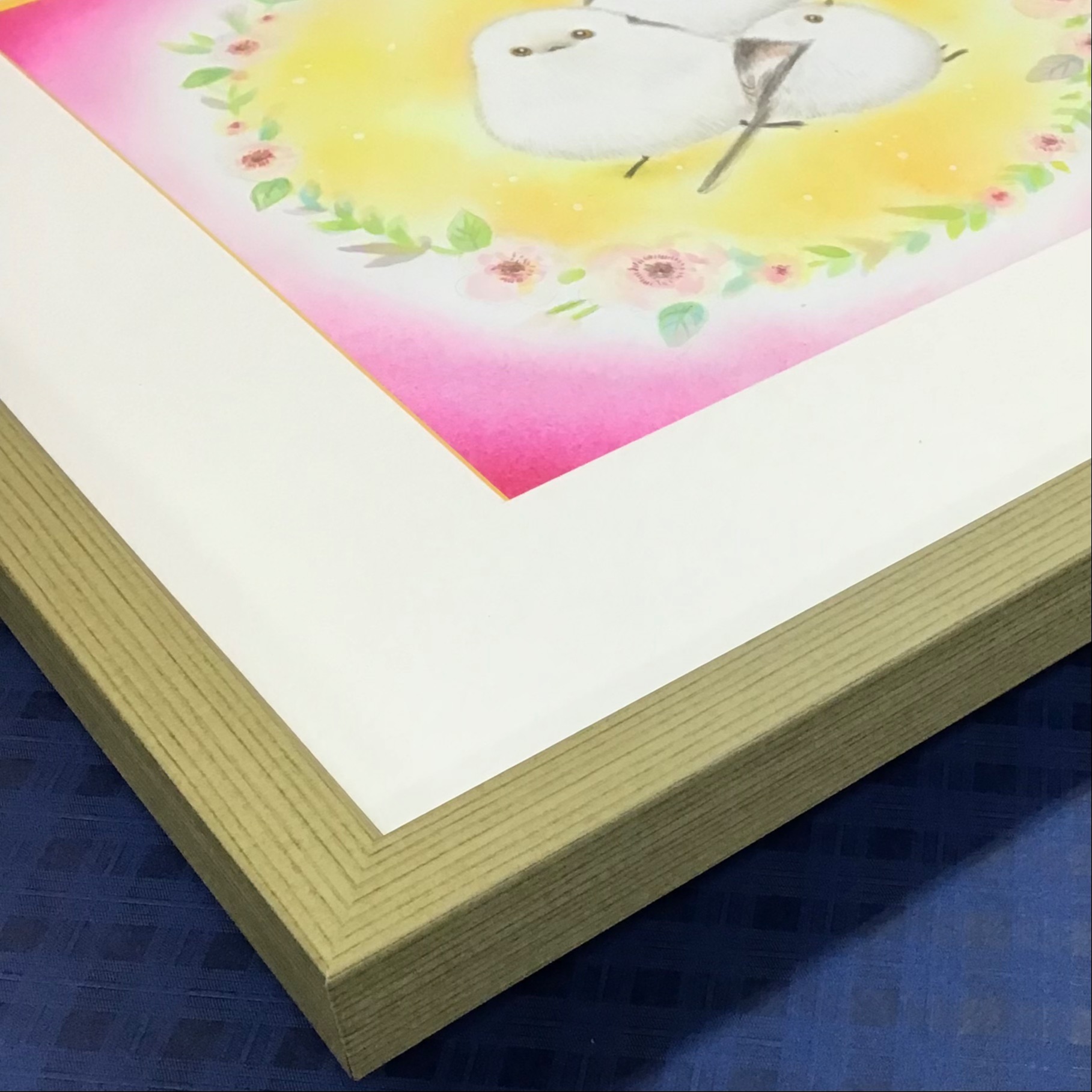 @shimaenaga_nami 様のパステル画を額装しました! 可愛らしいタッチで描かれている「雪の妖精」シマエナガ...こちらの作品は昨年の8月4日〜8月6日まで、北海道の家具工房『旅する木』にて開催された「旅するシマエナガさん」にて展示されたものです。 展示期間中に何枚か他の作品を投稿させて頂きましたが、まだ投稿されていない写真が残っていたので、期間は過ぎてしまいましたが、季節的にもシマエナガさんにピッタリな時期ですし、せっかくなので投稿させていただきました! 使用したフレームは「BH-W01F グリーン 30角」、マット切り口が黄色になっているマット(10072)です!