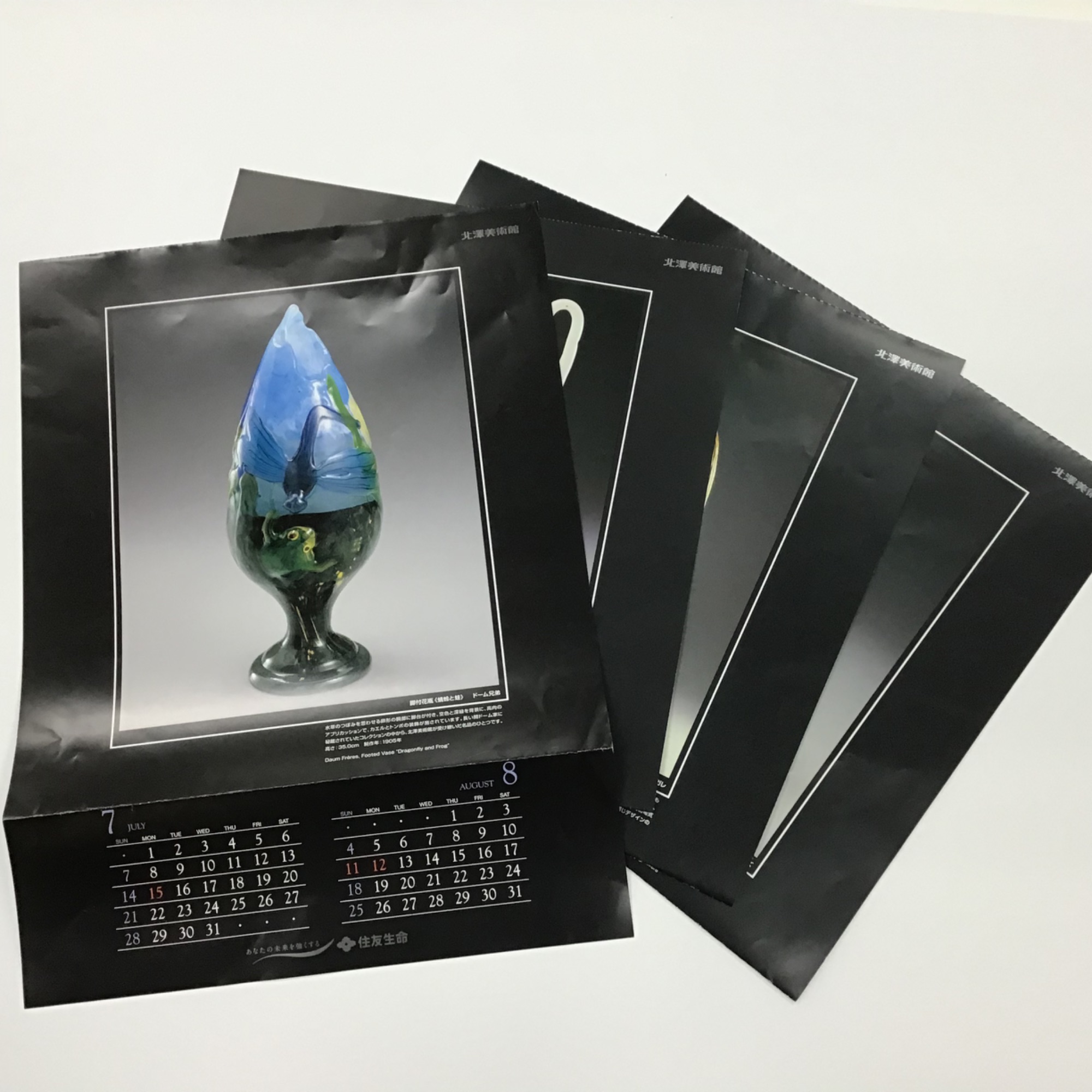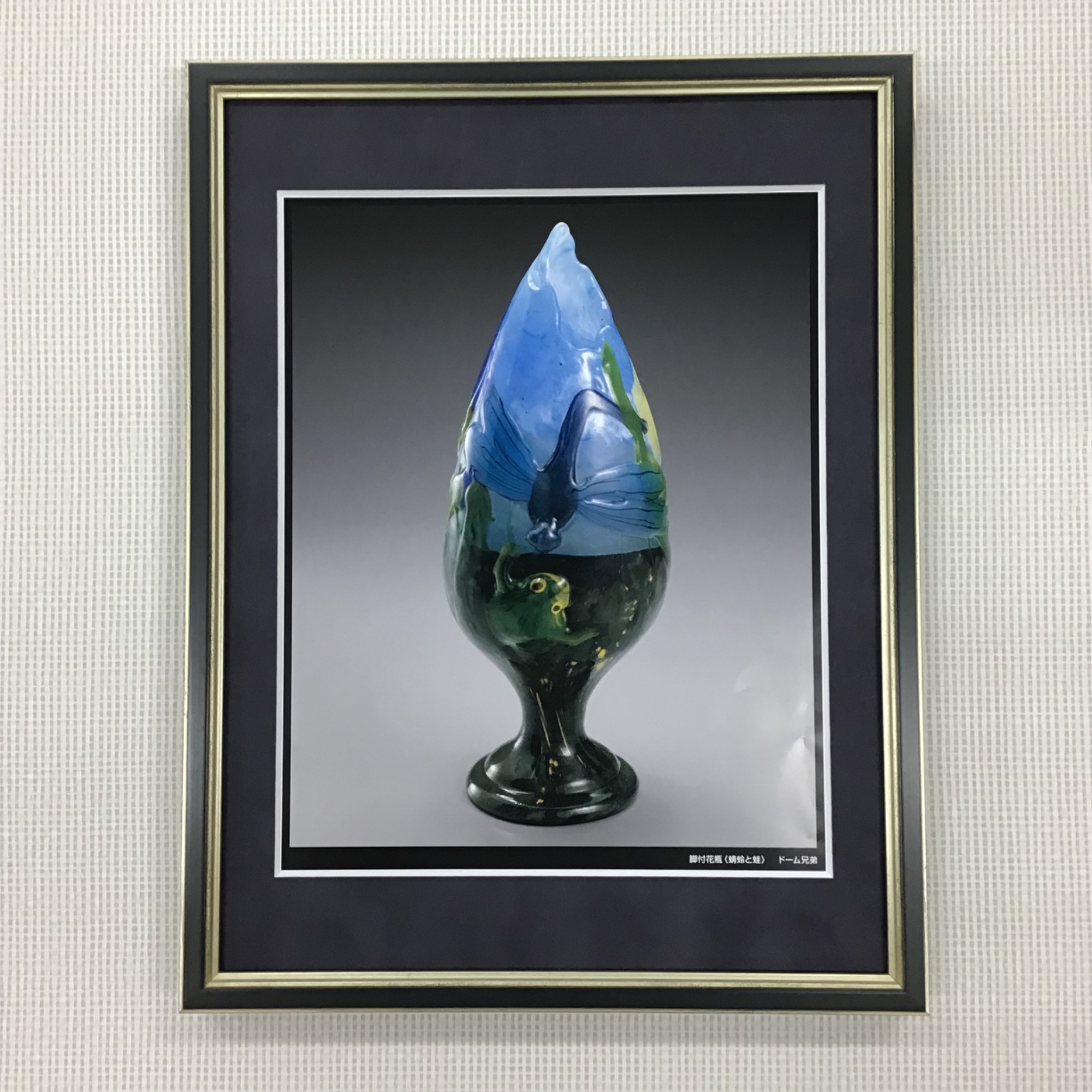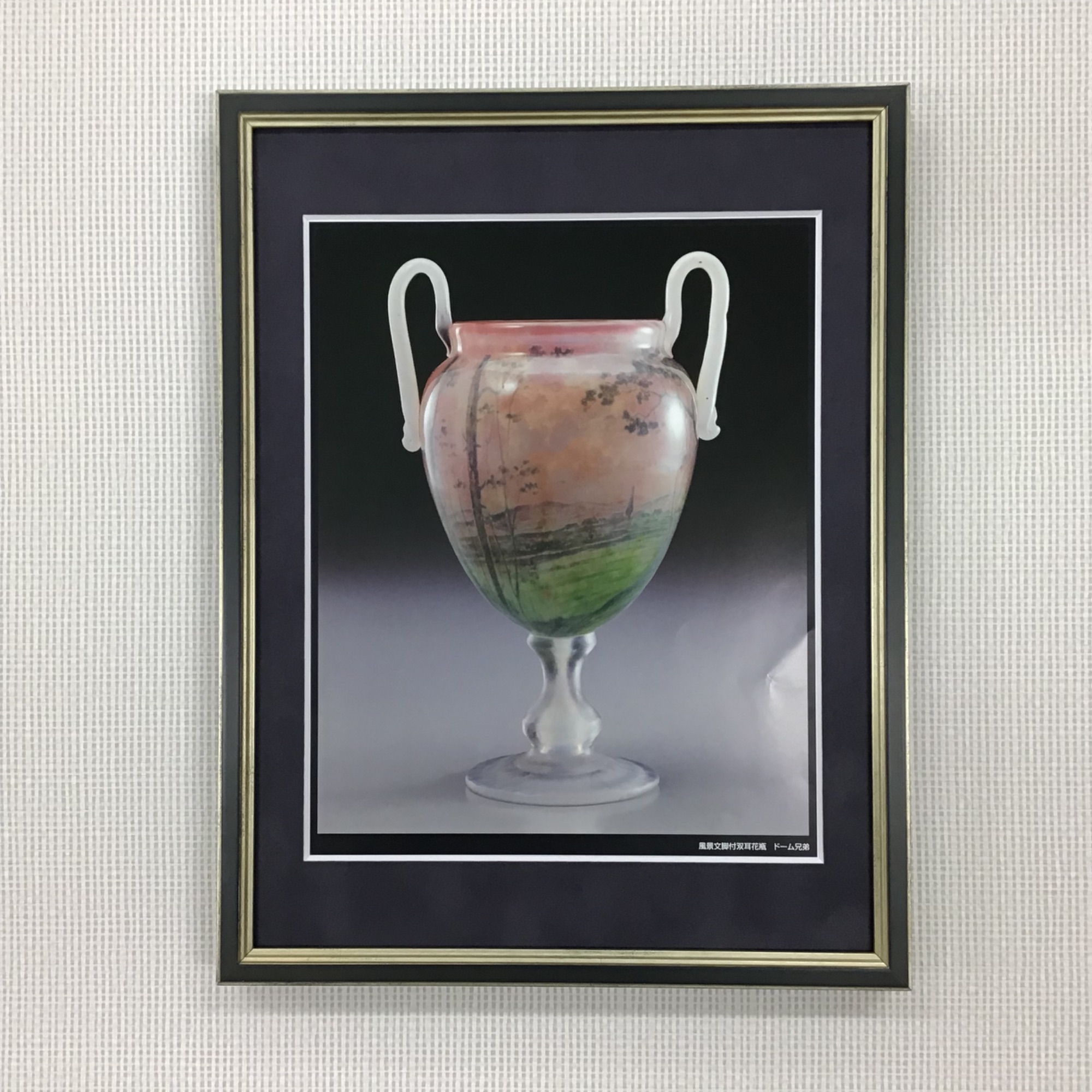 カレンダーのページを額装しました。 こちらは長野県諏訪市にあります「北澤美術館」様にて、毎年販売されているカレンダーです。 「北澤美術館」様は、エミール・ガレ、ドーム兄弟、ルネ・ラリックなど著名な作家のガラス工芸品を中心に所蔵されており、ガラス工芸品の他に現代日本画なども展示されています。 今回額装させていただいたカレンダーには、およそ1000点ある所蔵作品から選ばれた数点の作品のお写真が掲載されています。 使用した額は「サマルカンド 銀青と金茶/太子サイズ」、マットは表面にスエードの貼られた「24608/スエード灰紫」です。 「アンティーク家具と調度品のある部屋に飾るので、高級感のある感じにしたい」とのご依頼でしたので、高級感のある布貼りマットをお勧めしました。 お客様とのご相談の結果、統一感を出すためにマットは落ち着いた紫色に揃えつつ、フレームは渋い金色や銀色のラインが入った「サマルカンド」を選択し、写っている作品の色ごとに銀青と金茶を使い分けることにいたしました。 飾られるお部屋の雰囲気に合う、上品な仕上がりになったと思います。