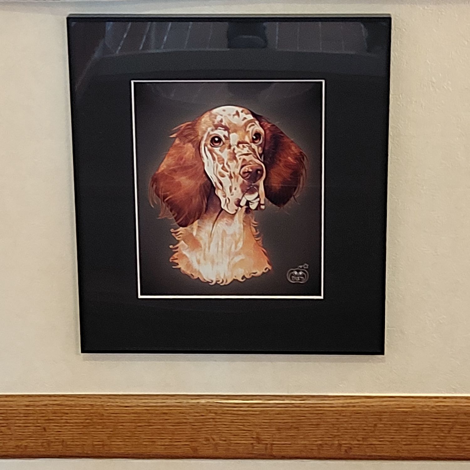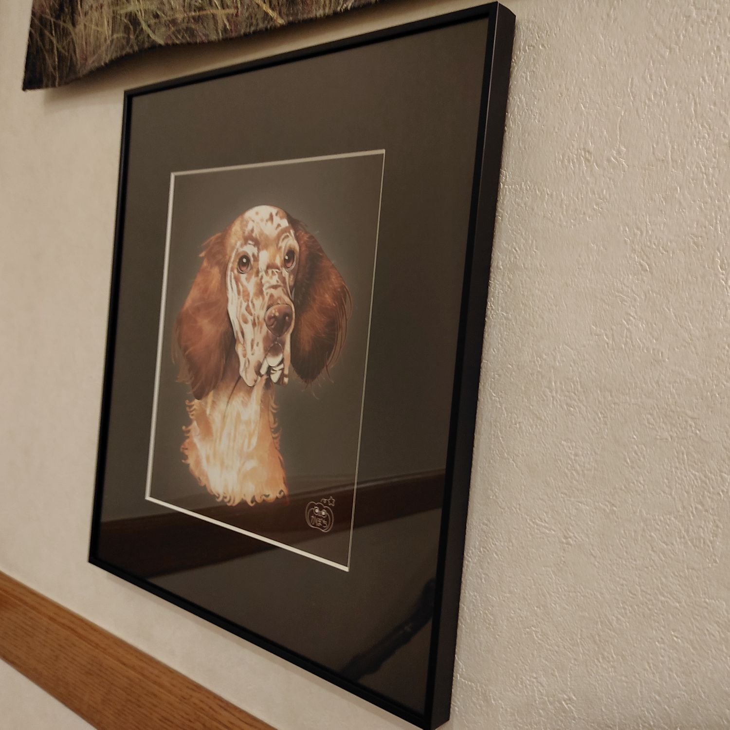 写真額AP-300 四つ切サイズ 愛犬のイラストです。 フレームとマットの黒に、イラストの背景色を合わせてみました。
