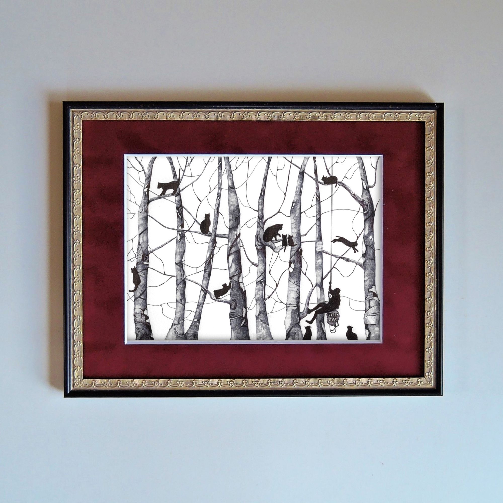 樹に登って降りられなくなった猫を助けるアーボリストの活躍がテーマのペン画です。 アメリカにあるCanopy Cat RescueというNPOのことを知り、描いてみました。 展示でこの作品を見たお客様から、「銅版画かと思った」というご感想をいただきました。 スタイリッシュな雰囲気の作品なので、赤・黒・金の洗練されたイメージの額を合わせてみました。