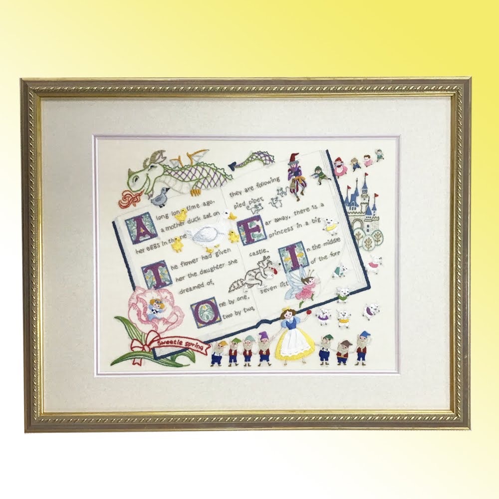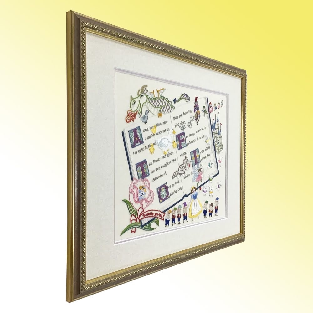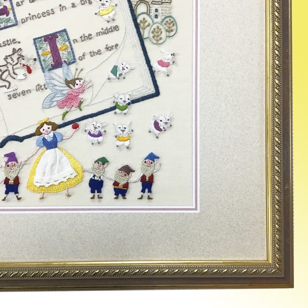 絵本の世界を表現した刺繍を額装しました! 白雪姫に7匹の子やぎ、ハーメルンの笛吹き男に親指姫、などなど...色んな童話が一つの作品にまとめてあります。 使用したフレームは童話の雰囲気に合いそうな「8233 Gブラウン 大衣」、マットはコルク色マット(19002)と落ち着いた桃色のマット(10508)のWマットです!