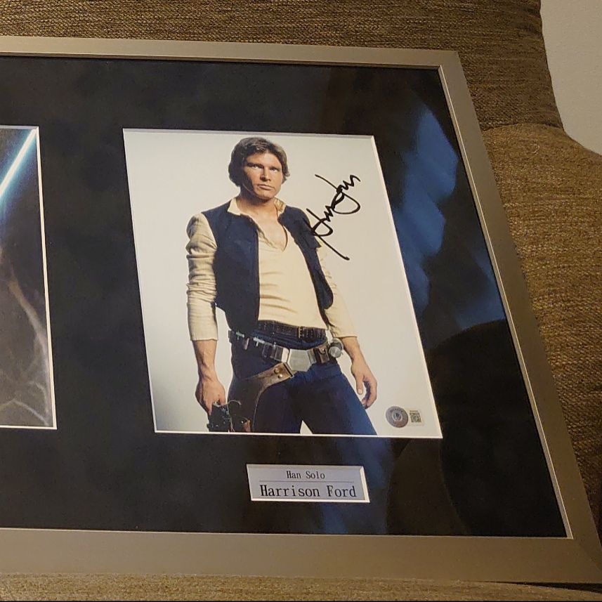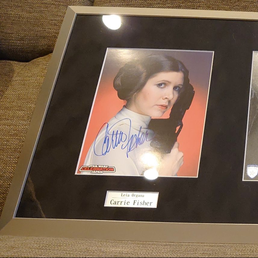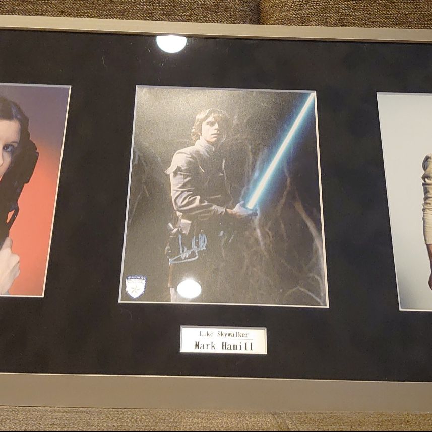 スターウォーズEP4~EP6よりメインキャラ俳優3名キャリー・フィッシャー/マーク・ハミル/ハリソン・フォードそれぞれのオートグラフを一枚の額に額装していただきました。(マット:スエード黒/フレーム:フラップ マットシルバー)
