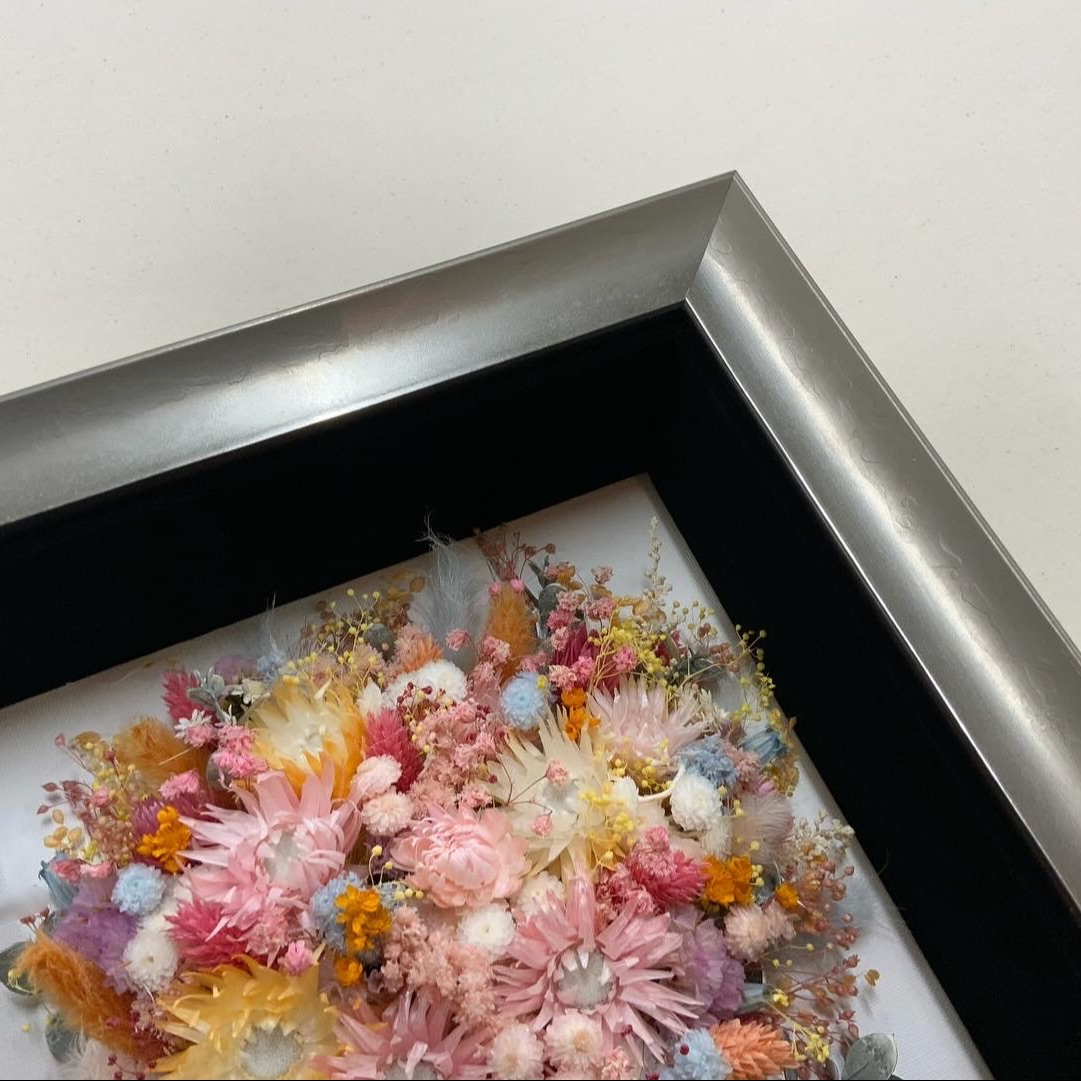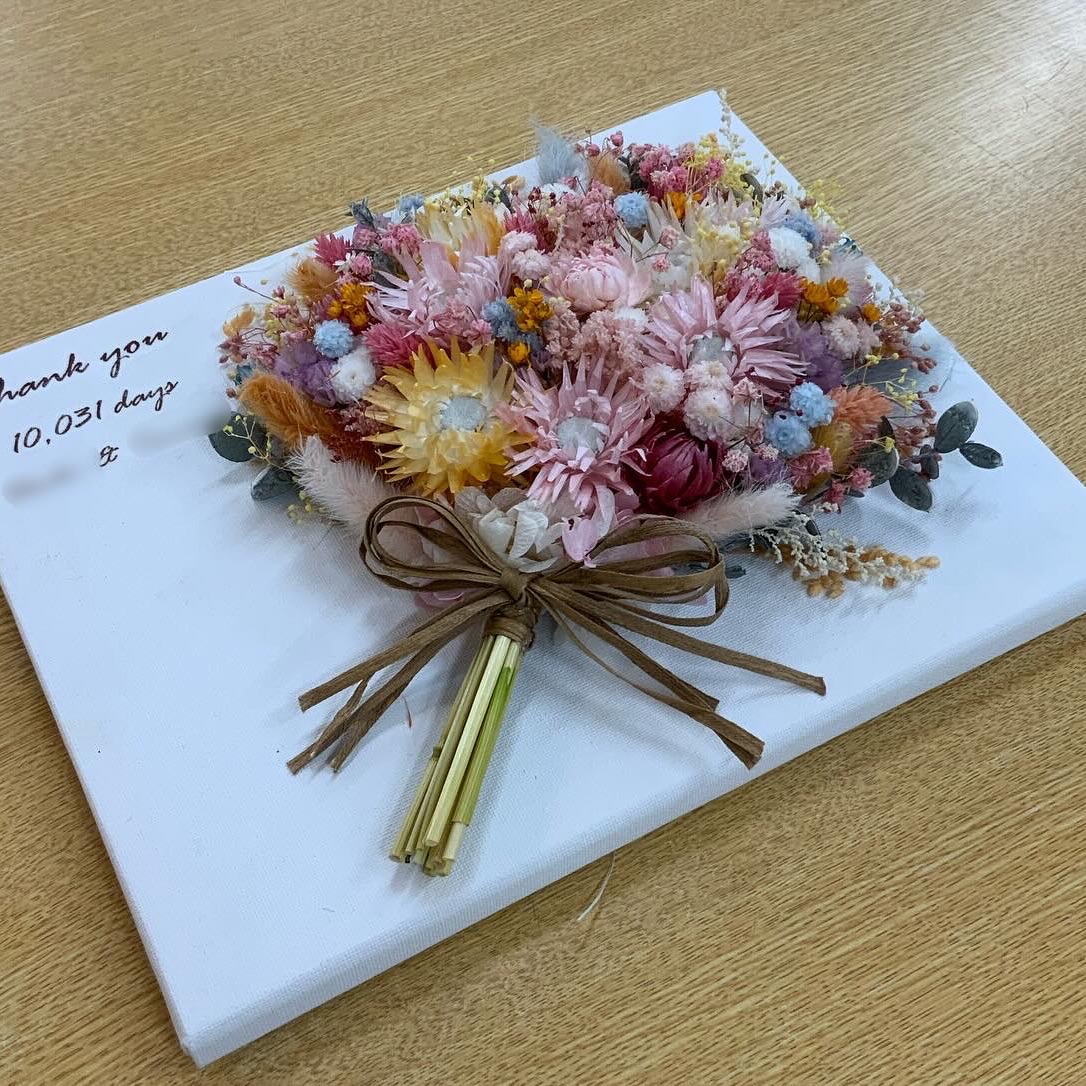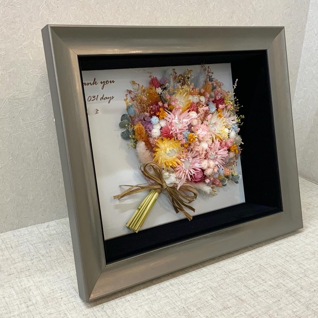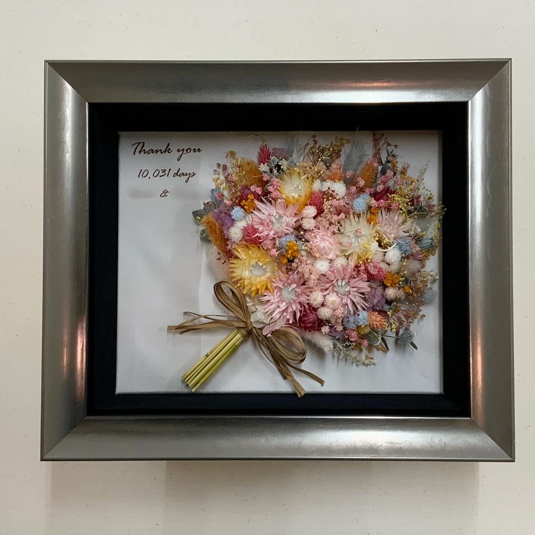 綺麗なキャンバスフラワー。 お子様の結婚式にて、ご両親への贈答品として贈られたお品物です。 「10031days」はお子様が生まれてから結婚式当日までの日数。「今日この日を迎えられたのは お父さん、お母さんが今日まで育ててくれたおかげです。ありがとう。」の気持ちがギュッと詰まっています。いただいた時の感動を忘れないようにと、額装をご注文いただきました。