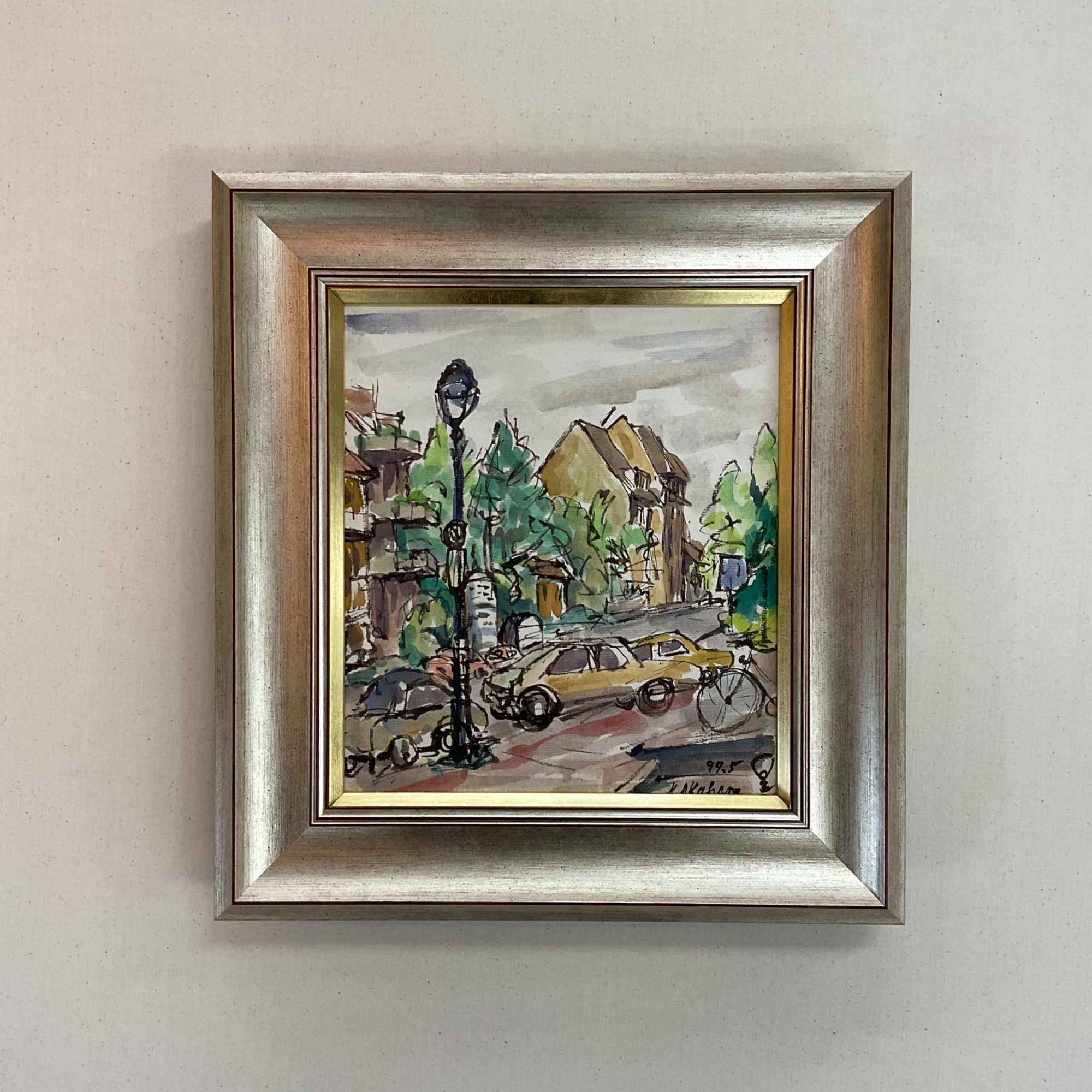 色紙に描かれた風景画。 お父様がたくさんの風景画を残しているそうで、その中でも特にお気に入りの作品二点の額装を承りました。 既製品の色紙額は和風のフレームが多いのですが、今回は是非華やかな印象に仕上げて欲しいと、ご要望をいただきました。 お選びいただいたフレームは8167シルバー。 どちらも、洋間にも合うモダンな額装に仕上がりました。
