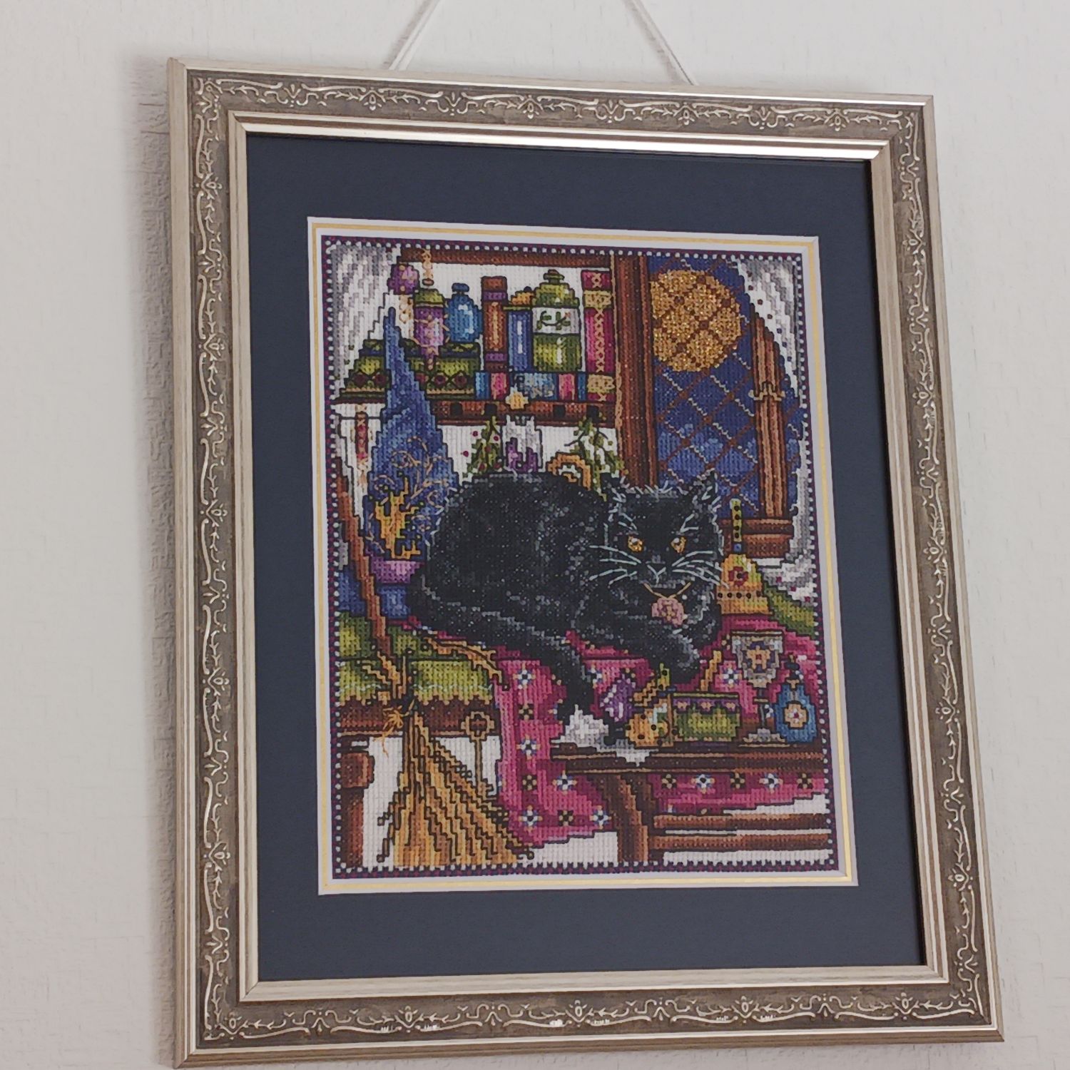 クロスステッチ『月夜の留守番』 全面刺し5作品目。小さな作品の中に色とりどりの魔法薬。バックステッチで引き締まる小物が可愛いです。模様の入った額が絶対に合うと思い即決。満足の作品になりました。