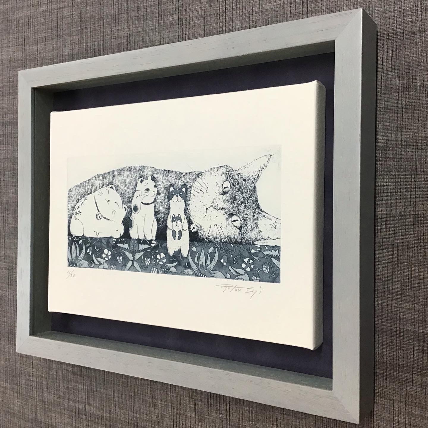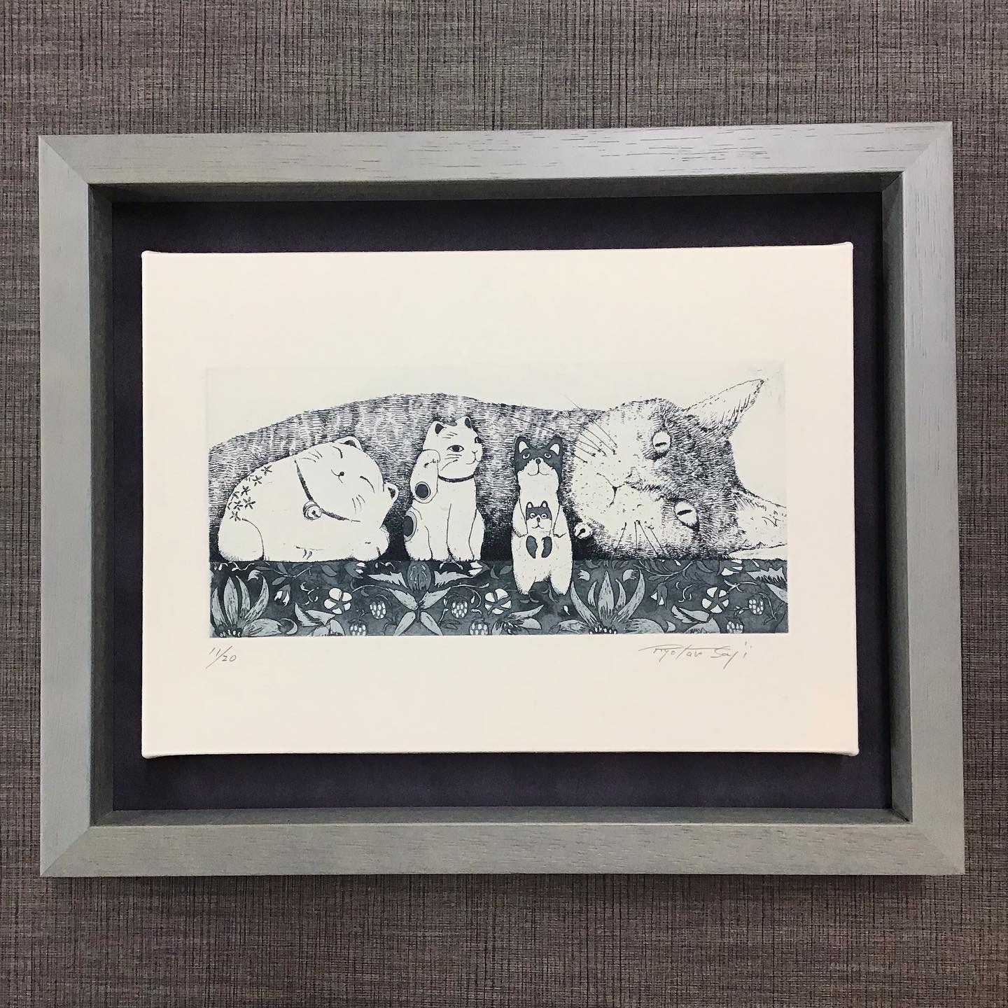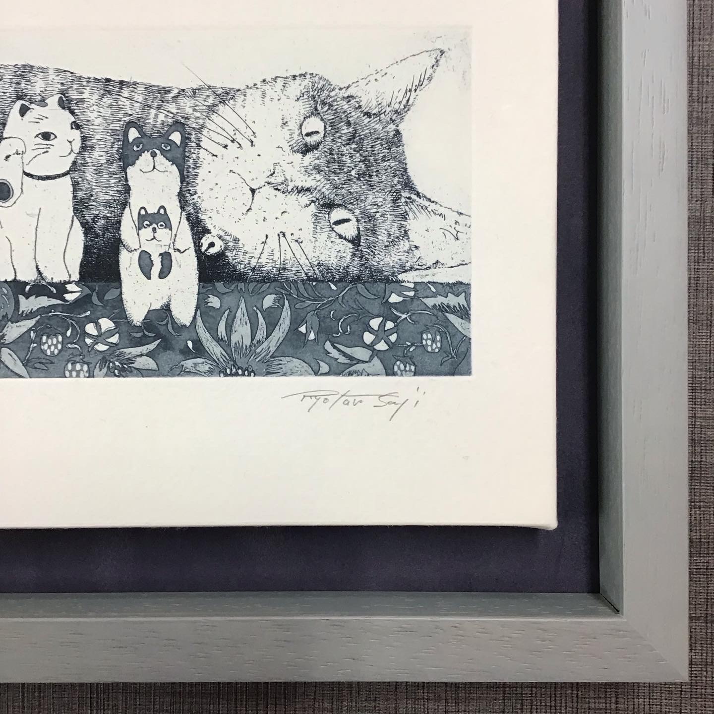 寝転んでいる猫ちゃんがこちらを見ている絵が描かれたパネル画を額装しました! 使用したフレームは「7916歩 グレー 八ツ」、背景に使用したマットはスエード紫色マット(24608)です。 B5サイズのパネル作品なんですが...実はピッタリサイズの額があまりありません。以前に投稿した15角サイズのパネルの時と同様にひと回り大きい立体の額縁に固定して額装しました!