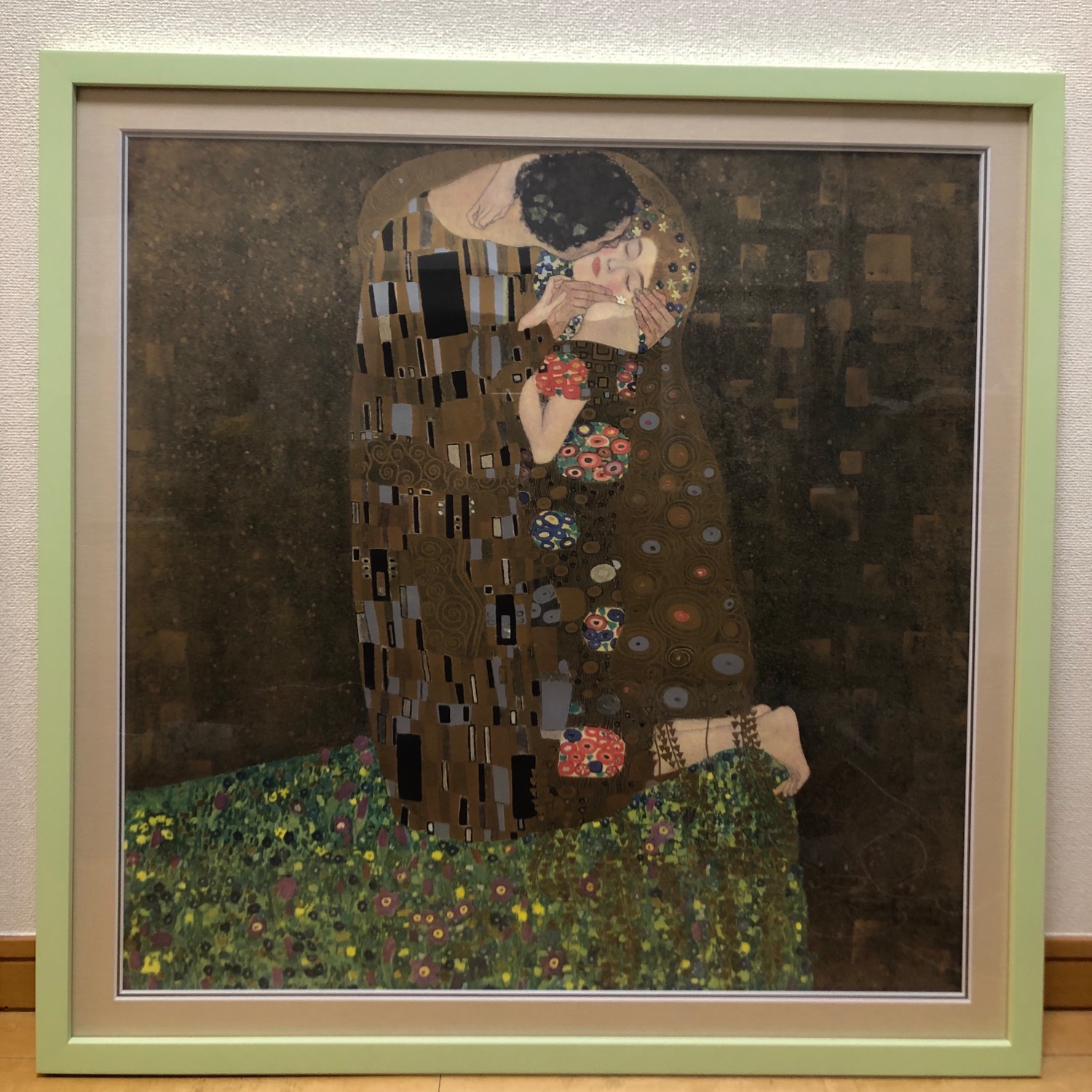 絵に合わせ、自分で額を選ぶのは額装の楽しみのひとつですね♪クリムトは金のイメージも強いですが、今回の作品に使用されている緑に合わせた額とマットの色の効果で柔らかな雰囲気になっていてとっても素敵です✨