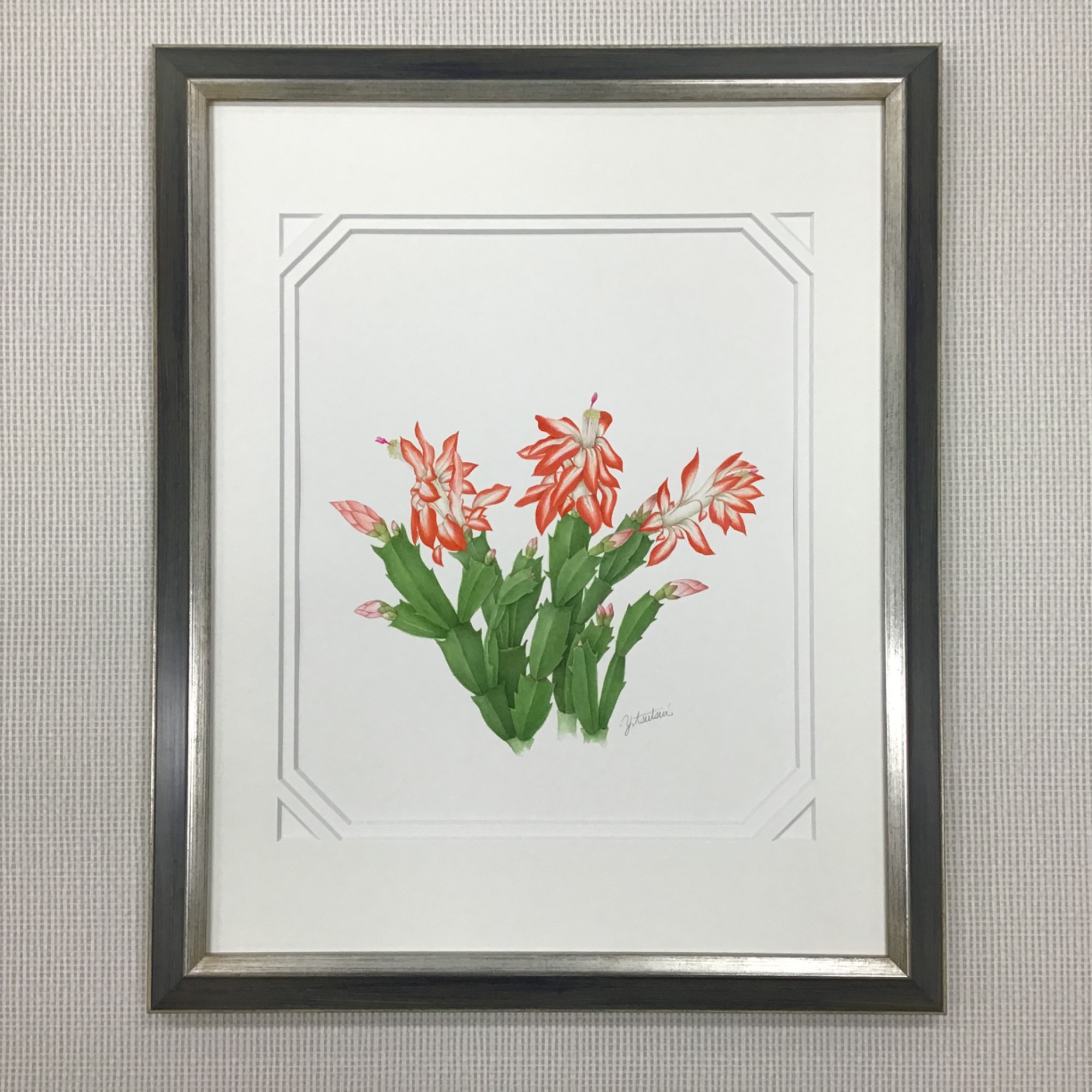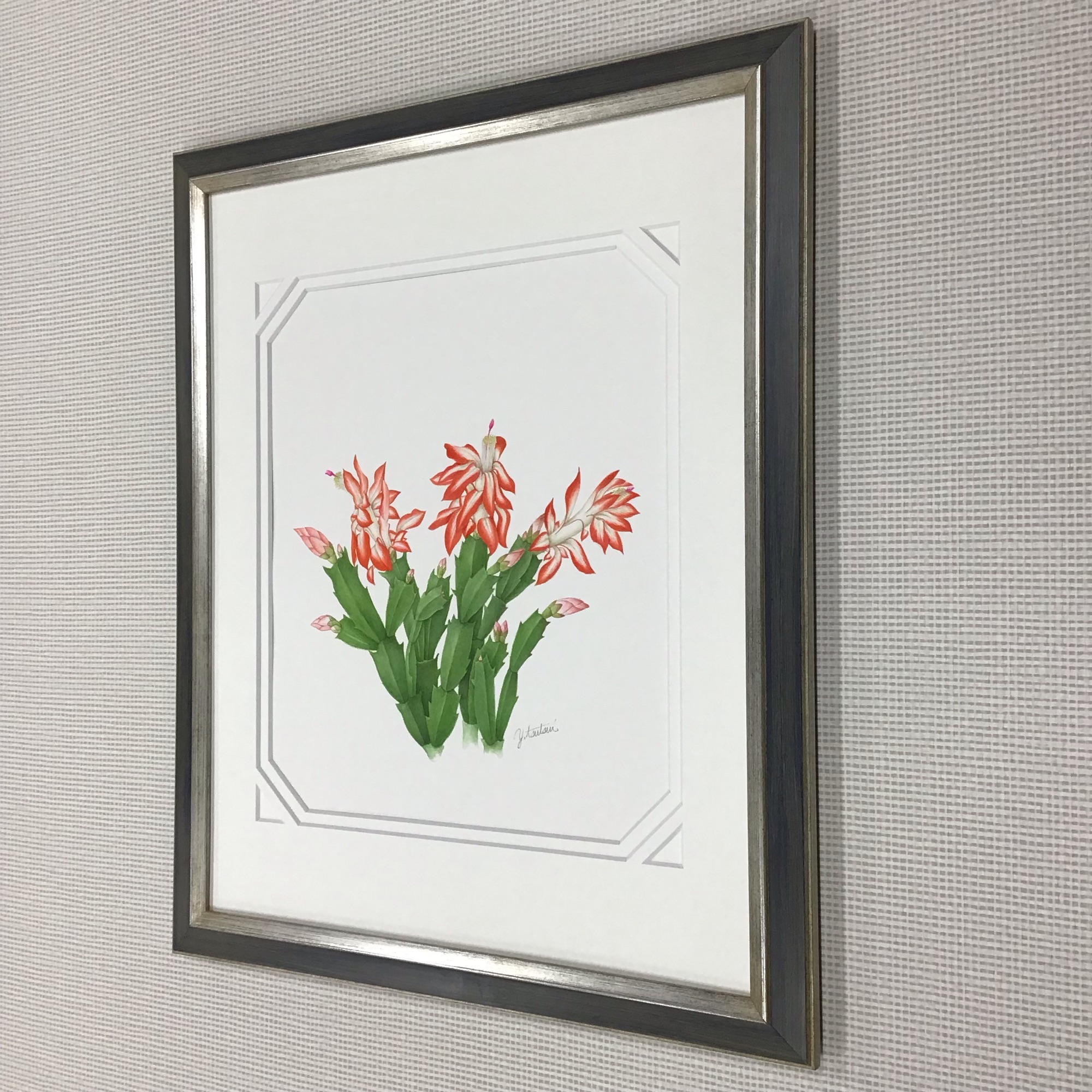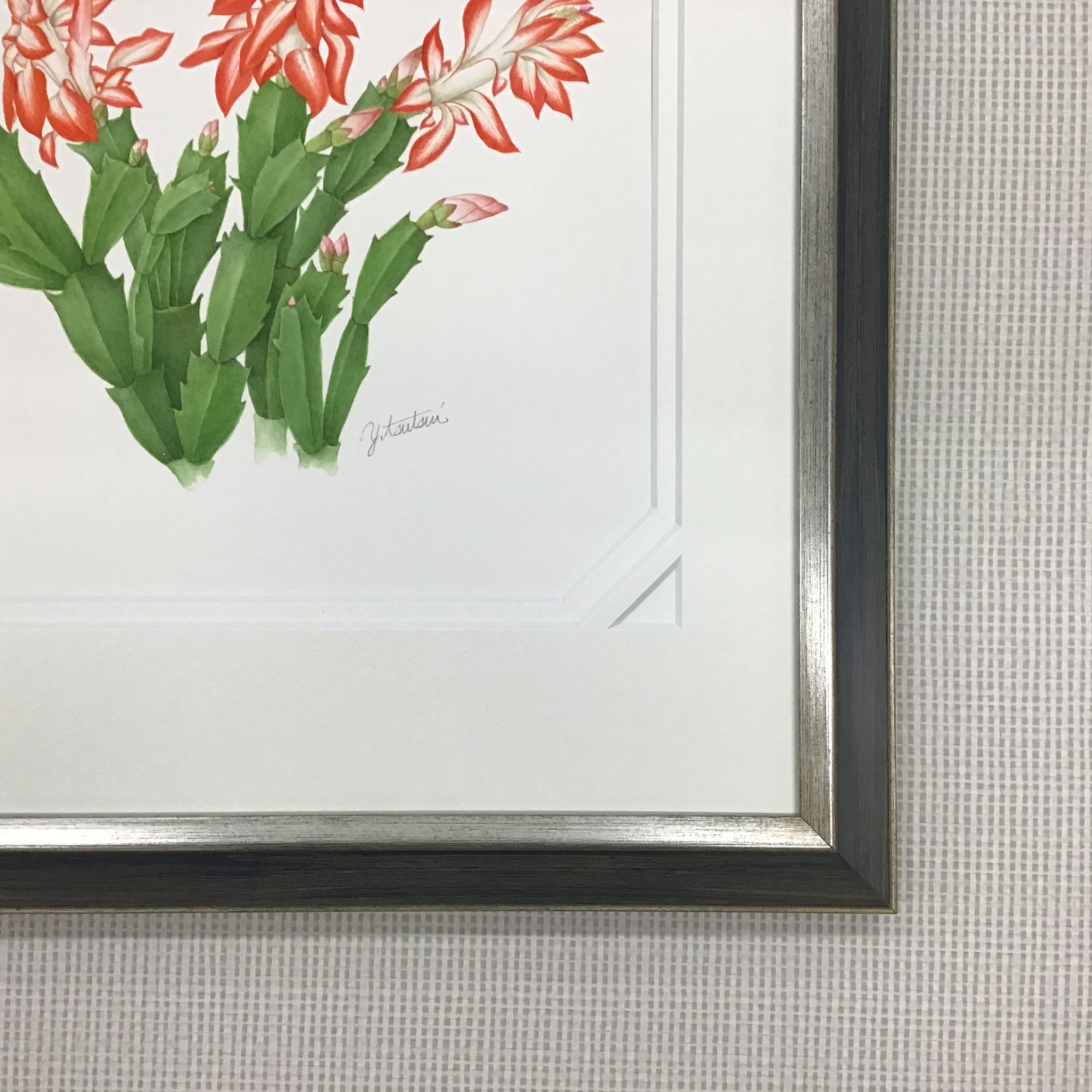 ボタニカルアートを額装しました。 鮮やかな赤い花を付けたシャコバサボテンが、生き生きと描かれています。 今回使用した額は「アルパイン 銀青/水彩F4サイズ」、 使用したマットはWマットの上下ともに白色マット「10043/ワーグマン」。窓の四隅にデザインカットを施しました。 同じ色のマットを重ねる際は、通常より下マットの見え幅を多くとると立体感が出て素敵な仕上がりになります。 また、今回はシンプルな白色マットでも目を引くように、普段とは違った珍しい意匠のデザインカットを重ねてみました。一目で印象に残るようなデザインになったと思います。 他にも様々なデザインカット、組み合わせがありますので、額装の際はぜひご相談ください!