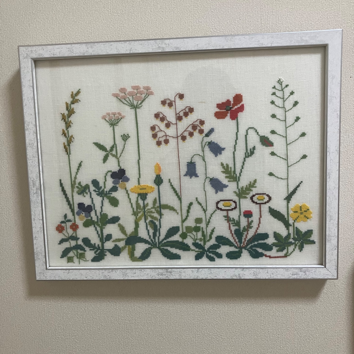 草花のクロスステッチ シンプルな額の内と外に銀のラインが入ってるのでオシャレな仕上がりになりました。