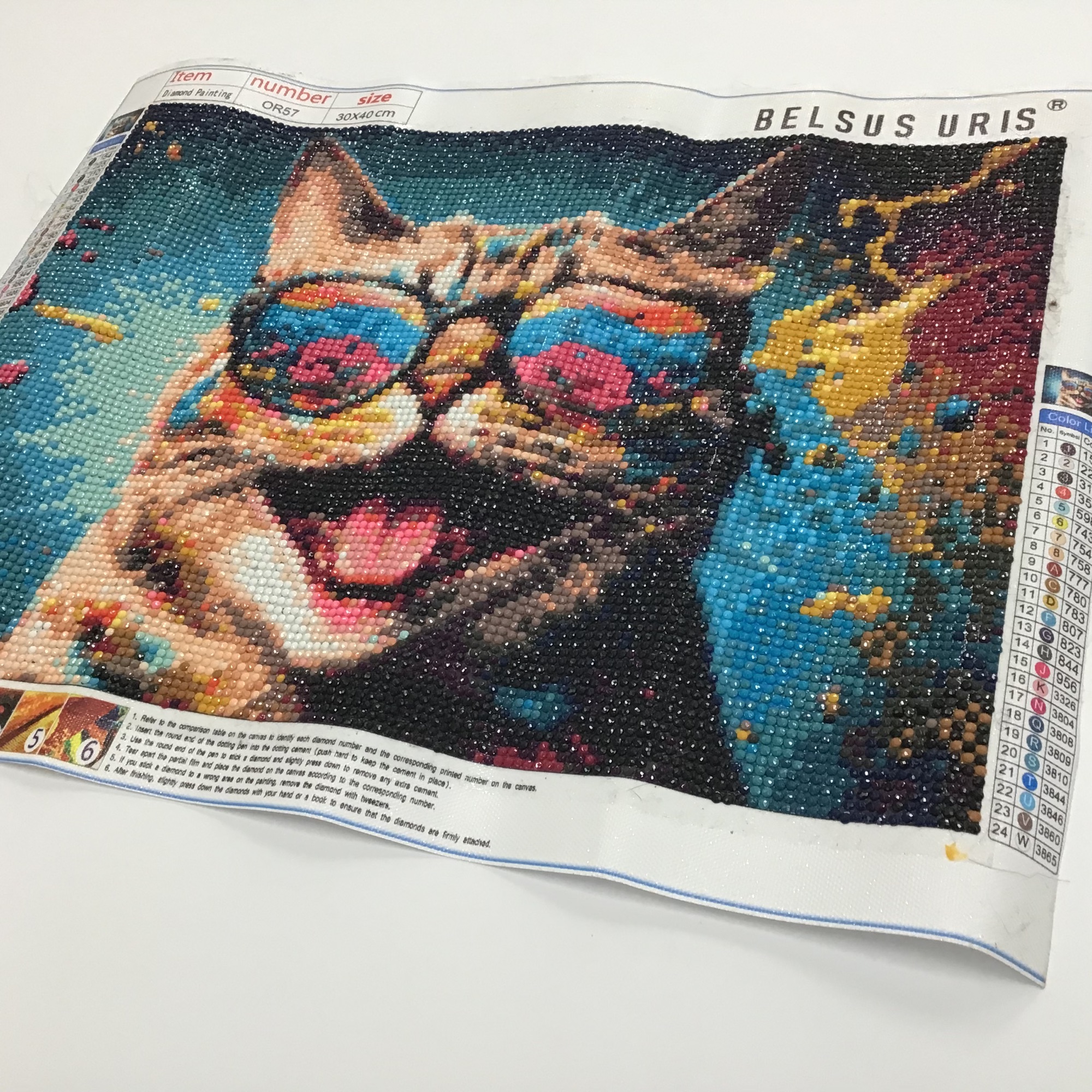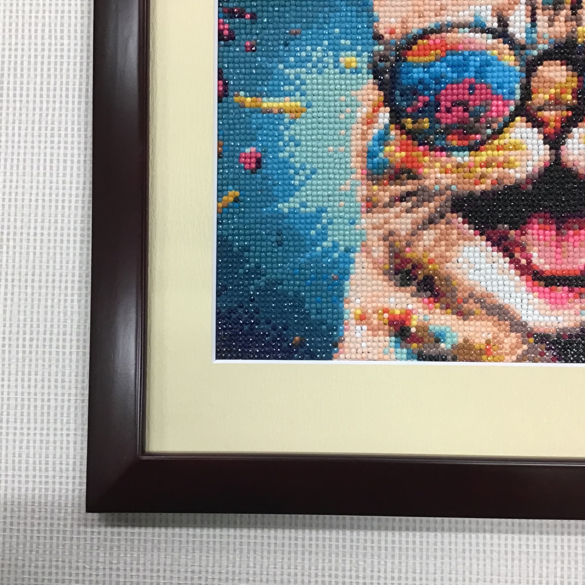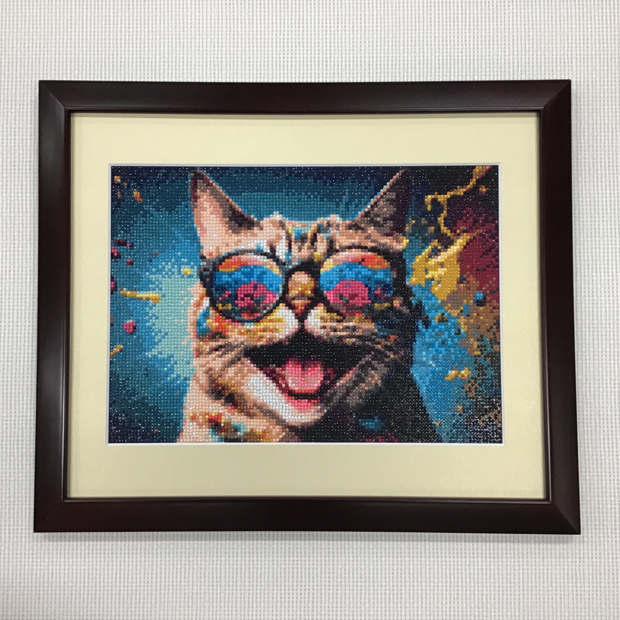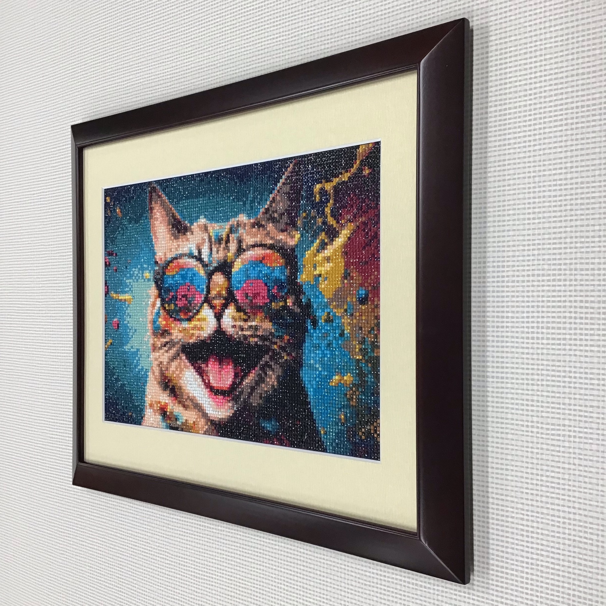 ダイヤモンドアートを額装しました。 見るだけで元気が出そうな色使い・表情をしたネコちゃんです! 今回使用した額は「HK マホガニ/四ツサイズ」、 使用したマットは「20208/砂金」です。 作品に使われている力強い色に負けないように、キラキラした光沢のある砂金色のマットを合わせてみました。 ダイヤモンドアートは額装前に、粘着面をもつ厚紙シートに貼り付けて「たるみ」を取る『裏打ち』加工をしてあります。作業前の写真も載せますので、額装する際の参考にしていただければと思います!