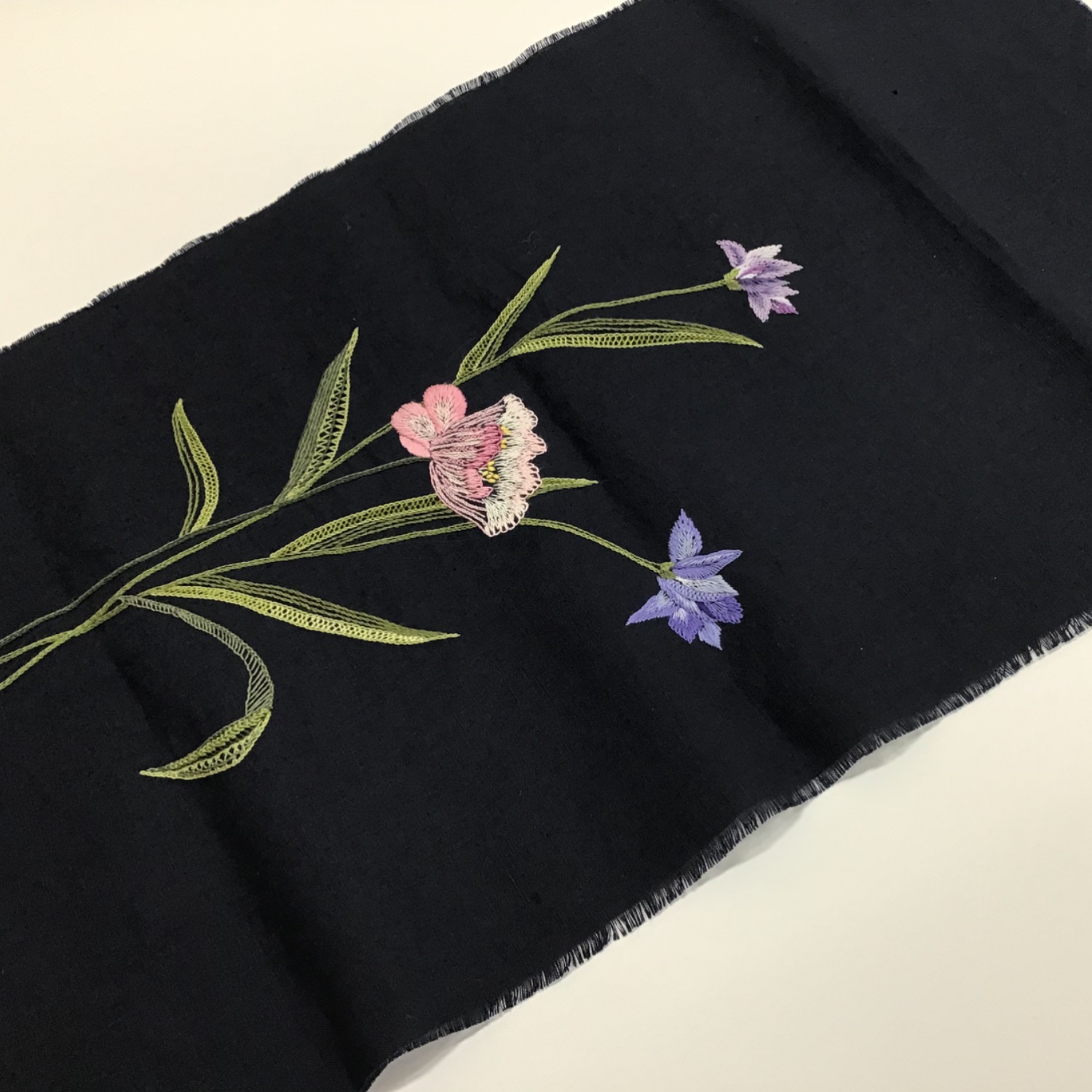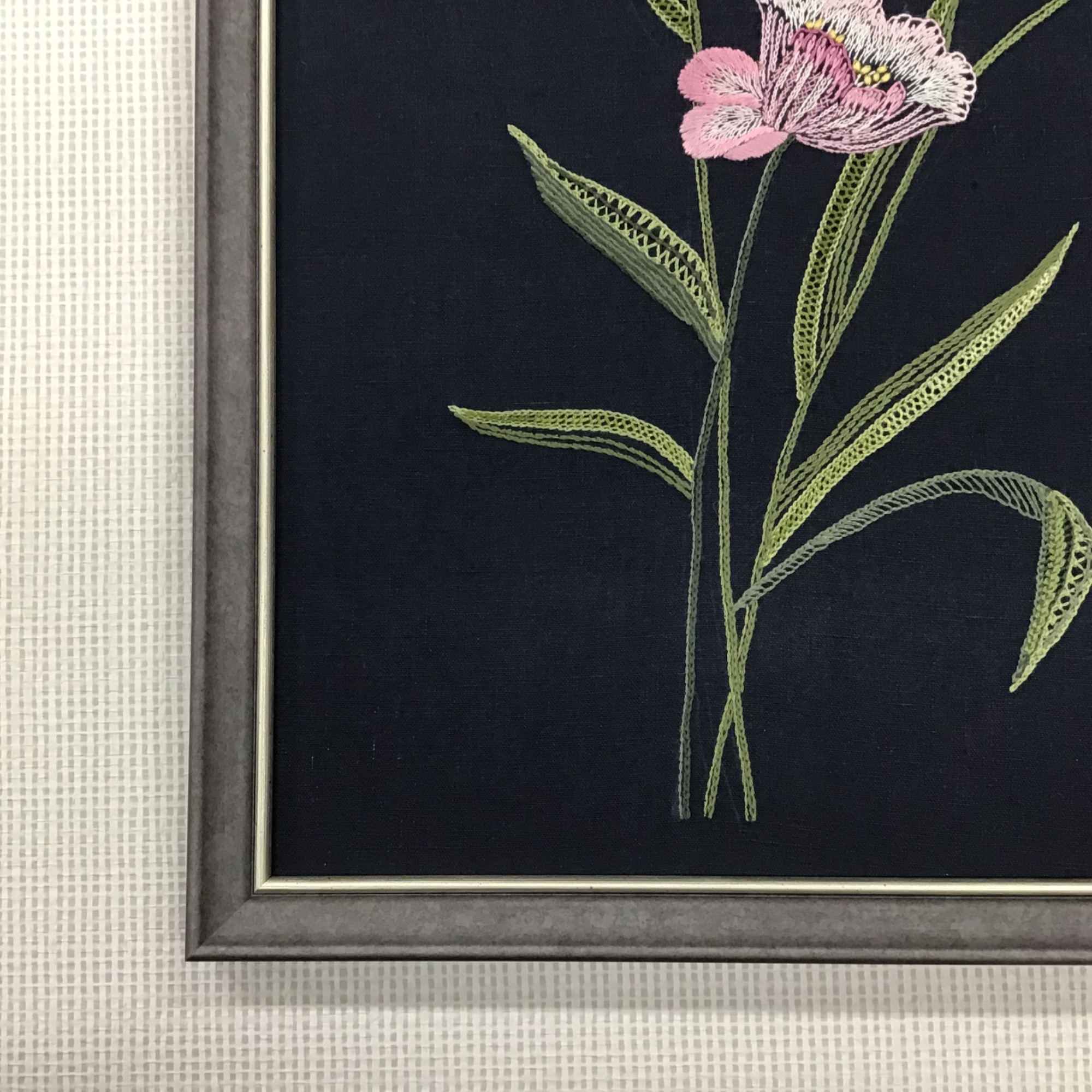 刺しゅう作品を額装しました。 深い黒色の背景の中で、浮かび上がるように咲く鮮やかな花弁に目を惹かれます。 今回使用した額は「8229 ブラック/八号サイズ」です。 額装前に布地の「しわ」や「たるみ」を取る『裏打ち』加工をしてあります。 今回は作品より小さな額に納めたいとのご注文でしたので、お客様の許可をいただいてフレーム内寸に合わせて作品をカットし、額装しました。 刺しゅう作品はマットを付けて額装することが多いですが、今回はお客様のイメージに合うように、あえてマットは省きました。額縁内側の銀色のラインが、より印象的な仕上がりになったと思います。 裏打ち加工前の作品の写真も載せますので、額装する際の参考にしていただければと思います!