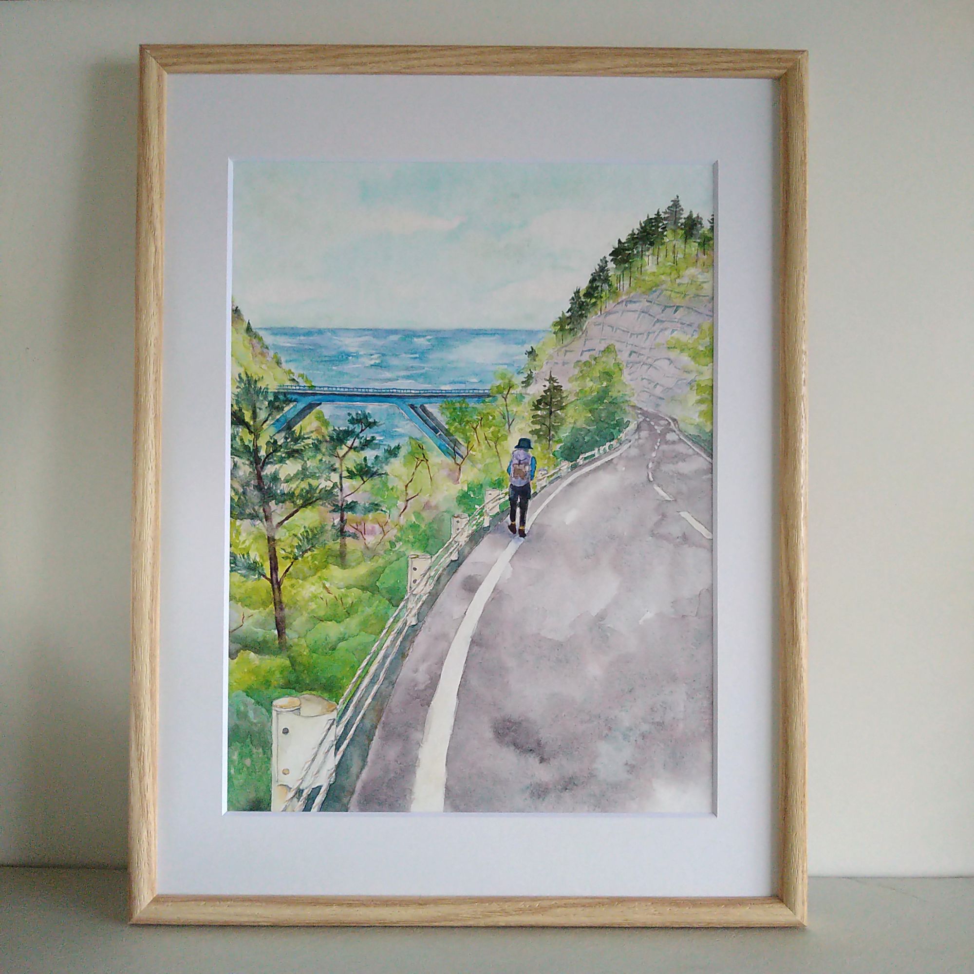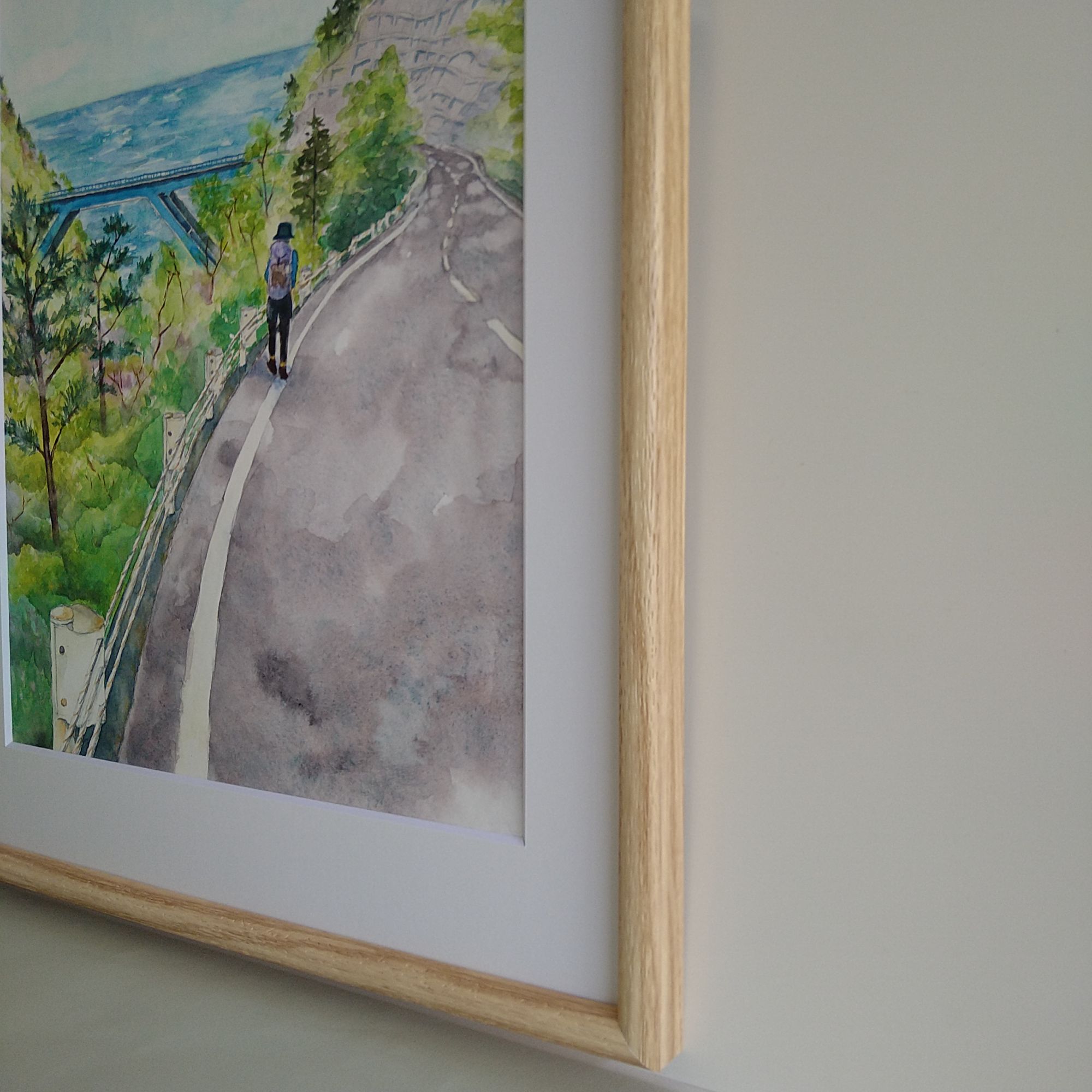 透明水彩で描かれた風景画を額装しました。 明るい春の雰囲気がシンプルに伝わるように、額はアーチフレームPSのナチュラル、マットはオフ白10040を選びました。