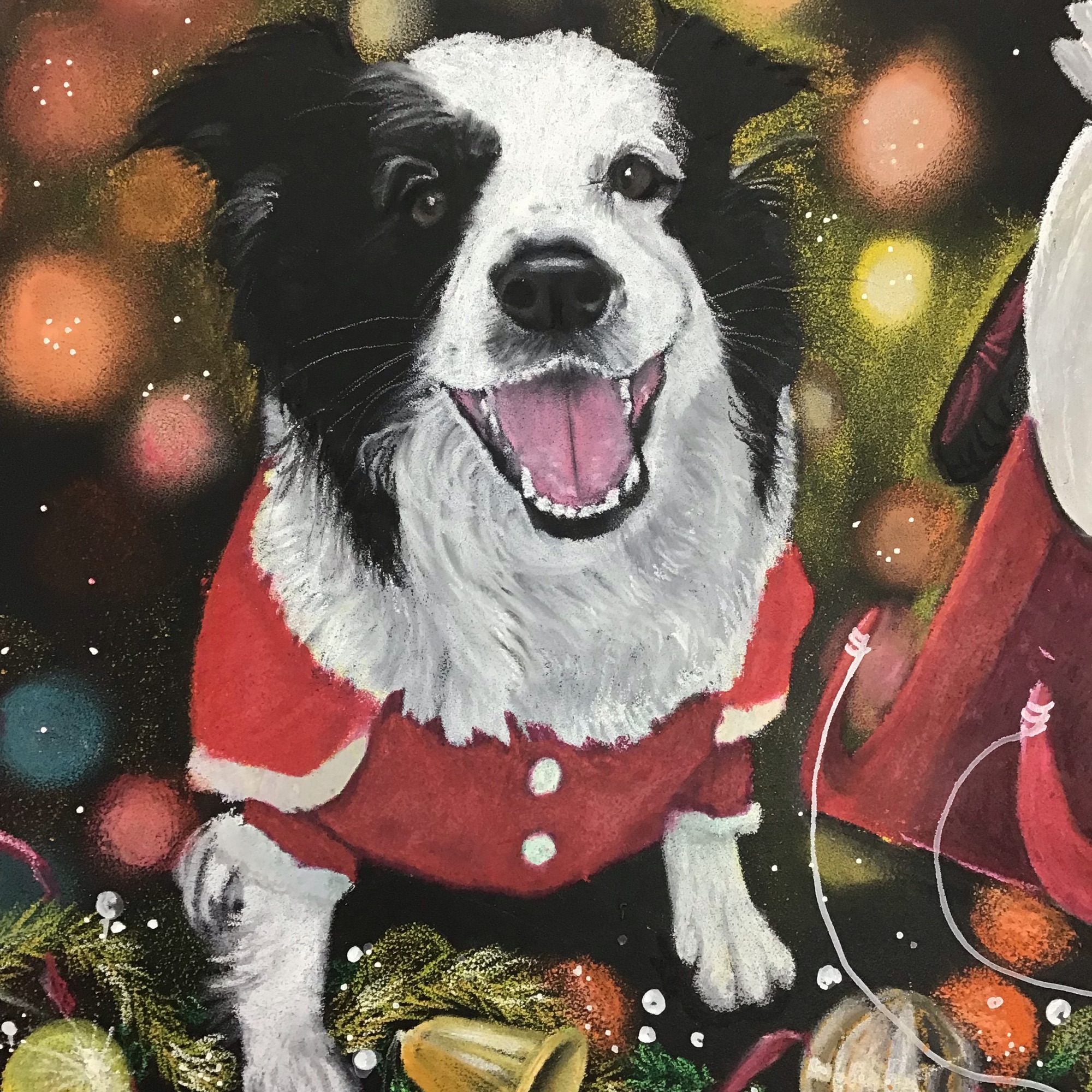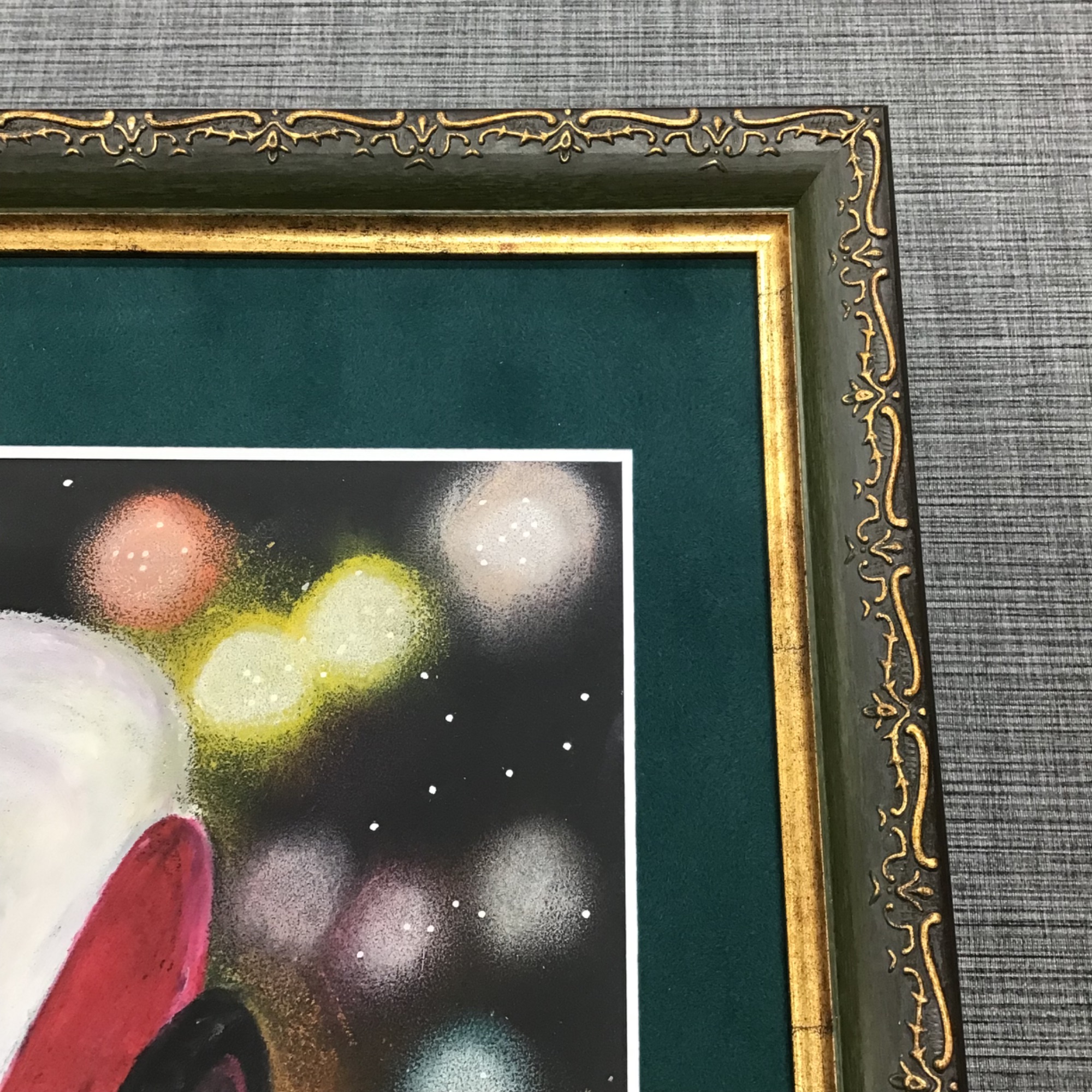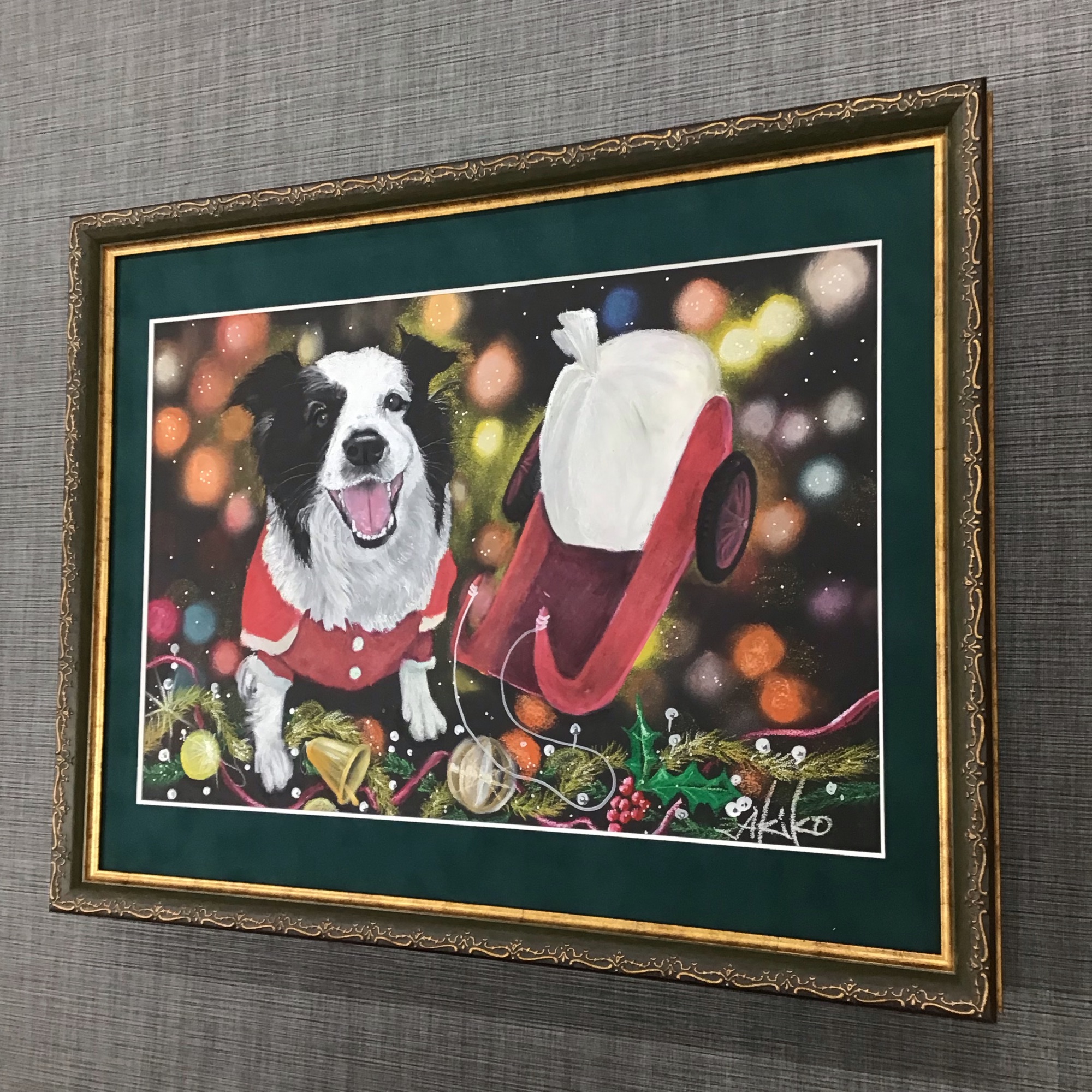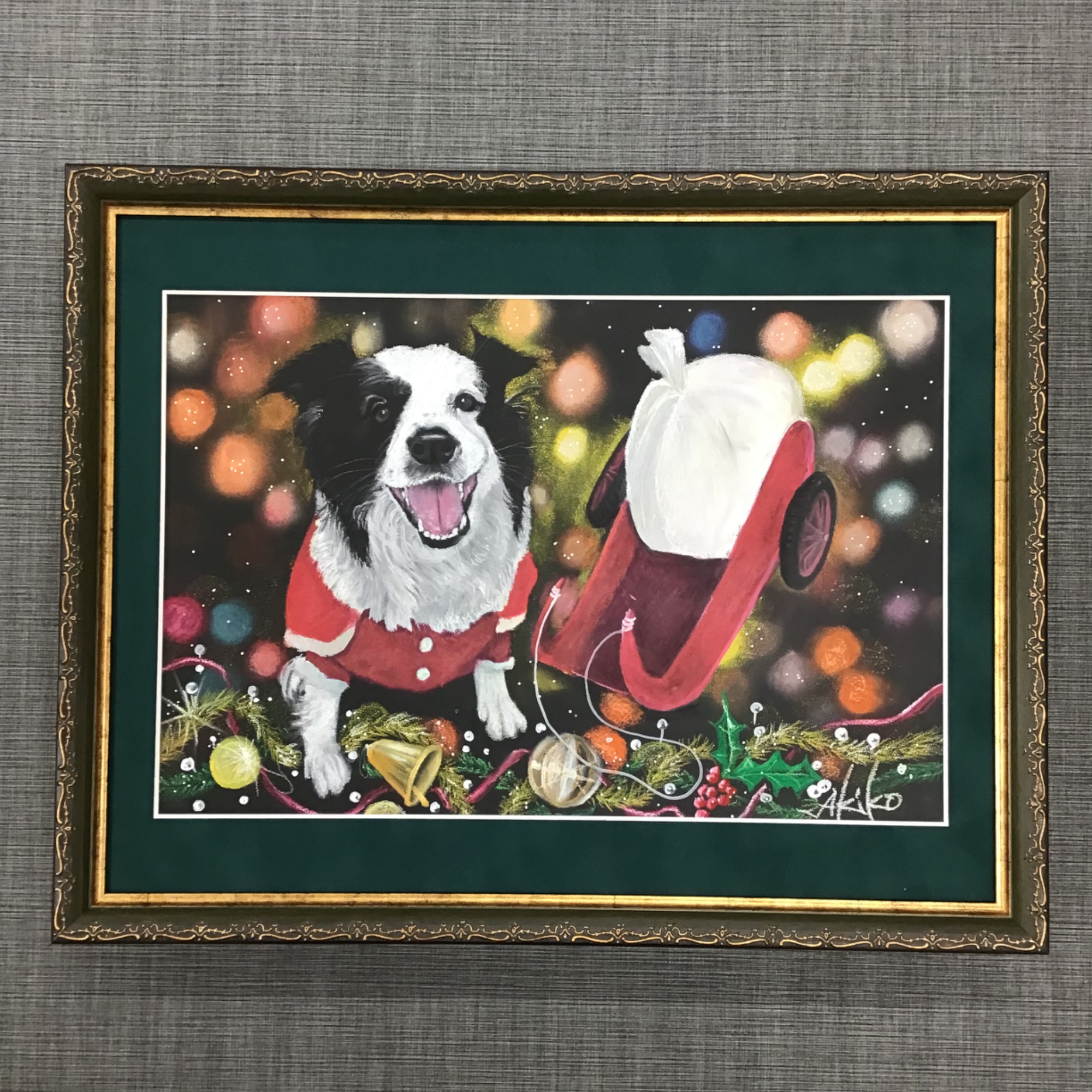 チョークアート作品を額装しました。 黒板アートを中心に活動されている「錦鯉野アキコ」様という作家さんの作品です! 使用したフレームは「8214 グリーン/大衣サイズ」、マットは表面に高級感のある布張りを施した緑色マット「24609 スエード森」です。 描かれているワンちゃんの表情がとても可愛らしく、見ると自然と笑顔になります!