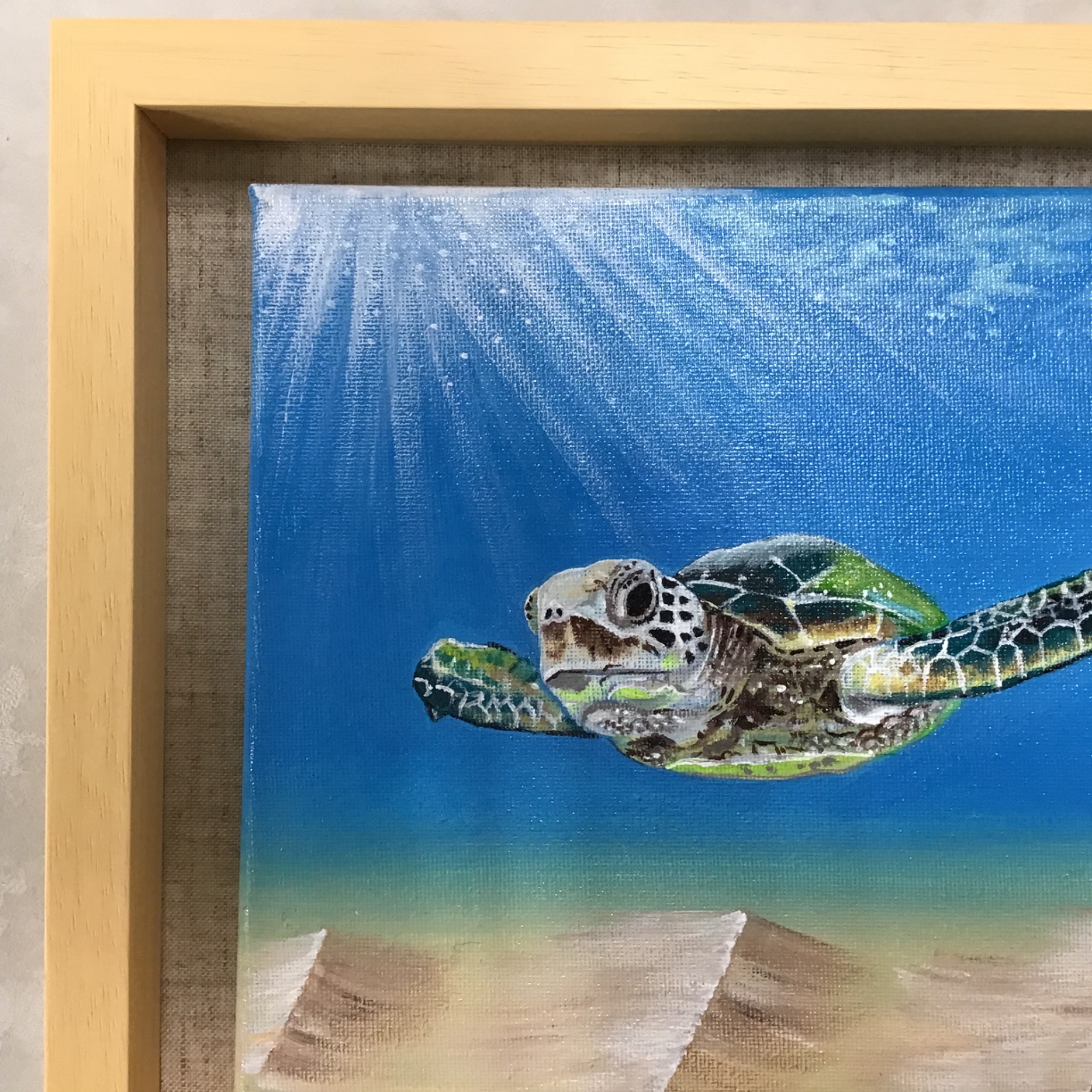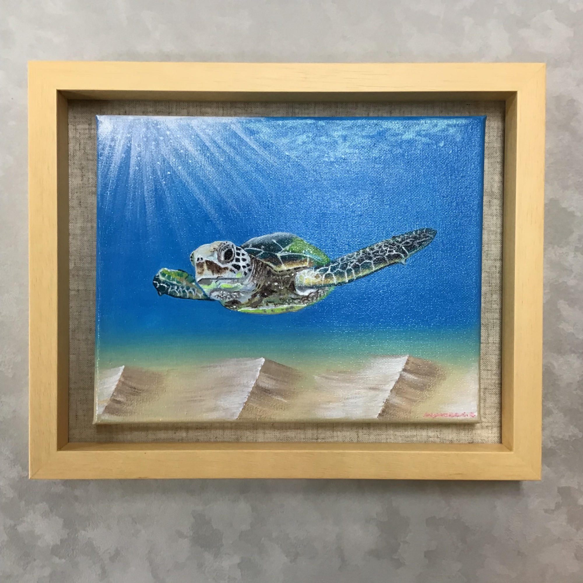 アクリル画を額装しました! 透き通った海の色と射し込む日差し...その中を泳いでいるウミガメはとても気持ちよさそうです🏝 海外旅行中に見つけた露店で購入されたものだそうです。 約200×250mmのキャンバスに描かれた作品...ピッタリ寸法のフレームはなかったので、ひと回り大きい立体額「7916歩 ナチュラル 八ツ」に額装しました! 背景として麻マット(20077)を使用しました。